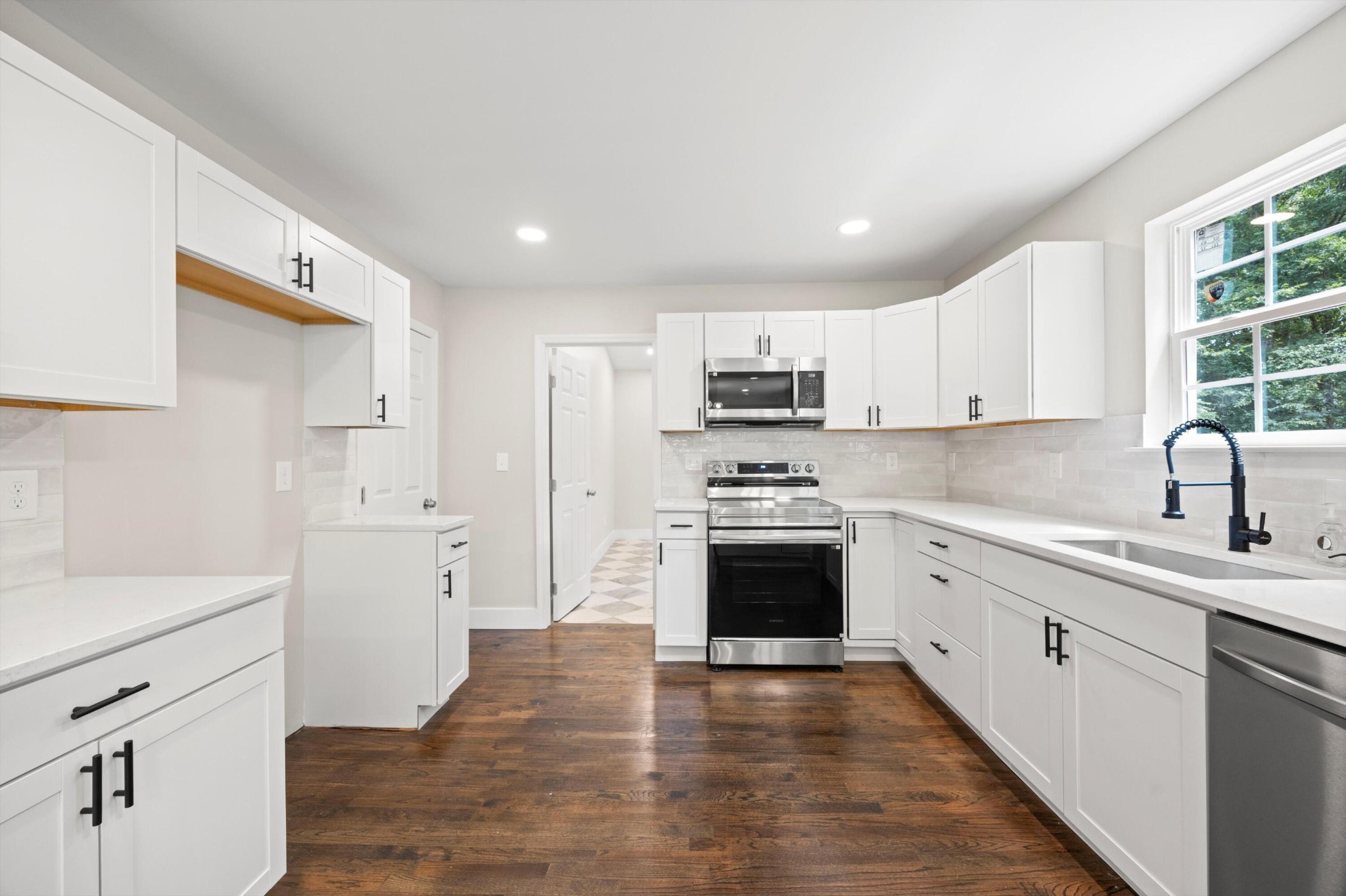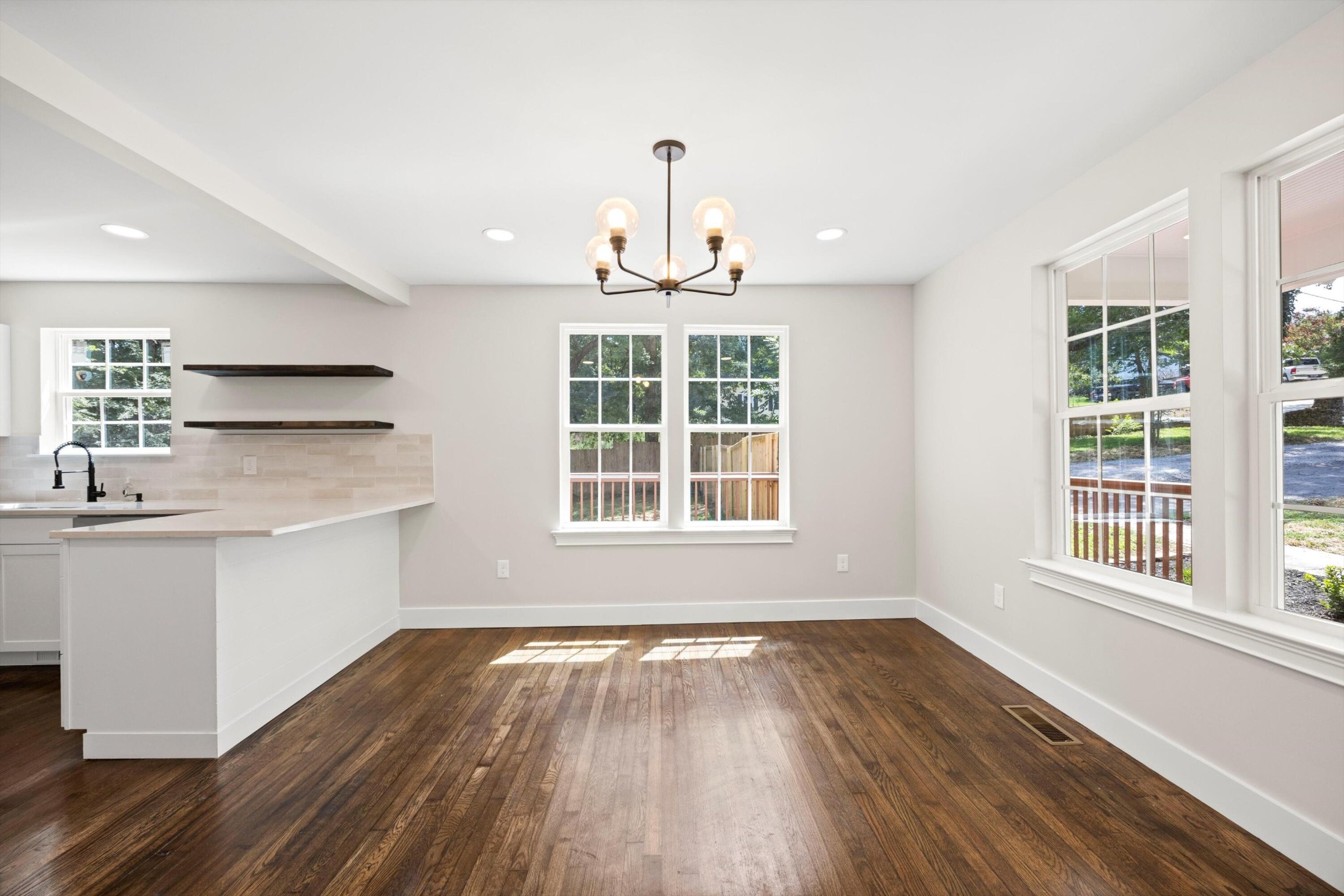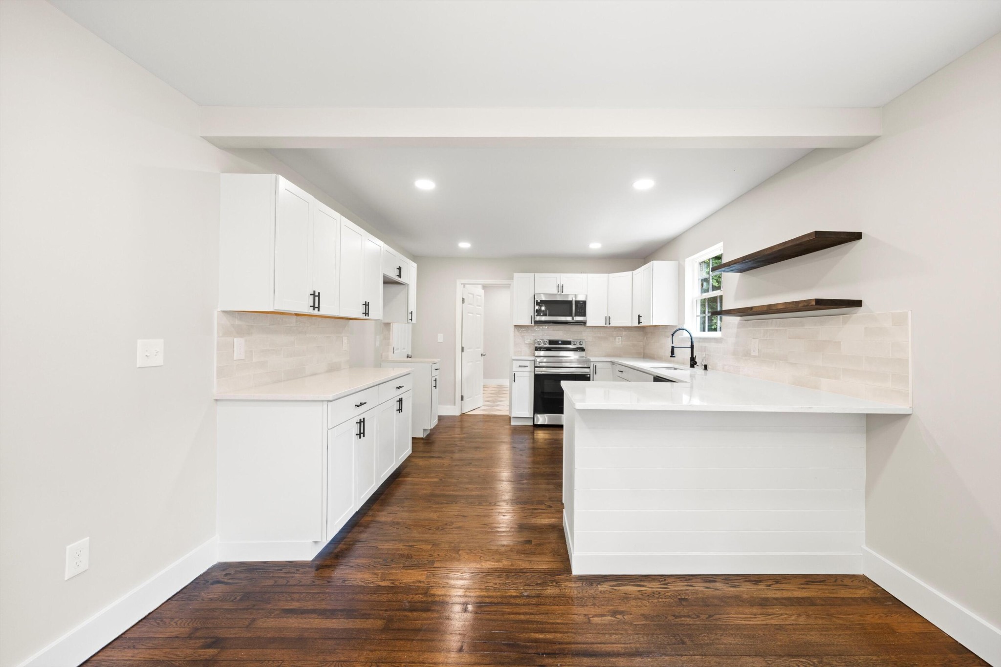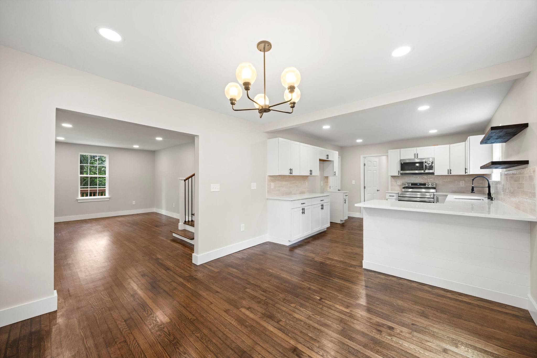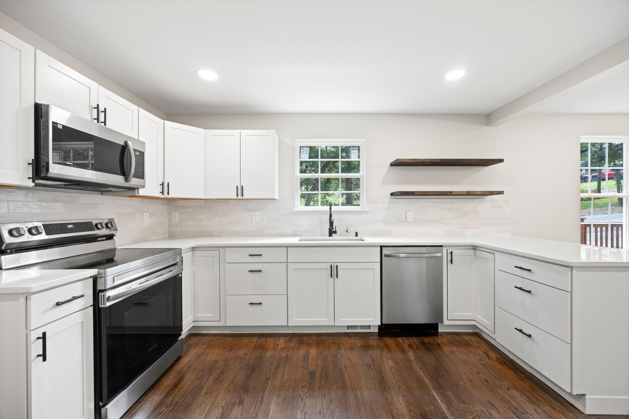 *New cabinets; quartz countertops; New light fixtures; Island/Bar; Floating shelves; Tile backsplash; New stove/oven, dishwasher & microwave.