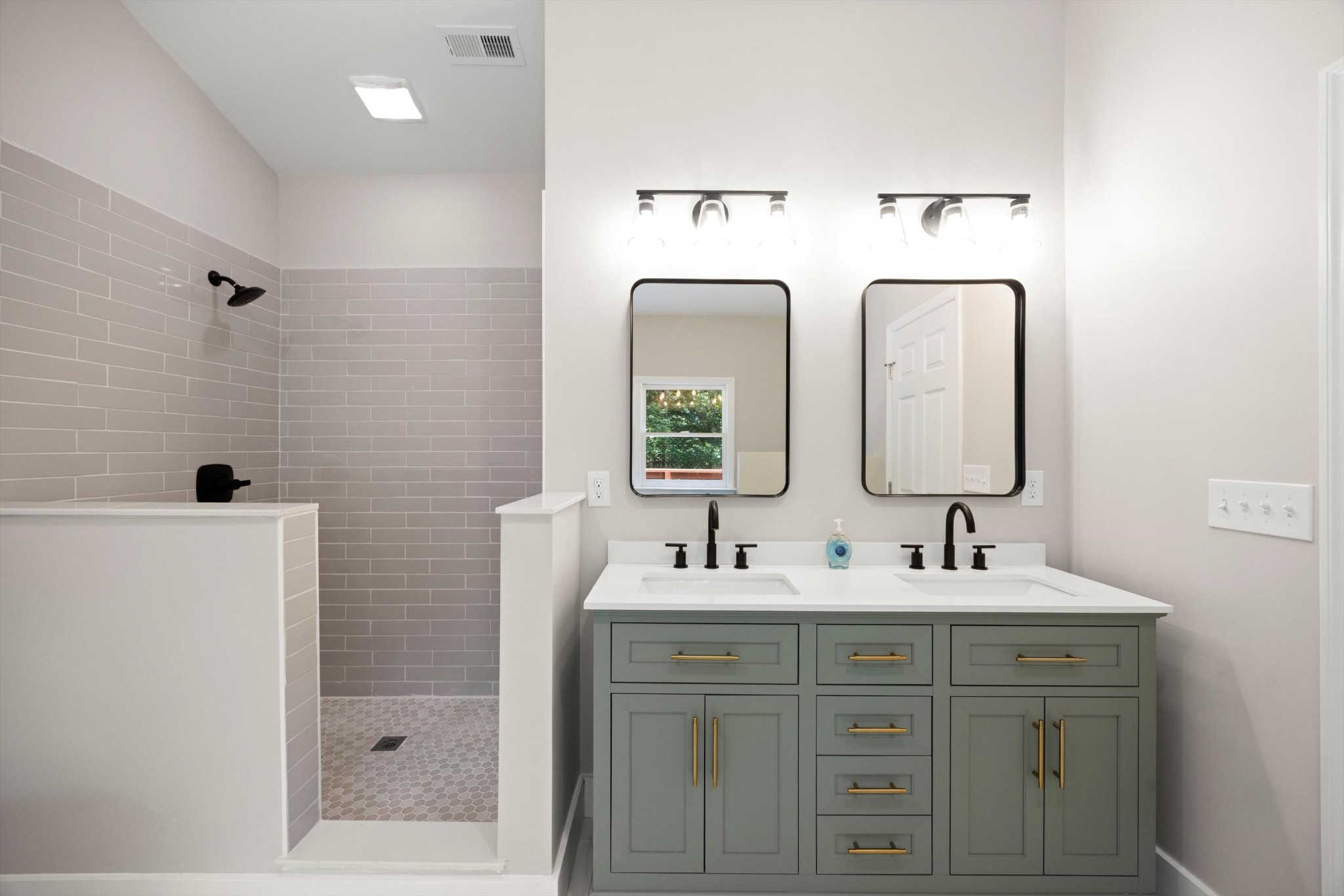 *Double Sink Vanity with granite counter and beautiful mirrors in bathroom;