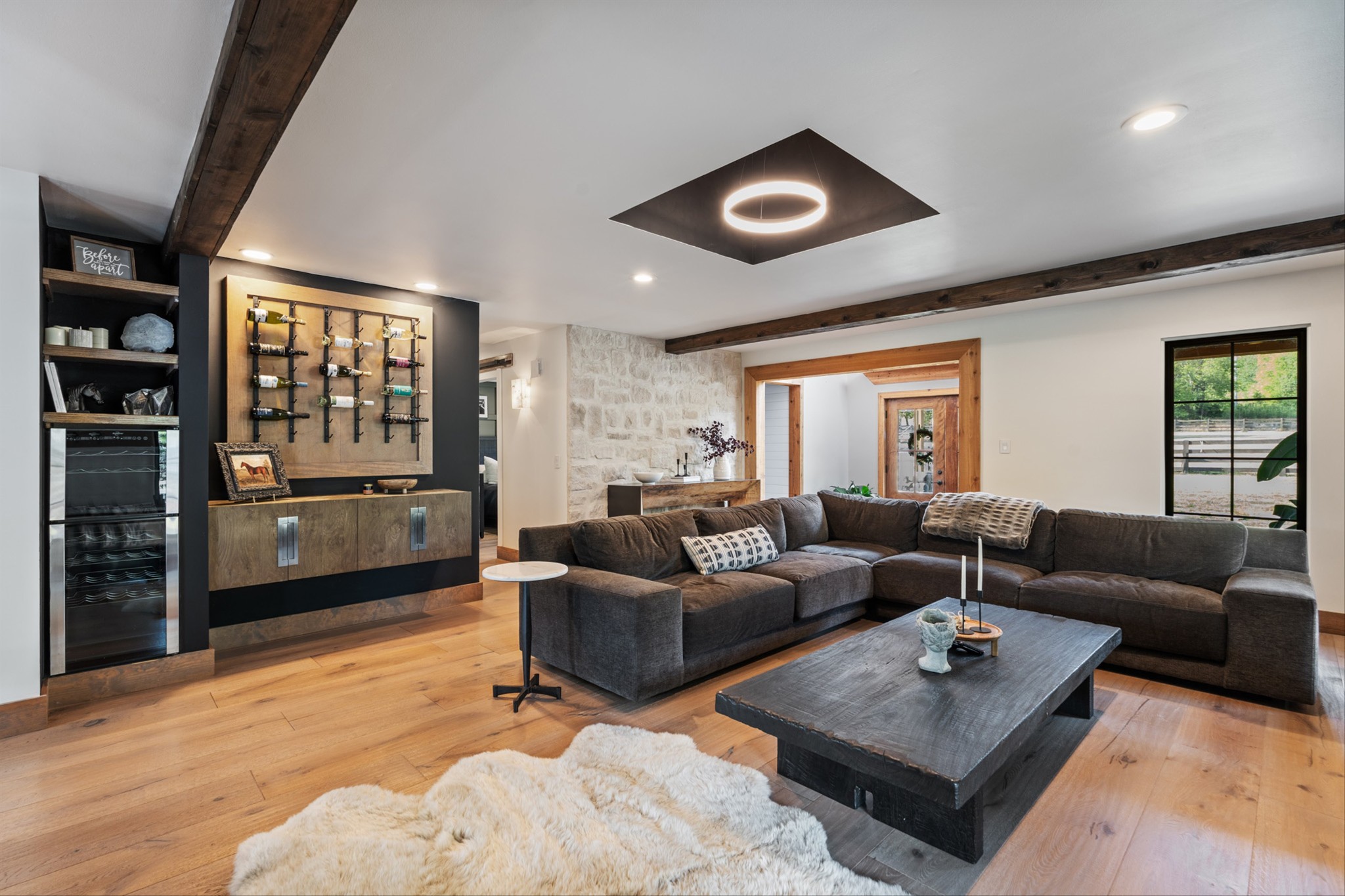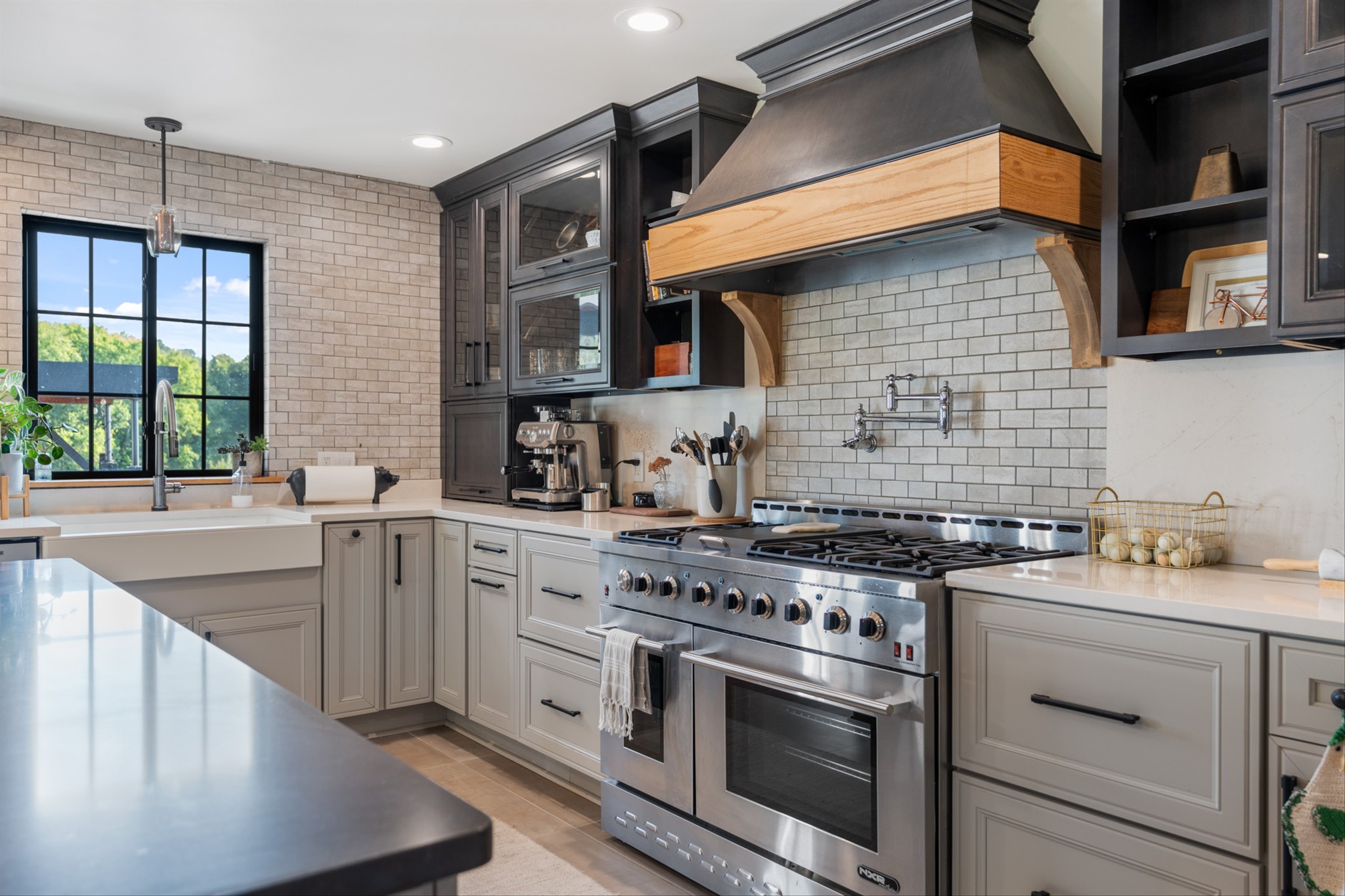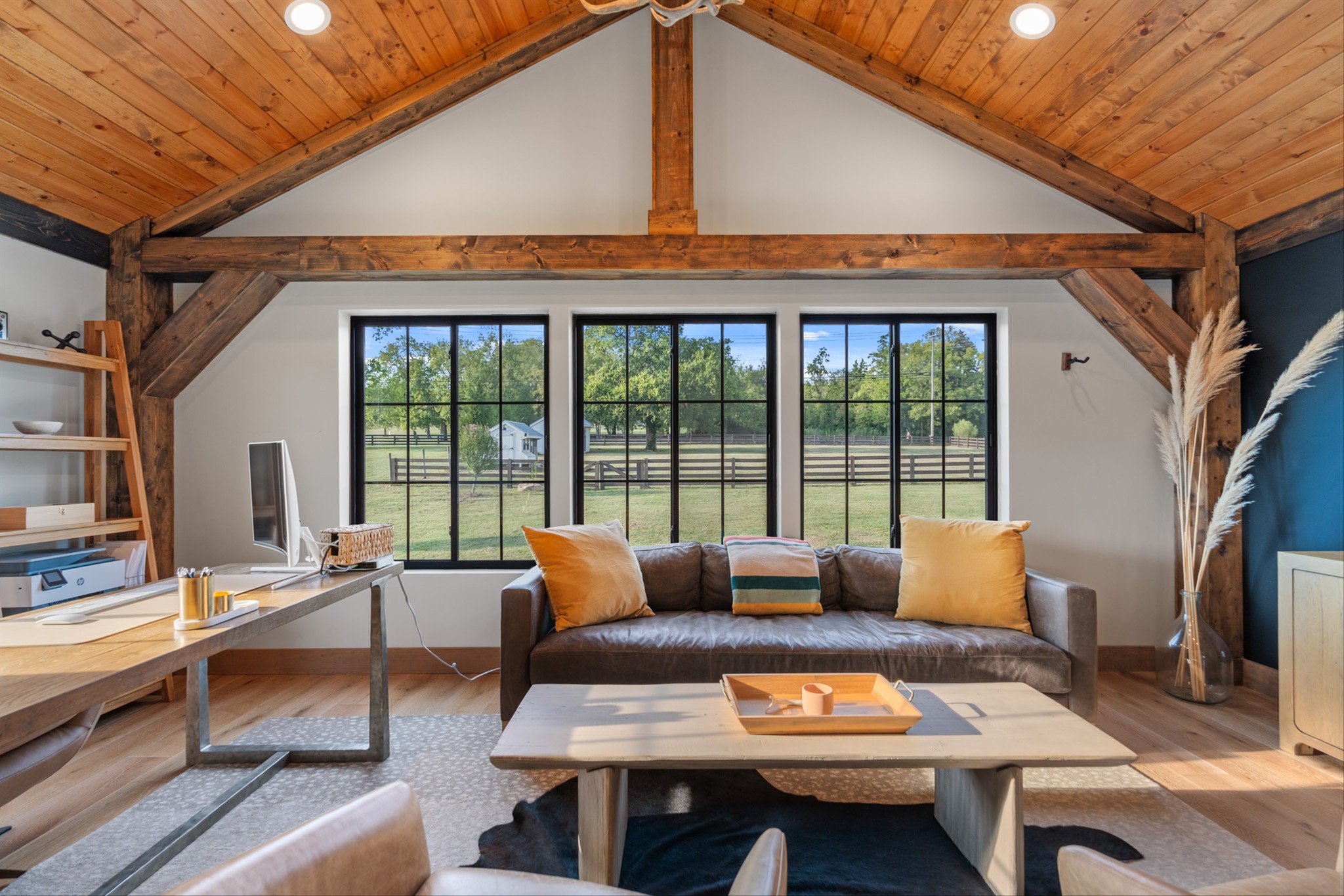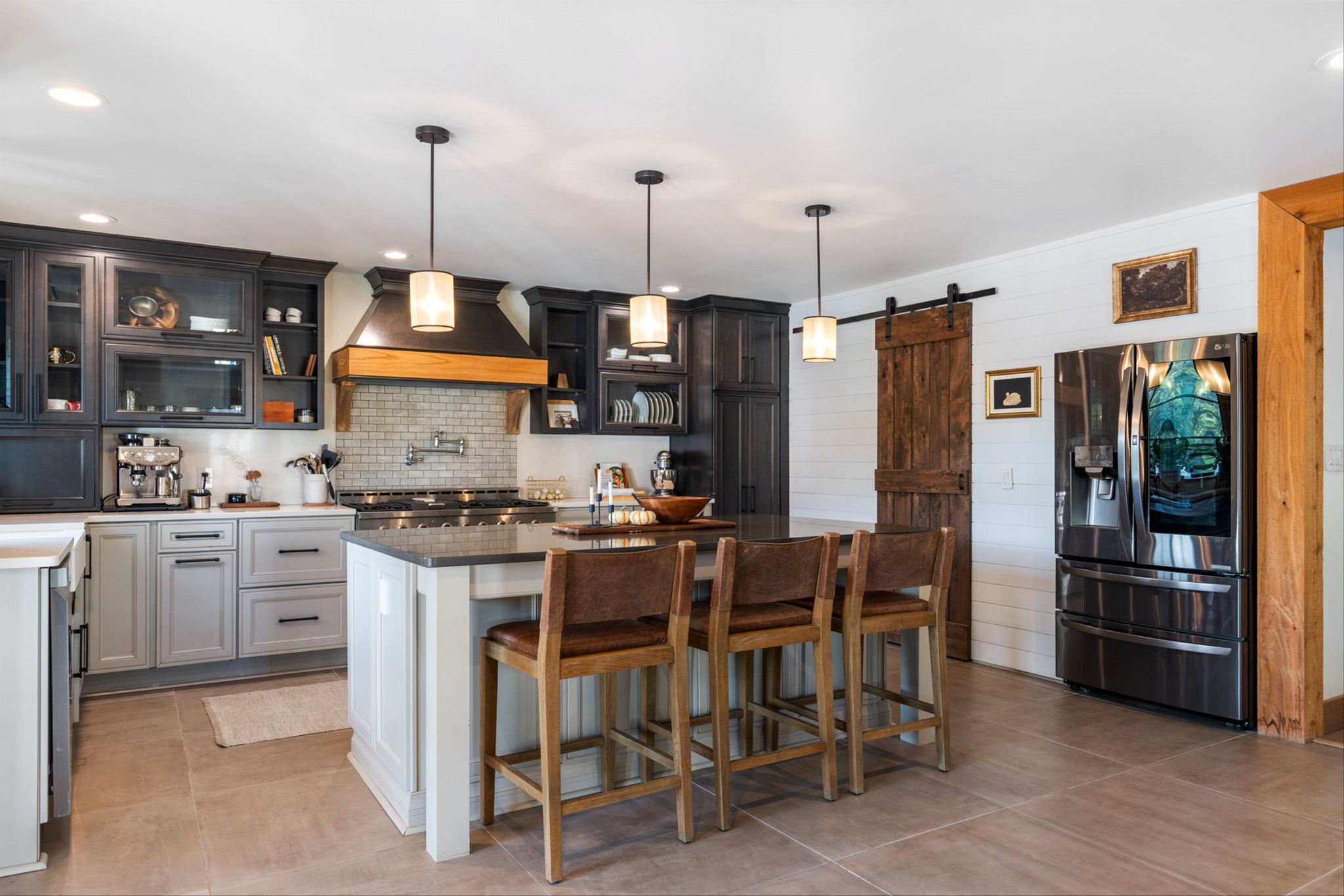 Step inside to a stunning layout featuring a private home gym with custom glass doors that open to the backyard, a separate corporate-style office, and a chef’s kitchen with a 6-burner gas range, custom waterfall coffee bar, and wine bar with dual refrigerators. Cedar accents, two gas fireplaces, and spa-inspired bathrooms with oversized rain-shower retreats add warmth and sophistication throughout.