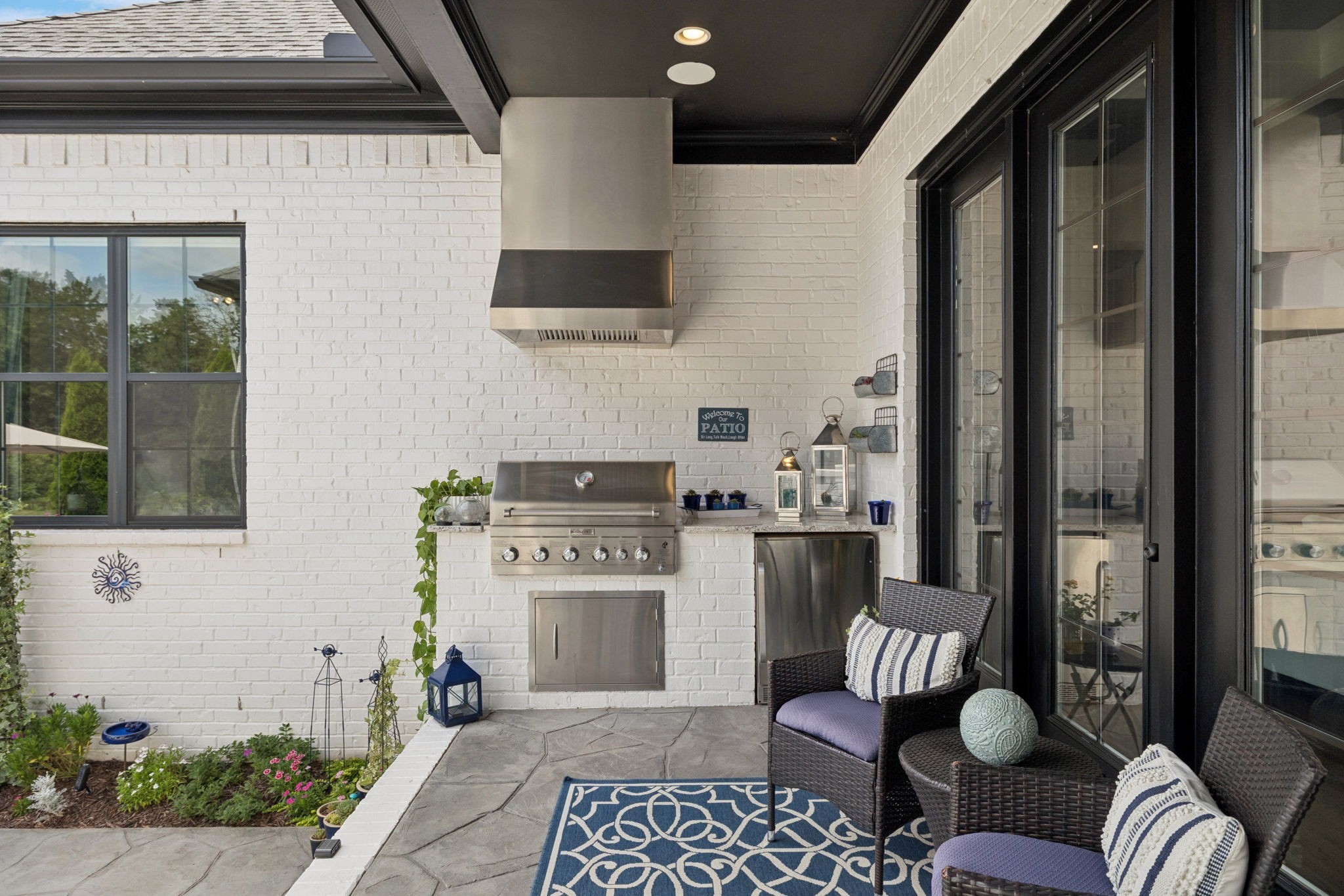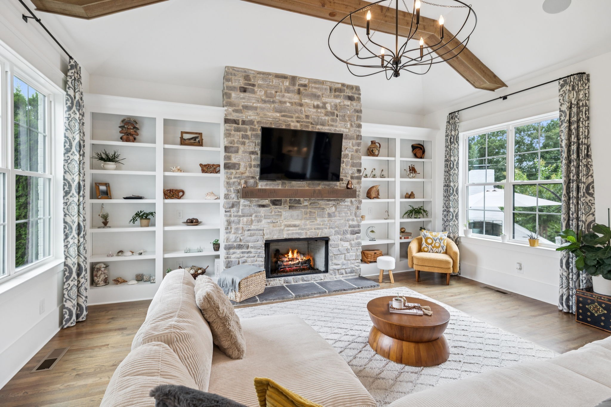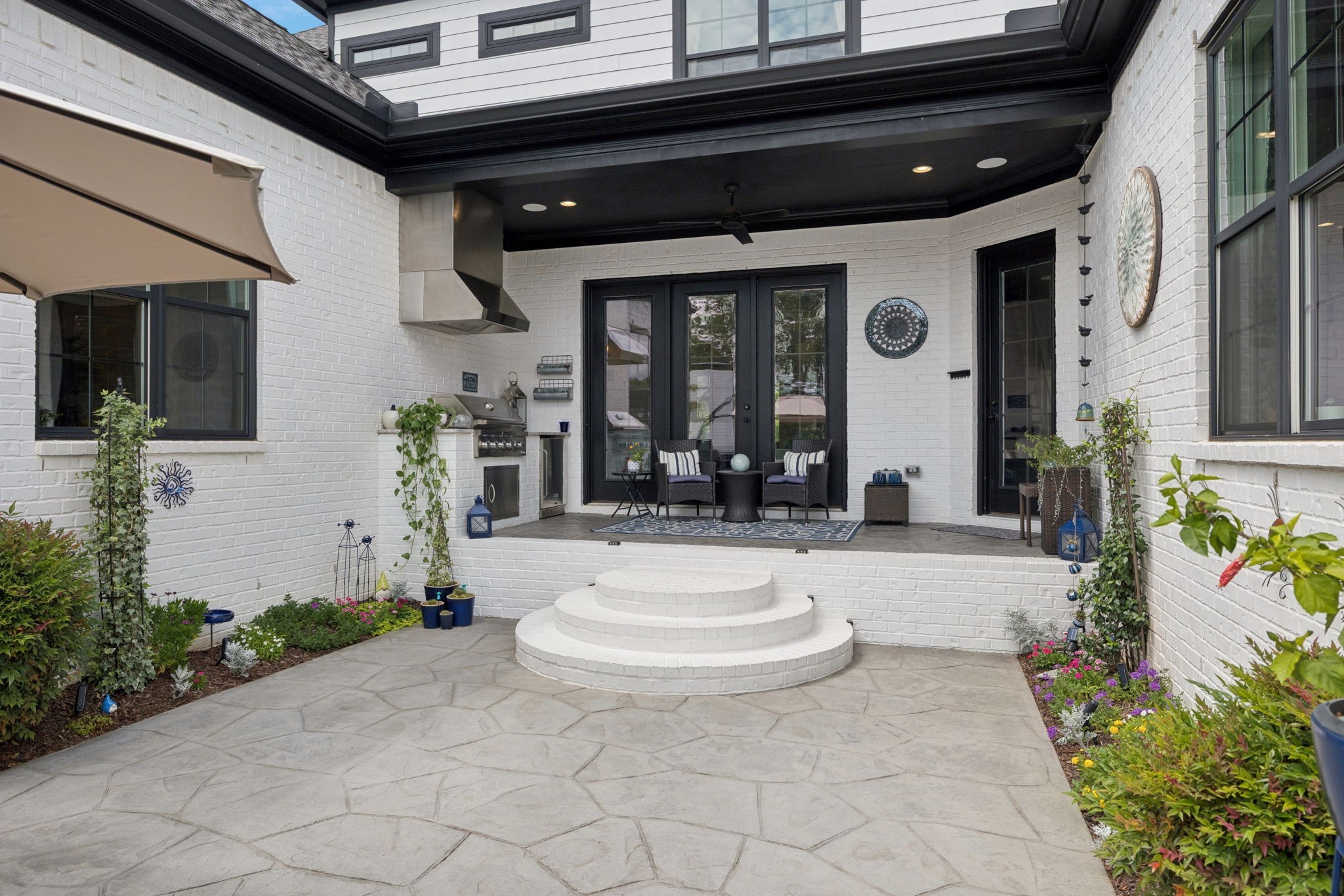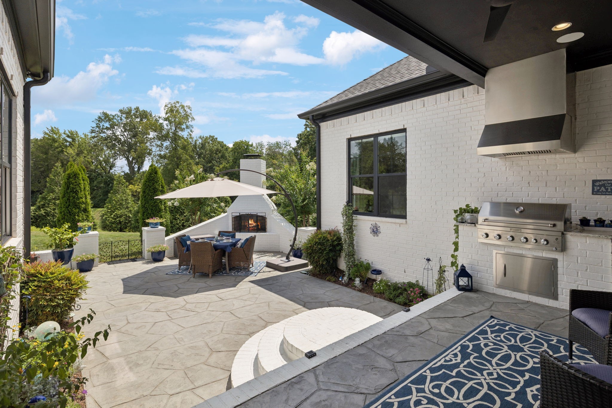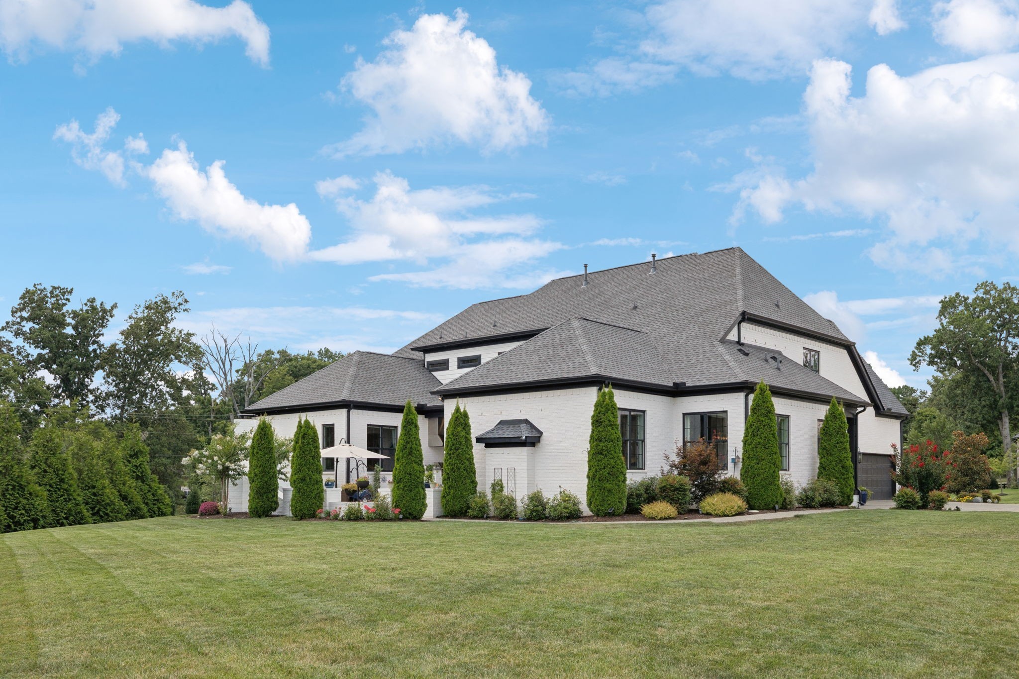 Former Award-Winning "Westchester" Model Home by Turnberry Homes, occupied less than 2 years, is nestled on a private, flat 0.56-acre, pool-sized lot, features over-the-top amenities throughout. From the outdoor living space to the interior details, this residence is perfect for both everyday living & entertaining. Inside, enjoy tall ceilings, 8-foot doors, tall baseboards, crown molding, & wainscoting. Step outside to your private oasis, featuring a covered porch & beautiful courtyard w/ wood-burning fireplace. Front and backyard are fully landscaped & irrigated. The covered porch is complemented by stamped concrete terrace, & outdoor kitchen equipped w/grill, refrigerator, & speakers. Front yard uplighting adds a warm glow. Gourmet kitchen is equipped w/upgraded cabinetry, quartz counters, double wall oven, built-in microwave, & walk-in pantry. Formal dining room showcases wainscoting & flows into the butler's serving bar, complete w/wine storage & wine chiller. The elegant living room boasts a coffered ceiling w/ wood beams, marble surround gas fireplace, & custom built-ins. The great room is equally impressive w/vaulted ceilings, wooden beams, a stone fireplace, & more built-ins. The main-level study w/built-ins, a closet, & full bath, can serve as a 5th bedroom. The primary bedroom is also on the main-level & compliments the primary bath w/ 2 walk-in closets, car wash shower & soaking tub. 3 generously-sized bedrooms upstairs have walk-in closets & ensuites. The massive bonus/media room with large bar features leathered granite, wine chiller, ice maker, & surround sound. Functional & Practical Details include a private friend’s entrance w/ key pad lock, large drop zone w/storage bins, epoxy garage floors, custom window coverings, laundry room w/built-in sink, upper & lower cabinets, & shelves, fire sprinkler system, security system, double staircase, & attic storage. Located in highly sought after Williamson County School District, in premier Neighborhood.