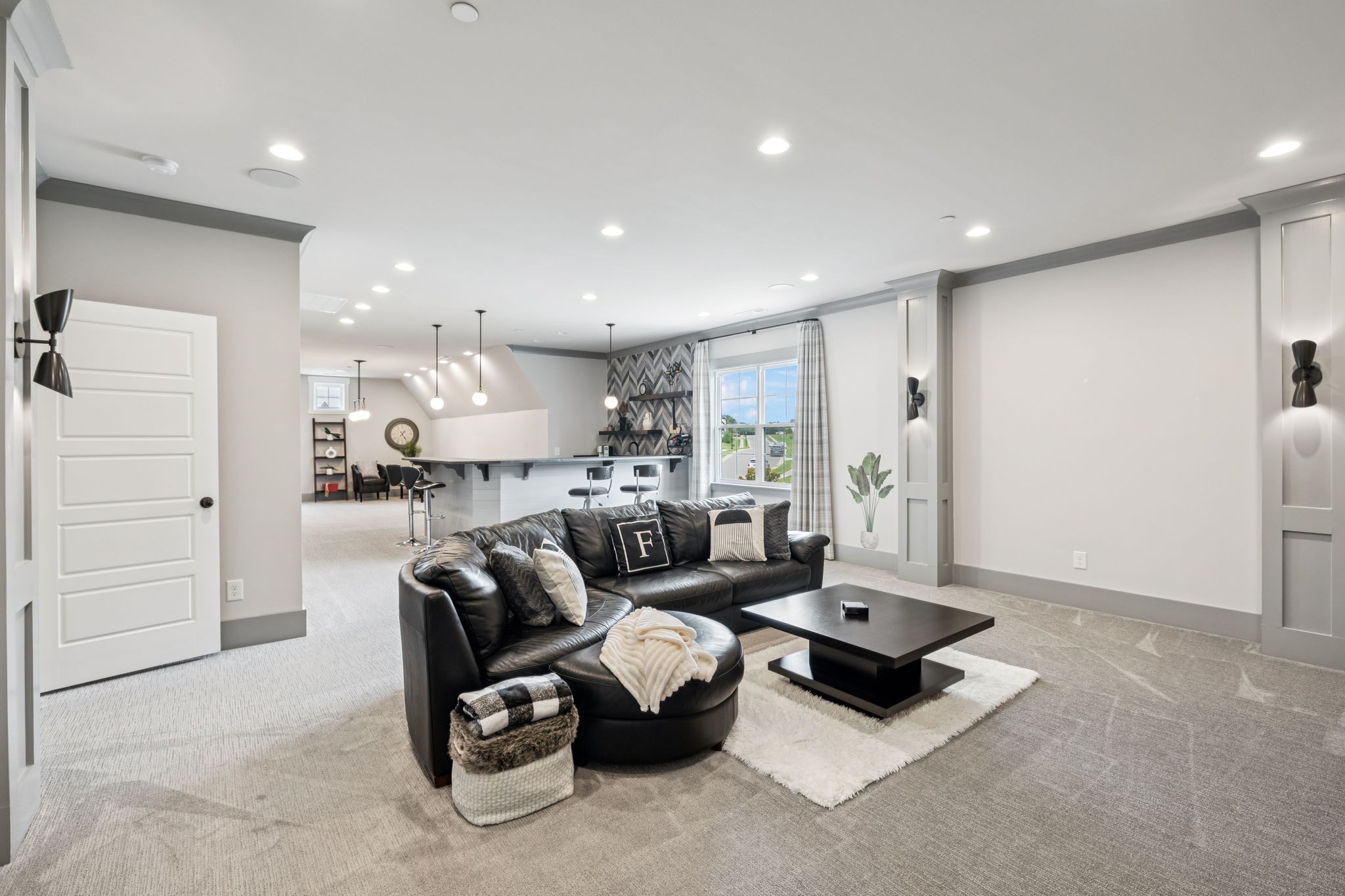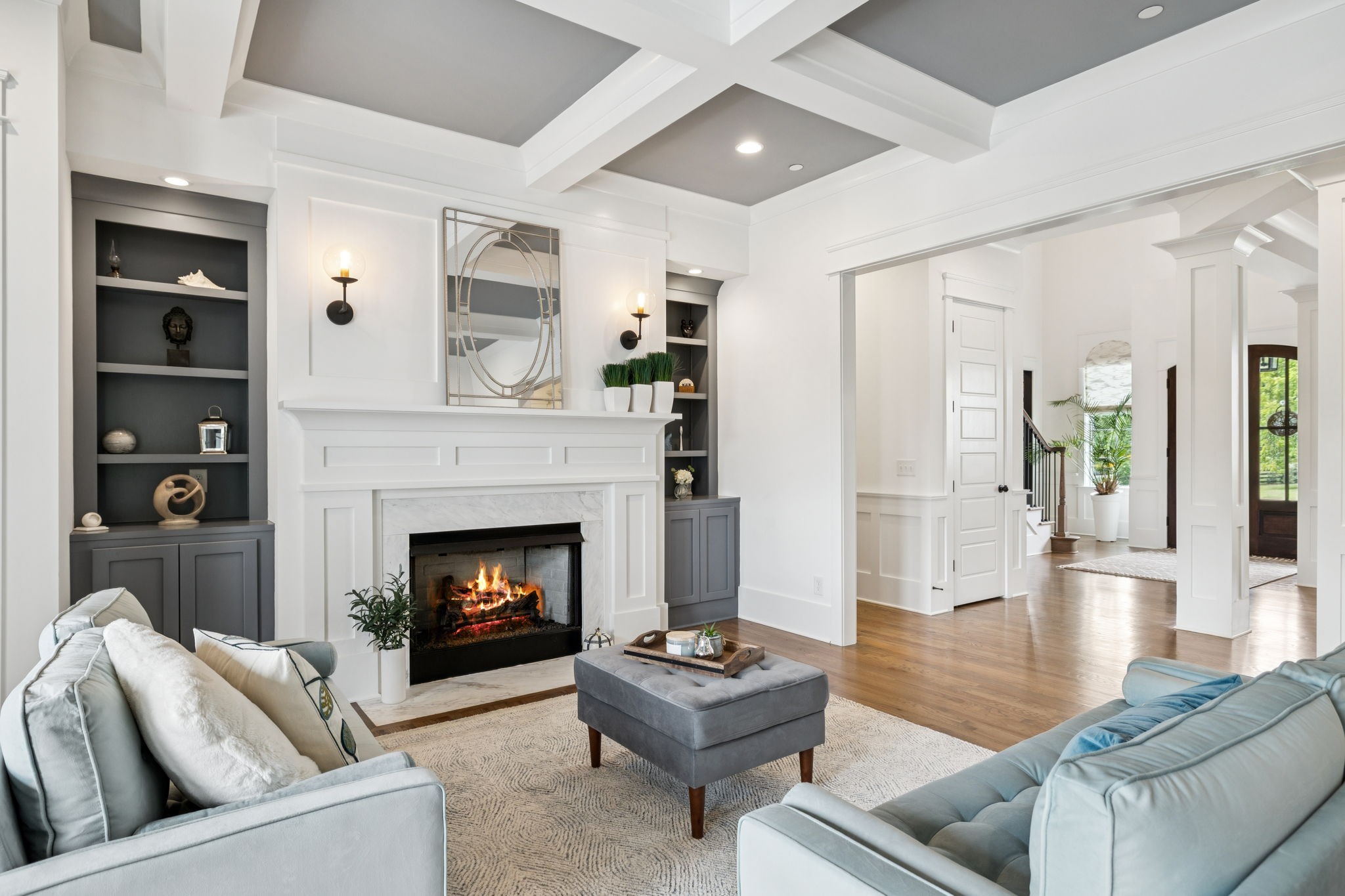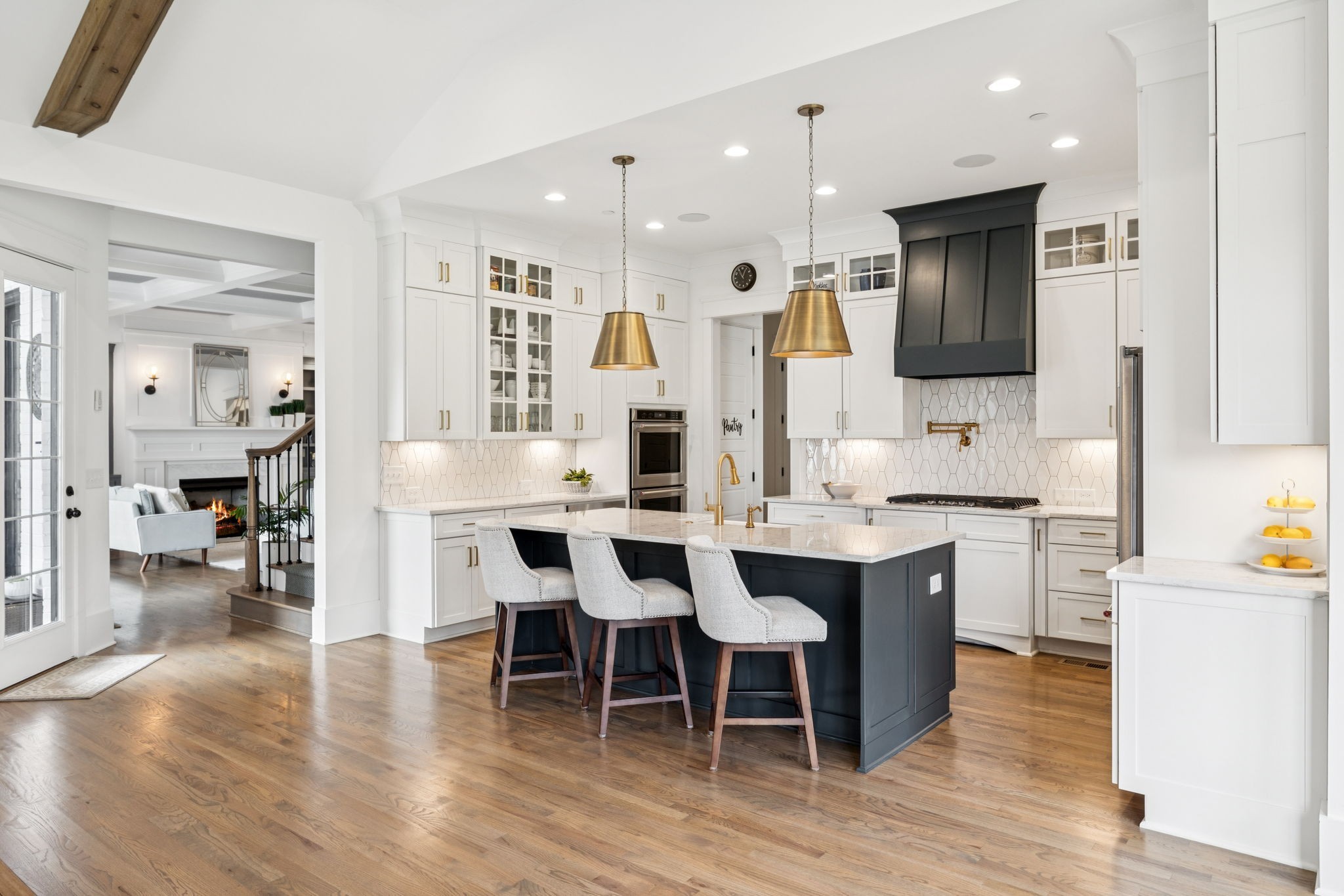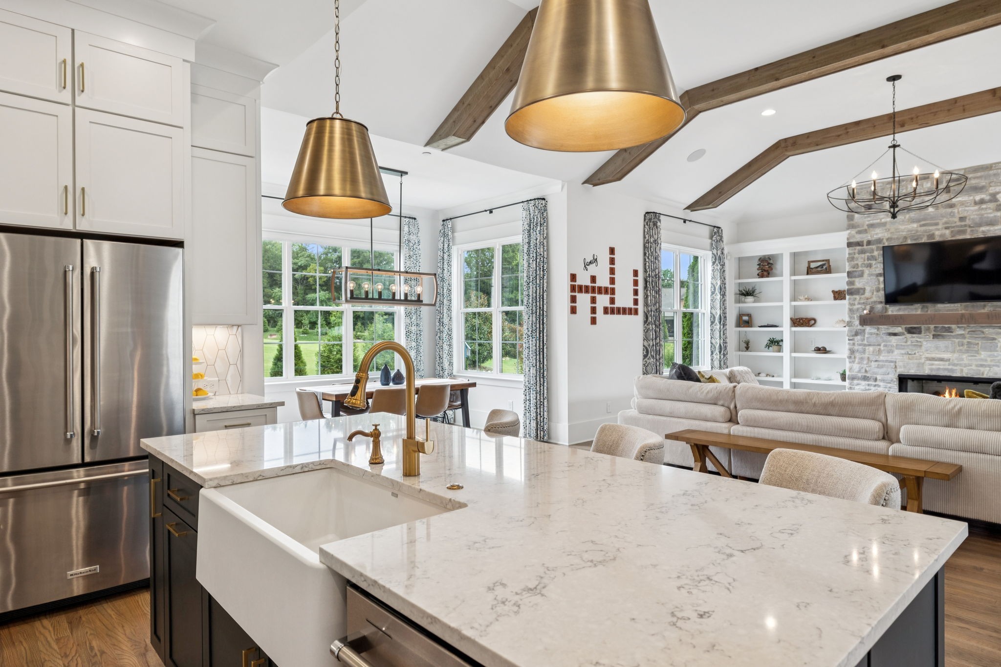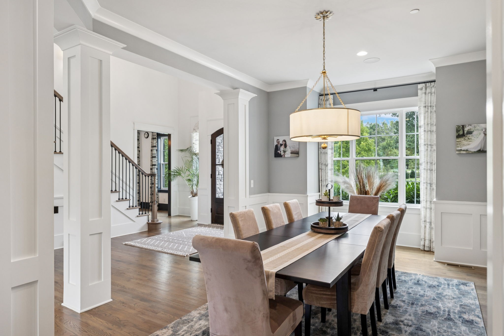 Former Award-Winning "Westchester" Model Home by Turnberry Homes, occupied less than 2 years, is nestled on a private, flat 0.56-acre, pool-sized lot, features over-the-top amenities throughout. From the outdoor living space to the interior details, this residence is perfect for both everyday living & entertaining. Inside, enjoy tall ceilings, 8-foot doors, tall baseboards, crown molding, & wainscoting. Step outside to your private oasis, featuring a covered porch & beautiful courtyard w/ wood-burning fireplace. Front and backyard are fully landscaped & irrigated. The covered porch is complemented by stamped concrete terrace, & outdoor kitchen equipped w/grill, refrigerator, & speakers. Front yard uplighting adds a warm glow. Gourmet kitchen is equipped w/upgraded cabinetry, quartz counters, double wall oven, built-in microwave, & walk-in pantry. Formal dining room showcases wainscoting & flows into the butler's serving bar, complete w/wine storage & wine chiller. The elegant living room boasts a coffered ceiling w/ wood beams, marble surround gas fireplace, & custom built-ins. The great room is equally impressive w/vaulted ceilings, wooden beams, a stone fireplace, & more built-ins. The main-level study w/built-ins, a closet, & full bath, can serve as a 5th bedroom. The primary bedroom is also on the main-level & compliments the primary bath w/ 2 walk-in closets, car wash shower & soaking tub. 3 generously-sized bedrooms upstairs have walk-in closets & ensuites. The massive bonus/media room with large bar features leathered granite, wine chiller, ice maker, & surround sound. Functional & Practical Details include a private friend’s entrance w/ key pad lock, large drop zone w/storage bins, epoxy garage floors, custom window coverings, laundry room w/built-in sink, upper & lower cabinets, & shelves, fire sprinkler system, security system, double staircase, & attic storage. Located in highly sought after Williamson County School District, in premier Neighborhood.