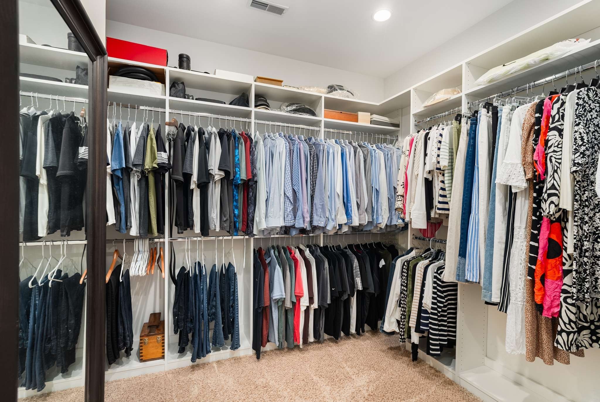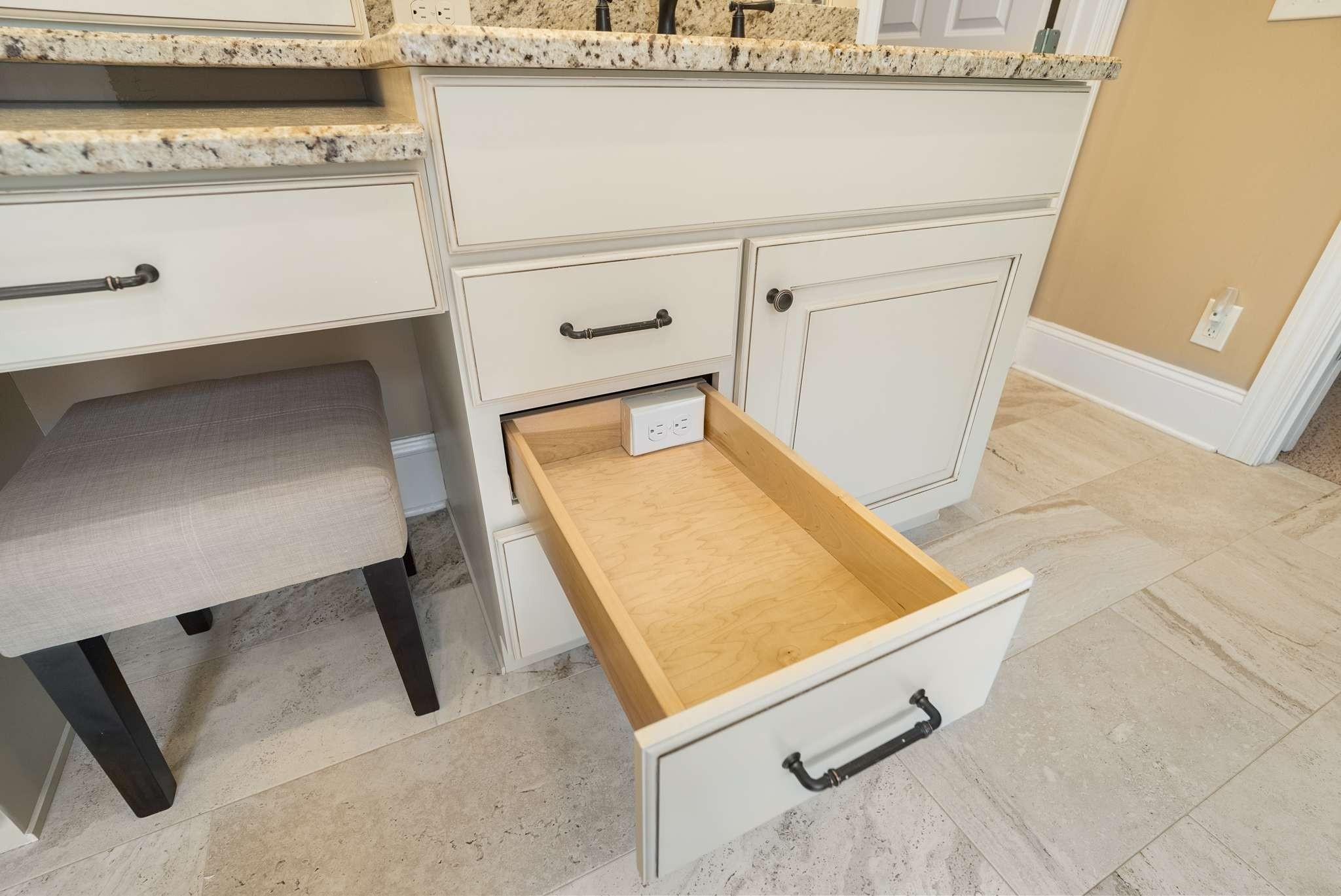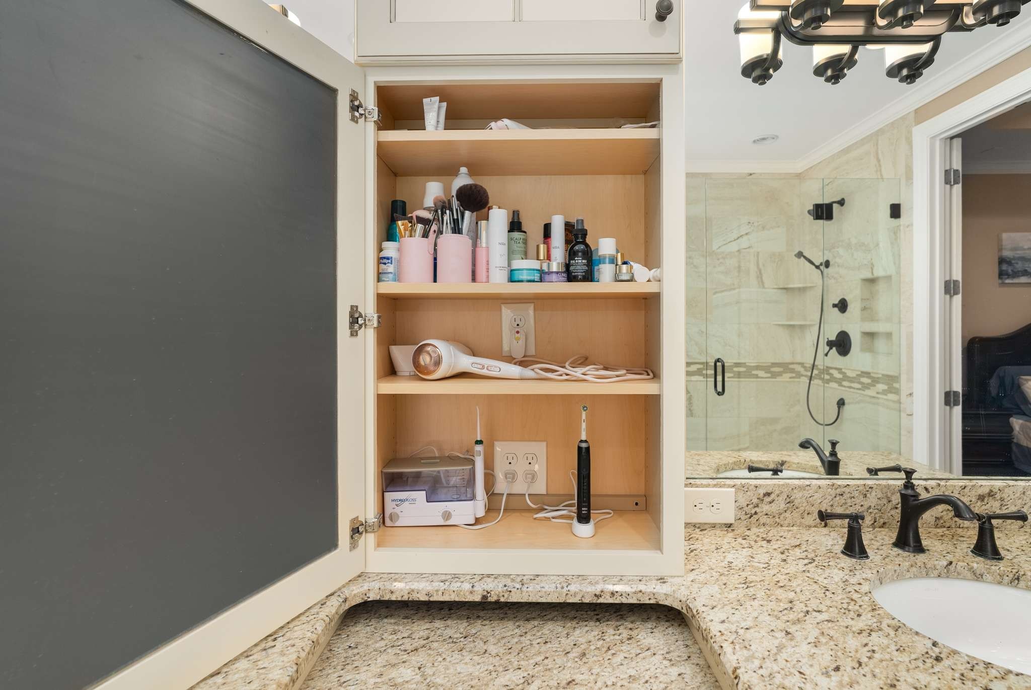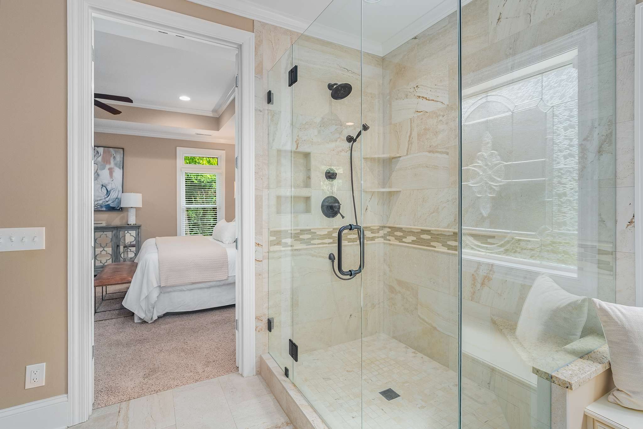 The primary suite offers a luxurious retreat with a fully renovated en-suite bathroom featuring custom cabinetry, granite countertops, designer tile, and a custom-built closet system. One additional downstairs bedroom also includes its own private bath, ideal for guests or multi-generational living.