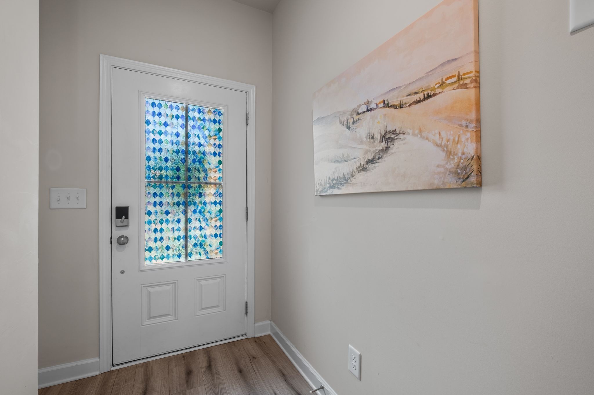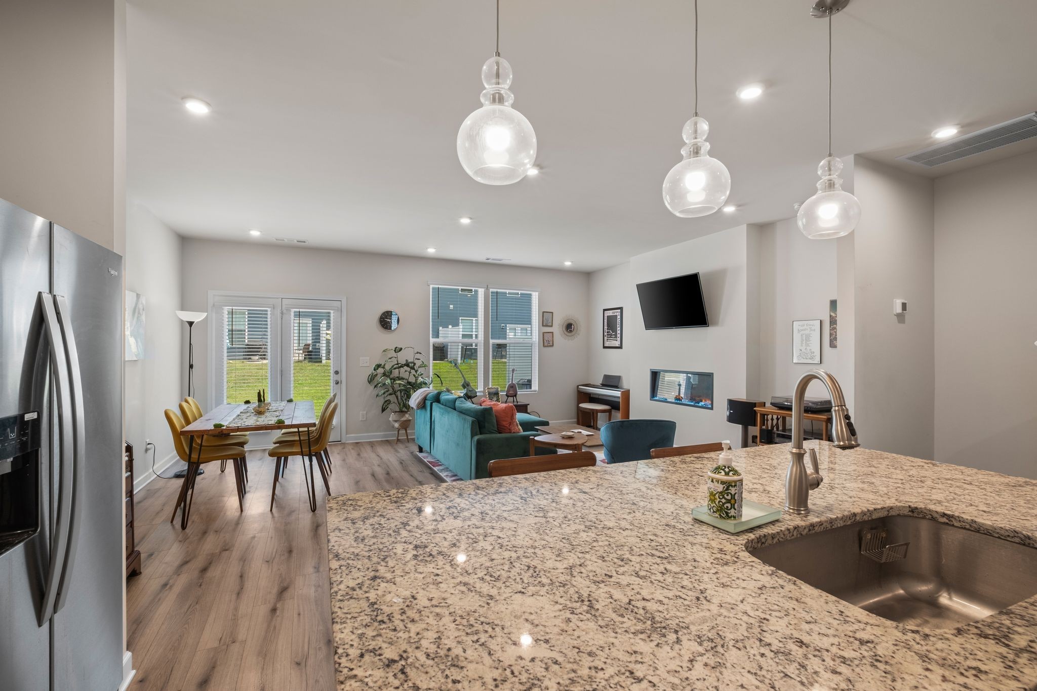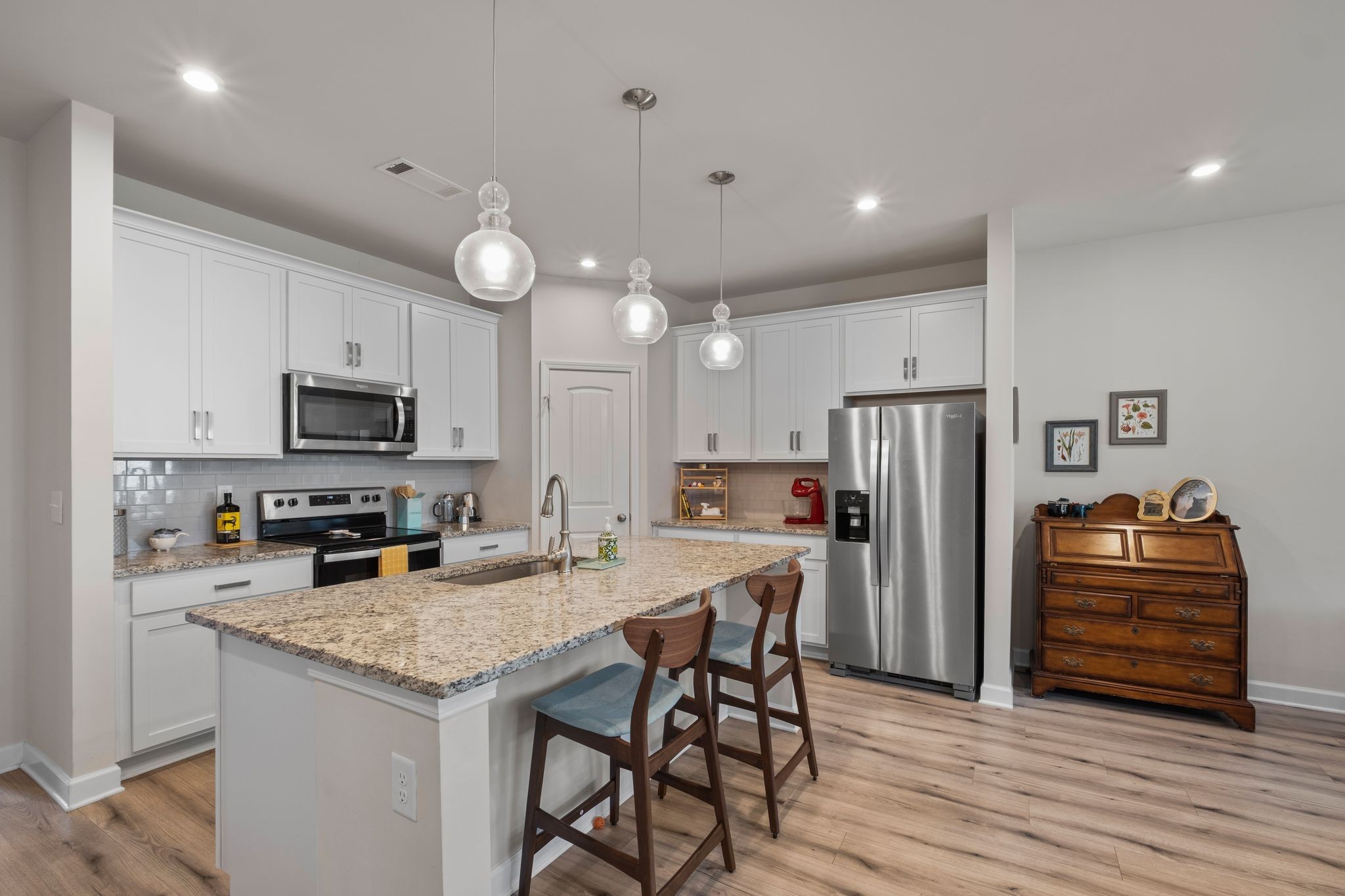 This well-maintained home features wood-look laminate flooring in the main living areas, upgraded lighting, and modern brushed nickel fixtures. The stylish kitchen boasts white shaker-style cabinets, granite countertops, a tiled backsplash, stainless steel appliances, and a spacious walk-in pantry. Enjoy cozy evenings by the electric fireplace or relax on the large back patio, which includes a partial privacy fence.