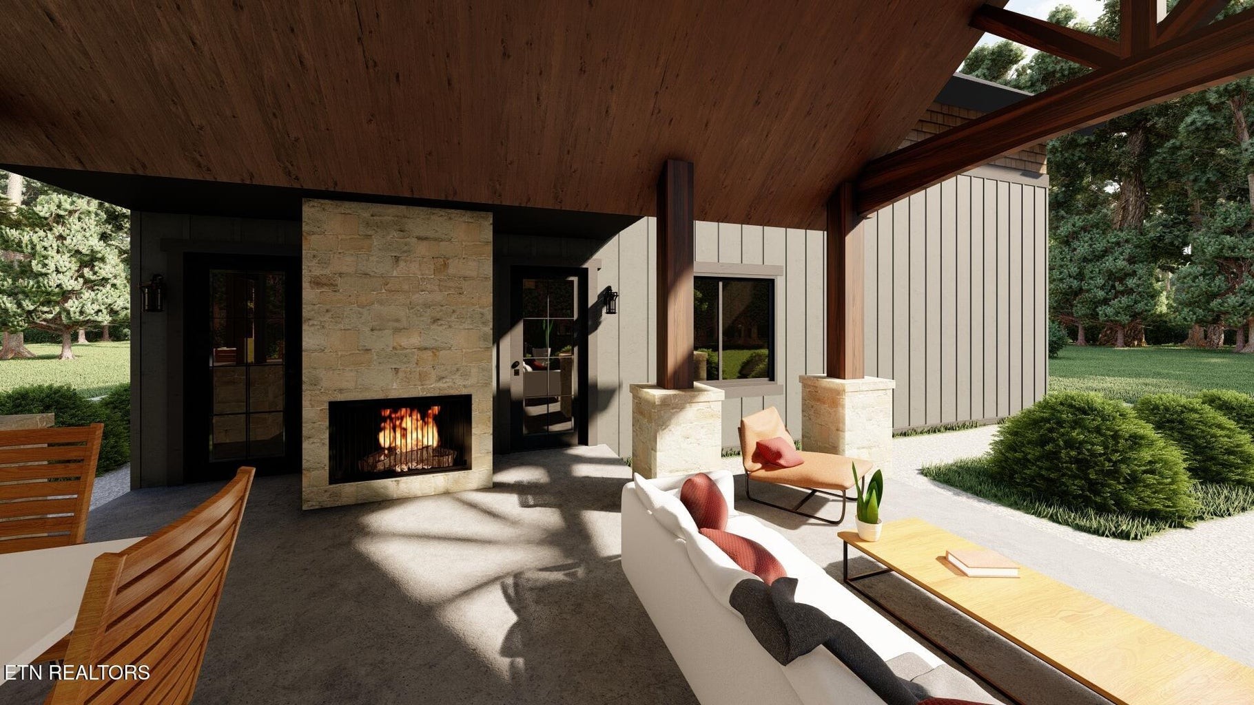 Inside, soaring ceilings, an open layout, and expansive windows fill the home with natural light. The chef’s kitchen features custom cabinetry, premium appliances, and a spacious island that flows seamlessly into the dining and living areas. Just beyond, a covered patio invites al fresco dining and peaceful mornings in the mountain air.