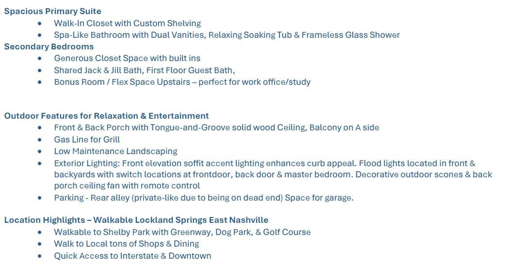 WOW ! Lockland Springs - This premier location offers unbeatable walkability to neighborhood best dining & shops, miles of Greenway & close to downtown. With a striking presence and a sense of grandeur, this home exceeds expectations the moment you walk in. The 10-foot ceiling create an open feel, off the foyer, the spacious dining area opens into a designer-inspired kitchen - Gather in the heart of the home, featuring an oversized island, a dedicated wet bar, walk-in pantry, and abundant cabinetry for storage. Ideal for both everyday living and entertaining! The gas fireplace anchors the sun-filled living area, framed by large windows and French doors leading to a covered porch. Out back, you’ll find a permanent gas hookup for grilling and an intimate, low-maintenance yard—perfect for relaxing or extending your living space with a future deck, dipping pool or courtyard. Upstairs, a central loft offers flexible space for a second living area or home office. The primary suite includes oversized windows, a large walk-in closet, and a spa bath with soaking tub for 2, marble-tiled shower, and dual vanities. Bedrooms 2 and 3 share a generous Jack-and-Jill bath with double sinks. A spiral staircase leads to a fully customizable rooftop deck w/ gas heater hookup, dedicated electrical for a hot tub, and reinforced framing to support one.