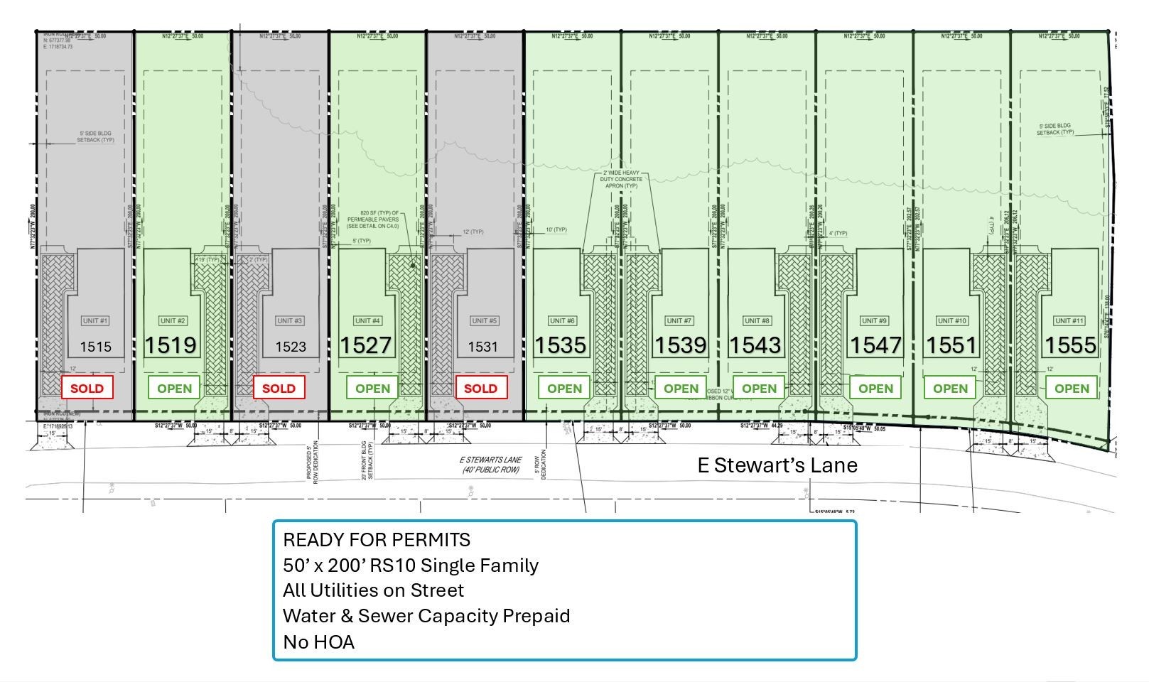 Builders & Investors - Ready for Permits! SITE PLAN IN DOCUMENTS 50’ x 200’ RS10 single-family. with Water/sewer capacity prepaid, all utilities are on the street, & electric is overhead. No HOA fees, and no required curbs or sidewalks! Situated on a charming, peaceful street with established new builds. Just 10 minutes from Downtown and 1 exit up from The Nations. In one of the city's fastest-growing areas with abundant new developments. Enjoy PRIVACY with spacious backyards 110 feet deep from back of house. There are 7 lots available, Lot 6-11 to sell in pairs. SEE DOCUMENTS ATTACHED