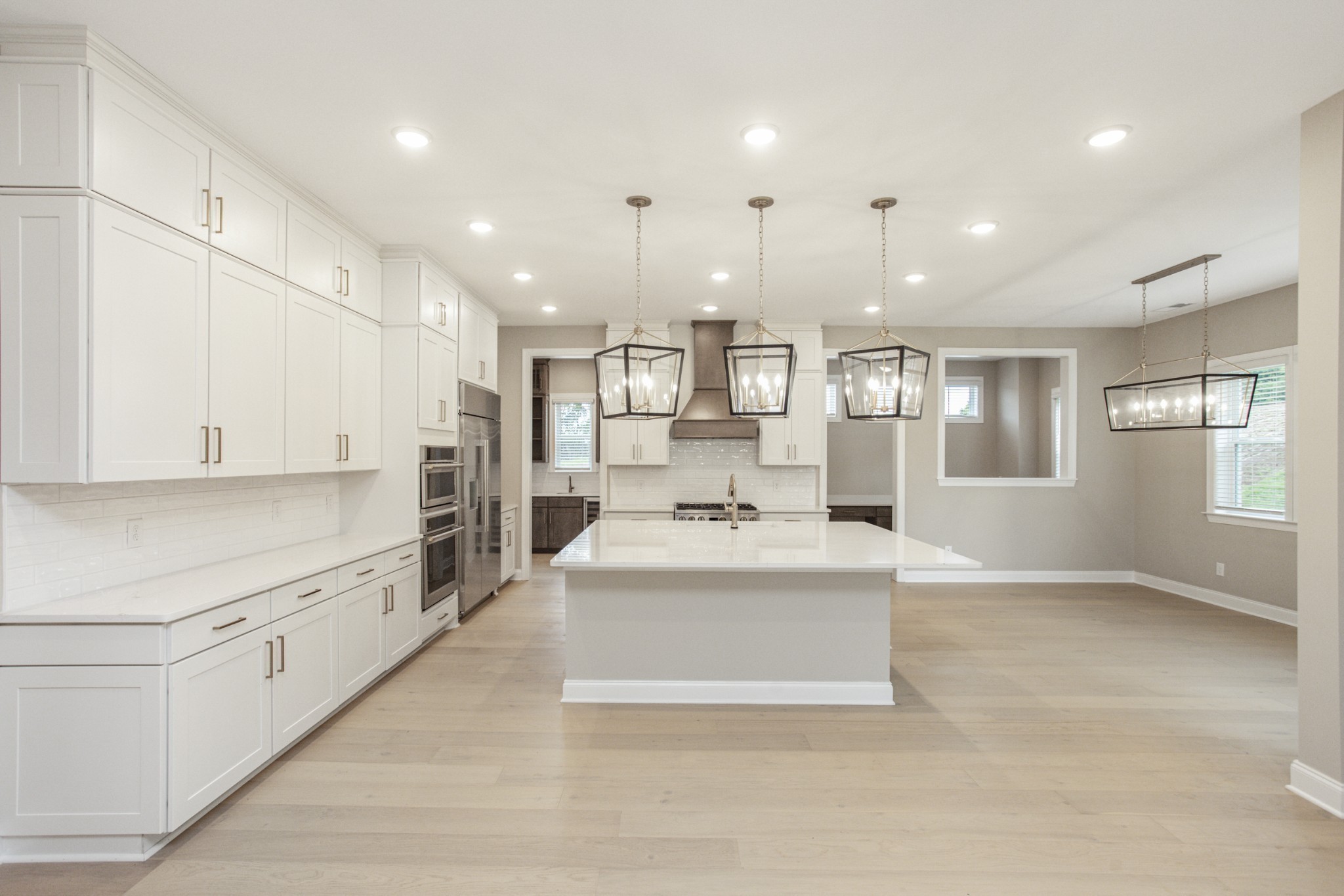 The gourmet kitchen is a chef’s dream, featuring a large center island, walk-in pantry, and premium finishes throughout. An adjacent breakfast nook opens to a covered patio, ideal for entertaining guests or enjoying quiet mornings outdoors.