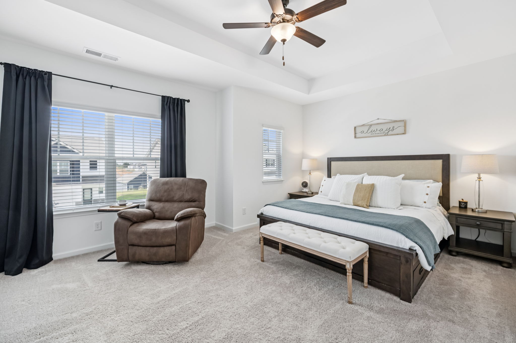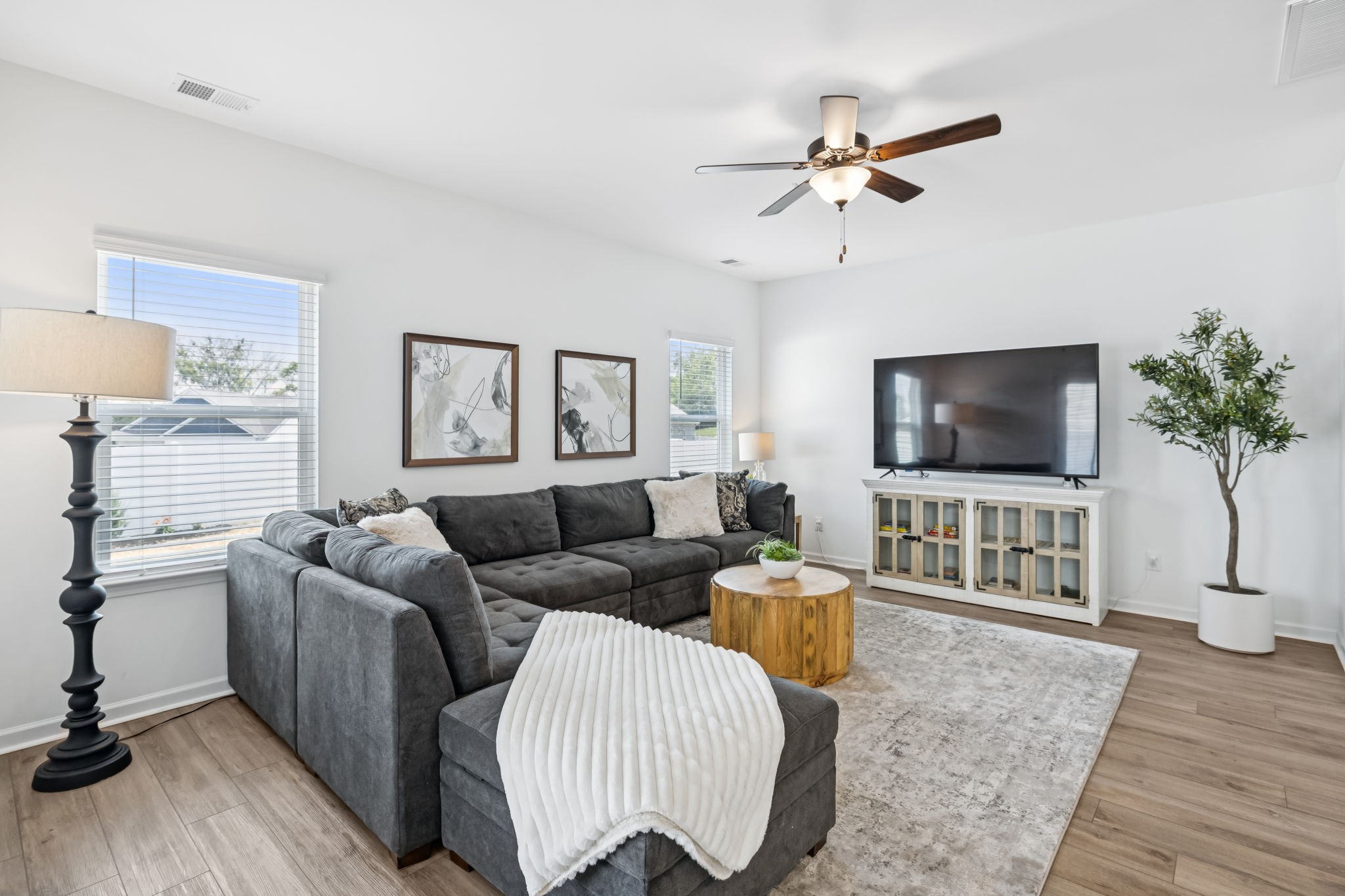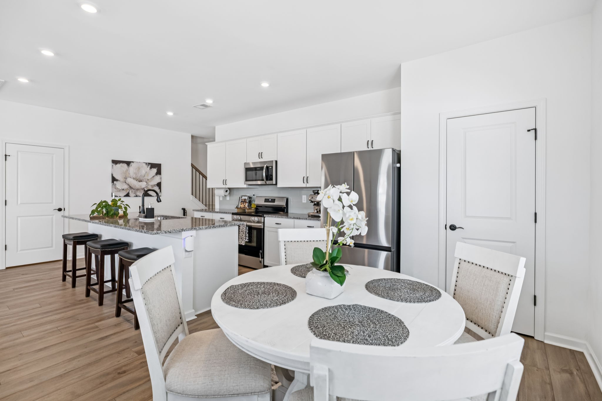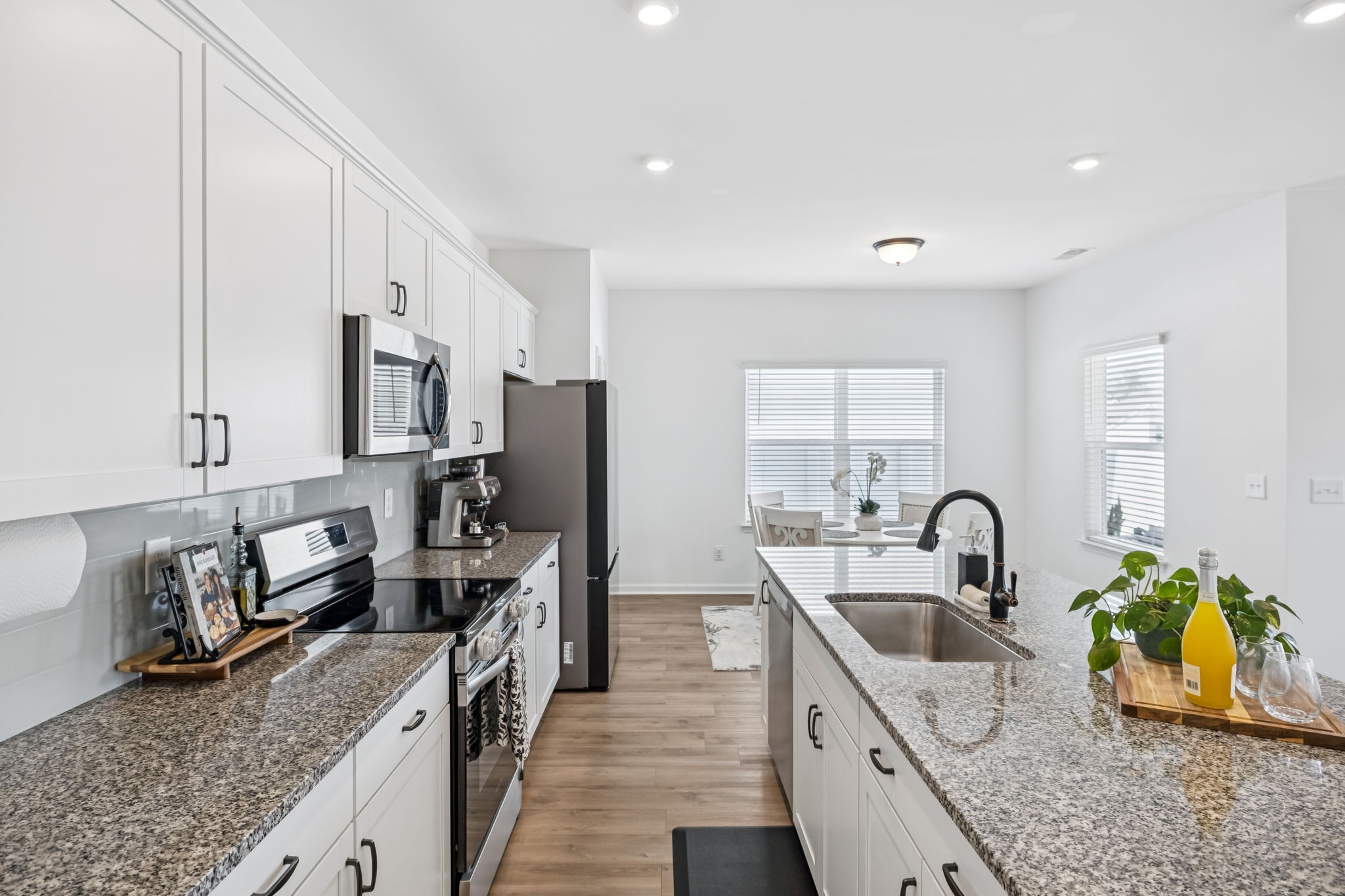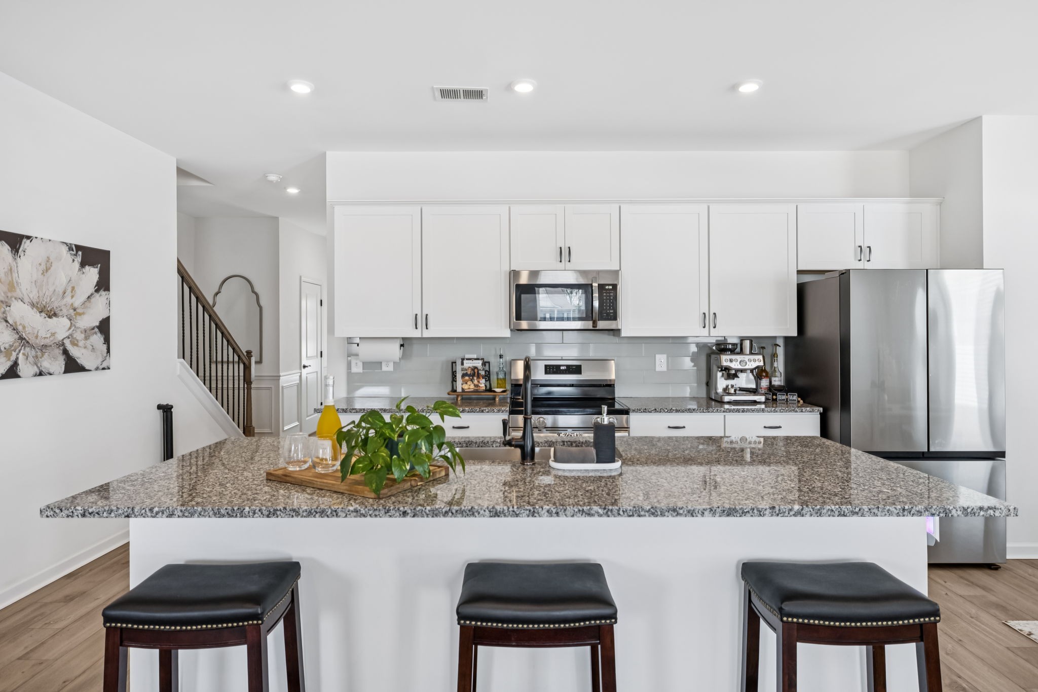 Welcome to Your Better-Than-New Home! This immaculate 3 bedroom, 2.5 bath home with a 2-car garage is ready for you! Outdoor lovers will love the unique rear corner covered porch directly off the spacious living room. This chef’s kitchen features granite countertops, backsplash, stainless steel appliances, and a large island, all overlooking the light-filled family room — perfect for everyday living and entertaining. The main level shines with enhanced vinyl plank flooring and detailed trim work that makes a statement the moment you enter the foyer. Upstairs, a large loft area separates the private owner’s suite from two oversized secondary bedrooms and a full bath. The convenient laundry room is centrally located on 2nd floor for ease of use. This home sits on the largest lot in the community and is fully fenced with a white vinyl privacy fence, giving you the space and seclusion you’ve been looking for. With tons of closet storage throughout, you’ll never run out of room to stay organized. Just 2 years old, this home offers the peace of mind of new construction with added upgrades, vinyl privacy fence, premium lot and trim work — making it truly better than new! Freshly mulched, seeded and straw backyard with new professionally landscaped berms.