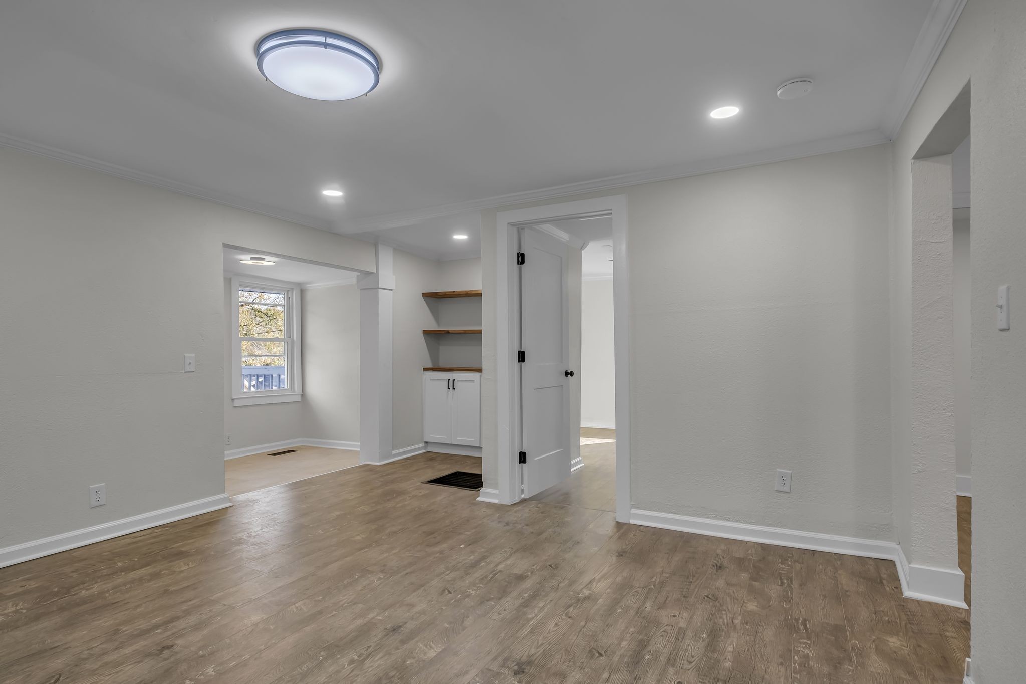 The home also features a spacious entryway with the perfect nook for a dry bar, adding extra versatility. Step outside and enjoy the large front deck that extends your living space outdoors, ideal for relaxing or hosting friends. Parking is convenient with a private driveway tucked behind the house.