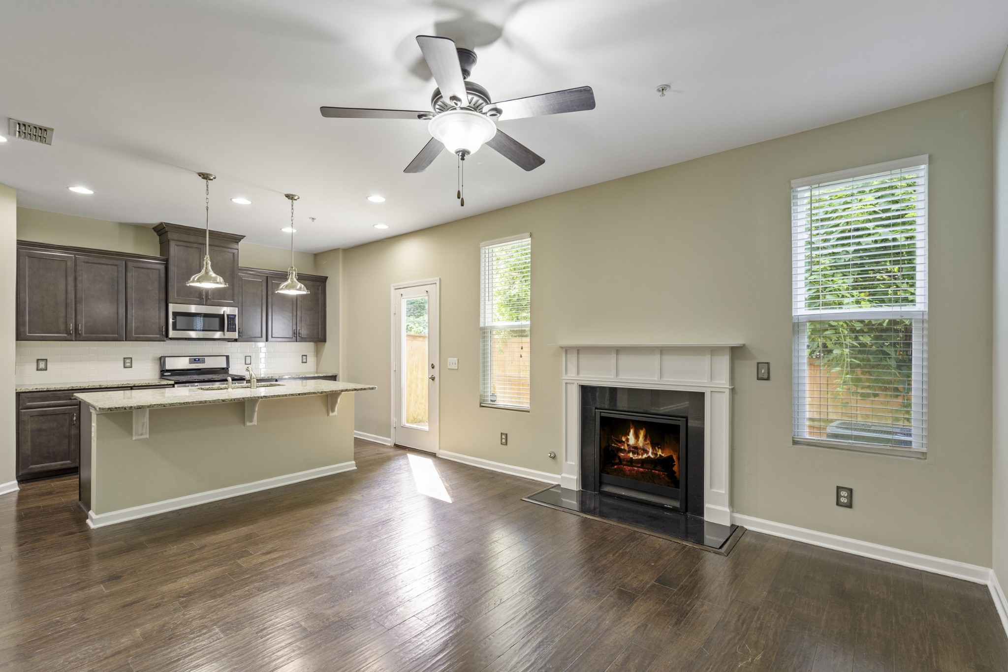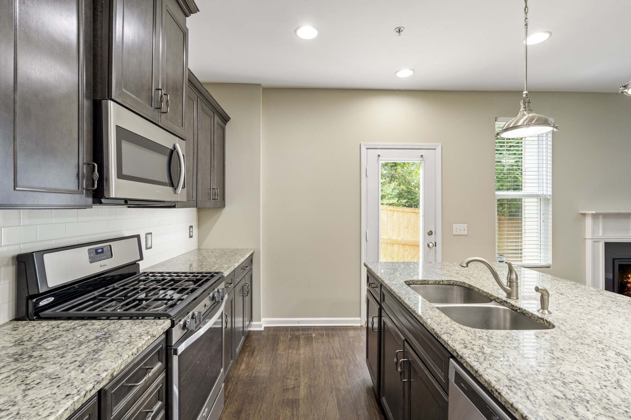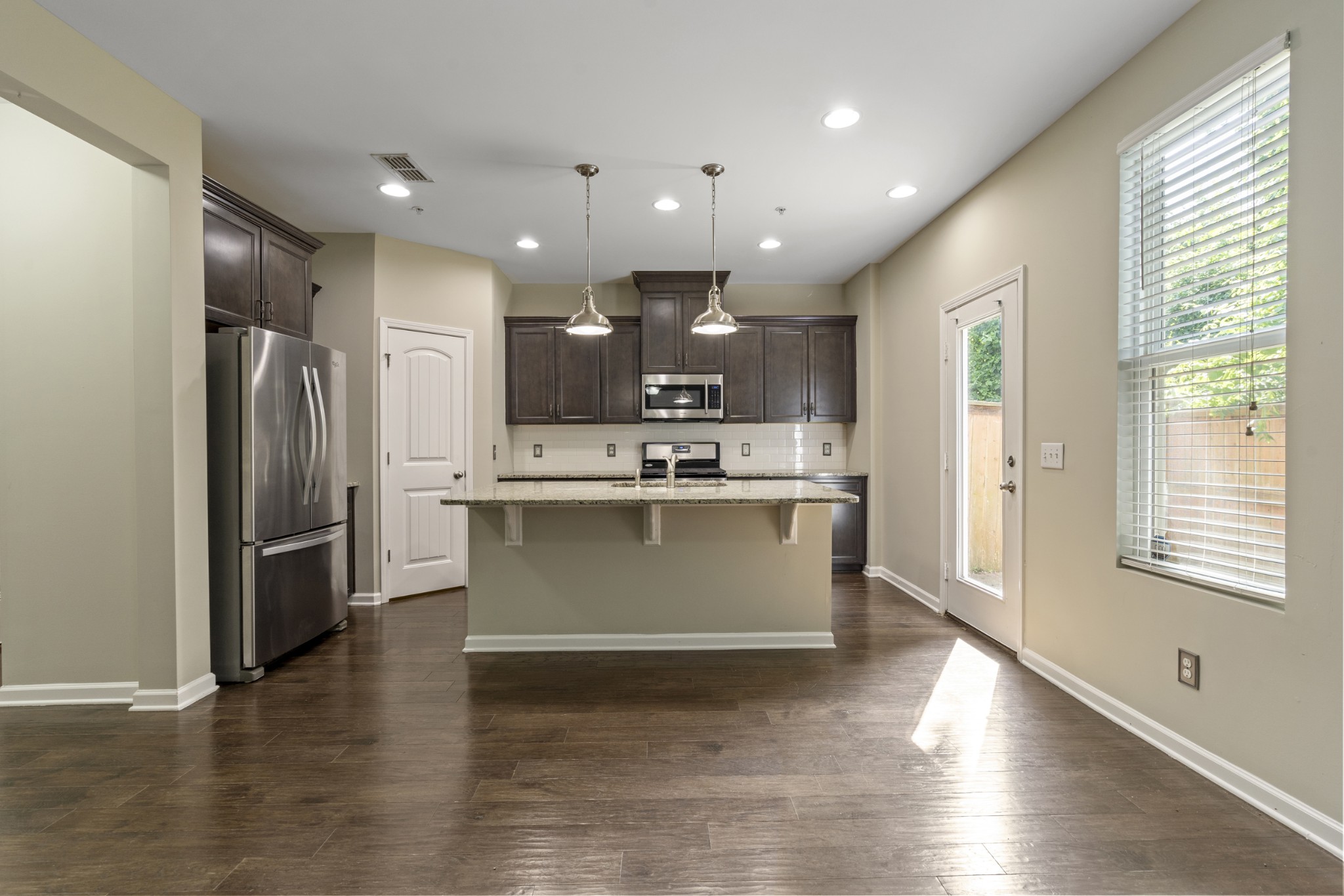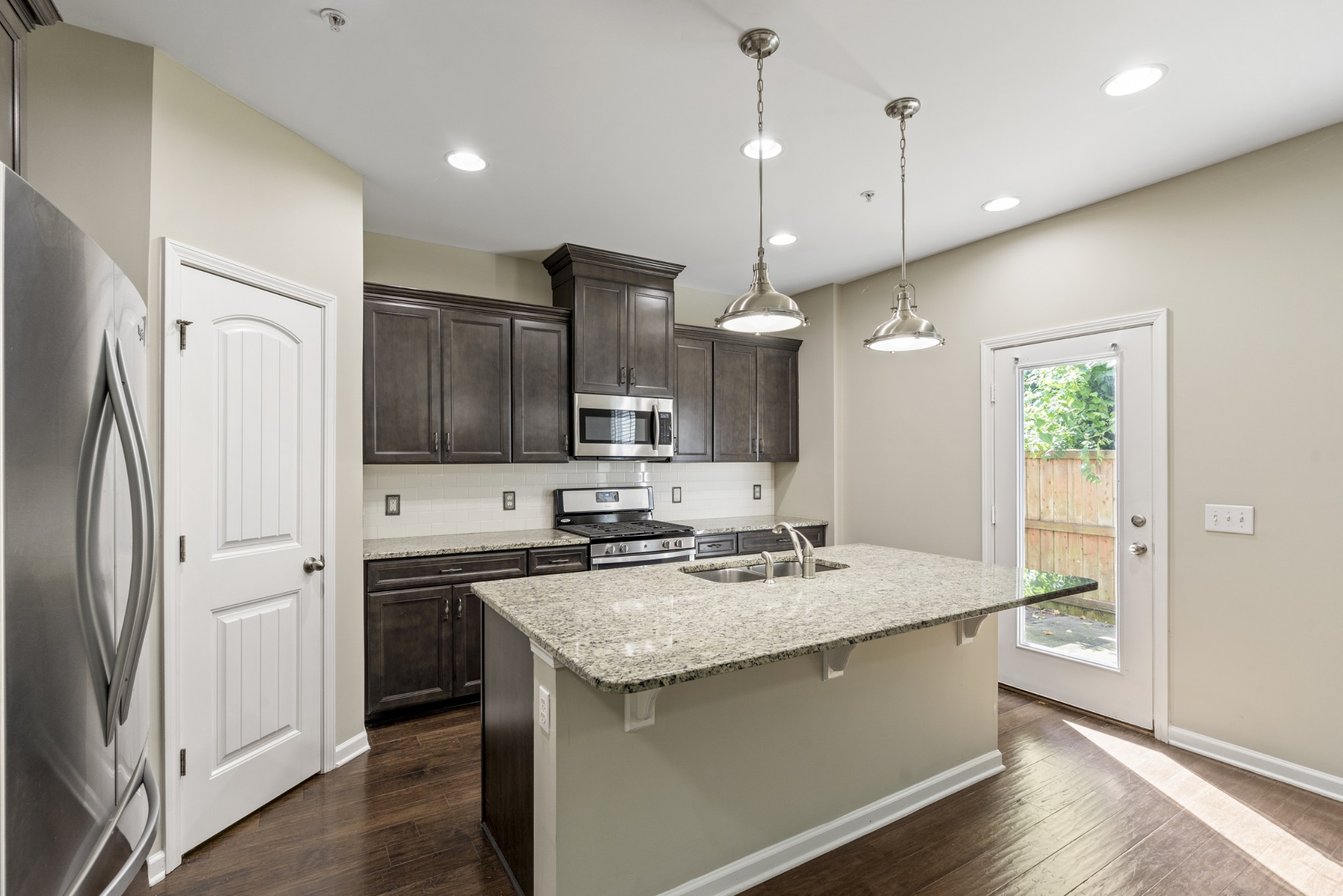 ? Modern kitchen with granite countertops, upgraded cabinets, and stylish lighting