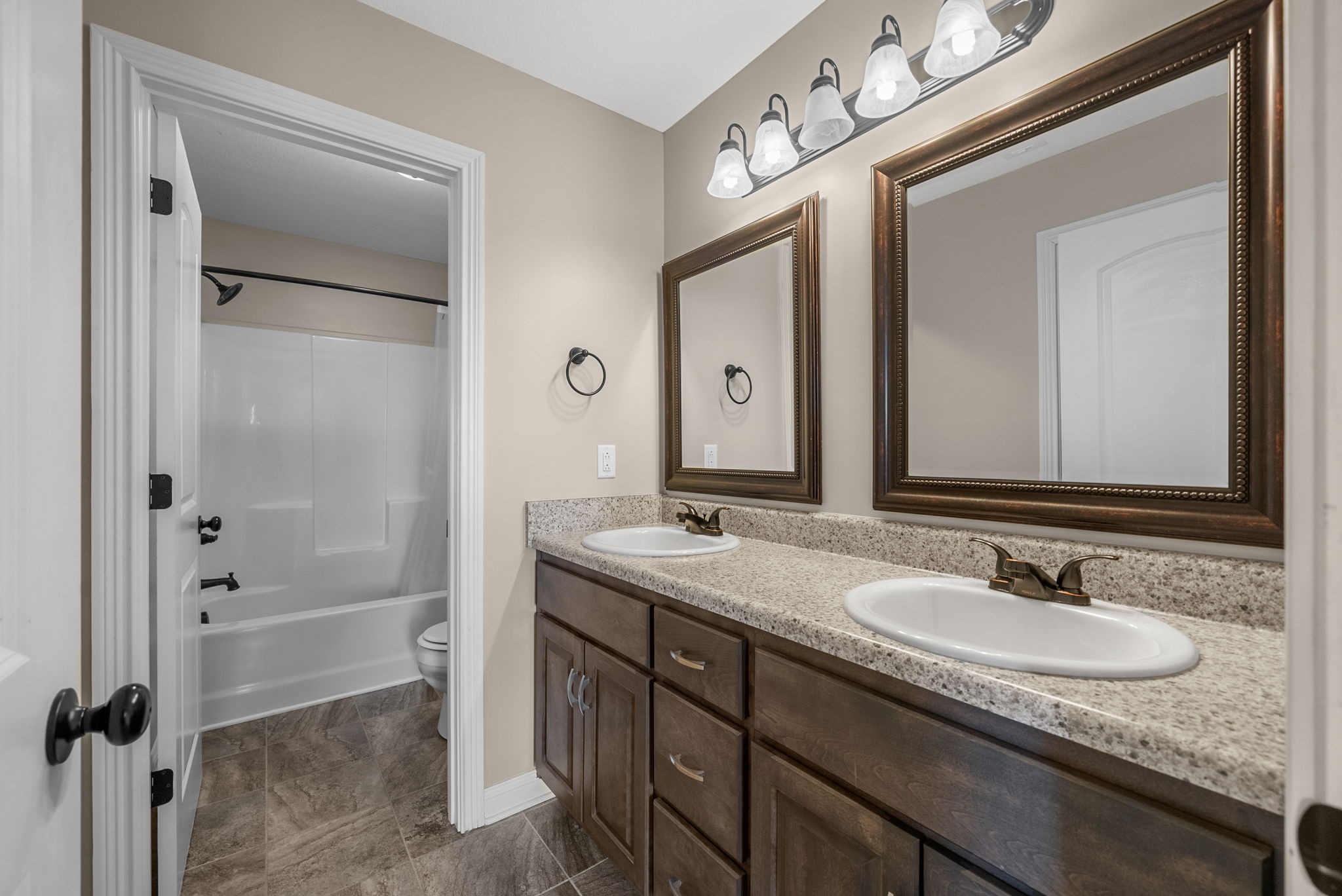 Upstairs, you’ll enjoy carpeted bedrooms, including a spacious master suite with soaring high ceilings, double sinks, and a walk-in closet. The additional bedrooms are generously sized and share two full bathrooms, making the layout perfect for families or guests.