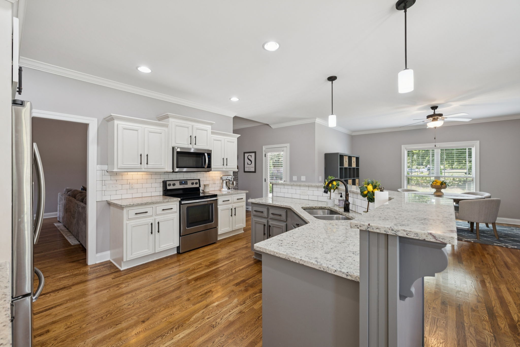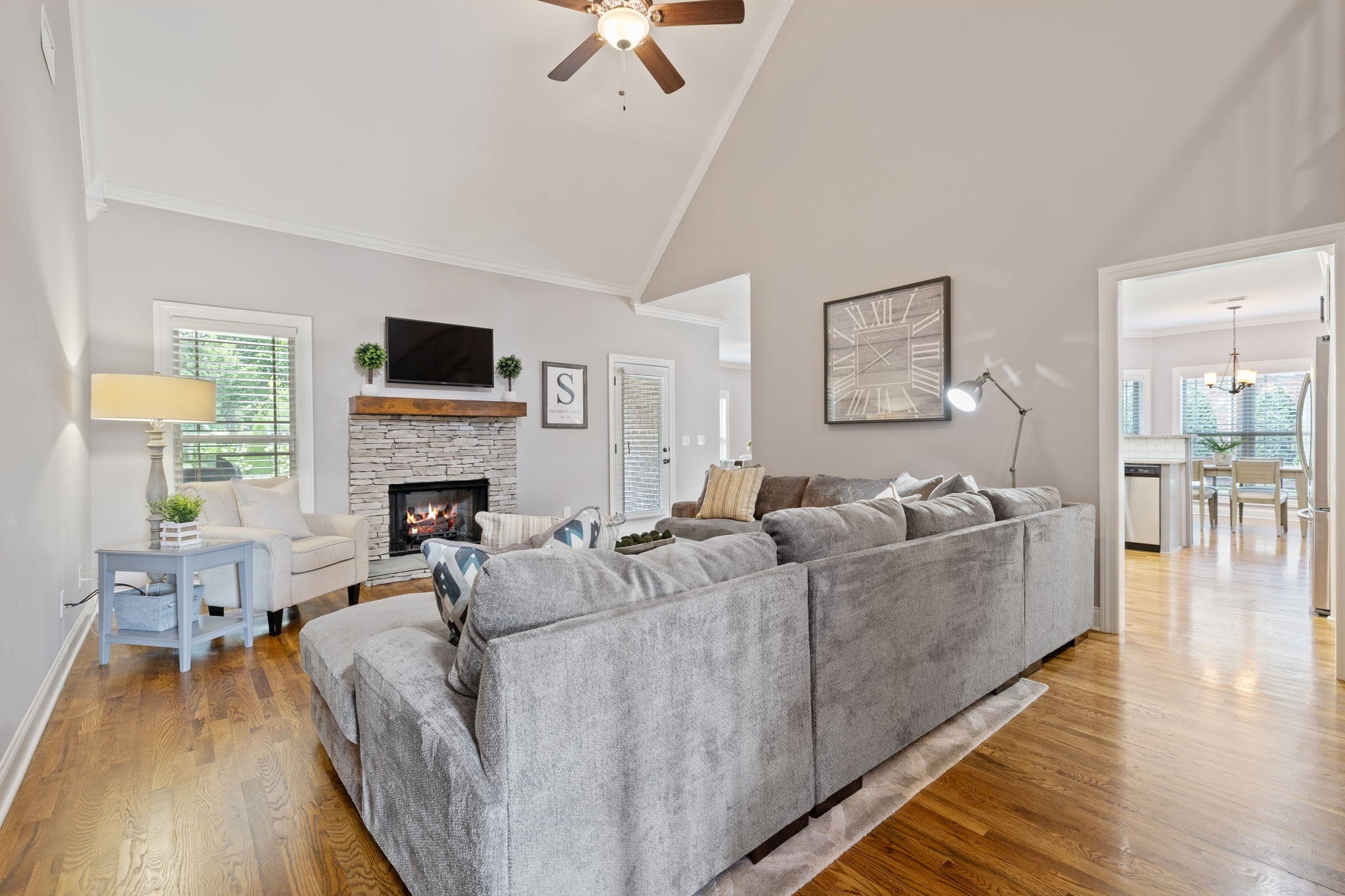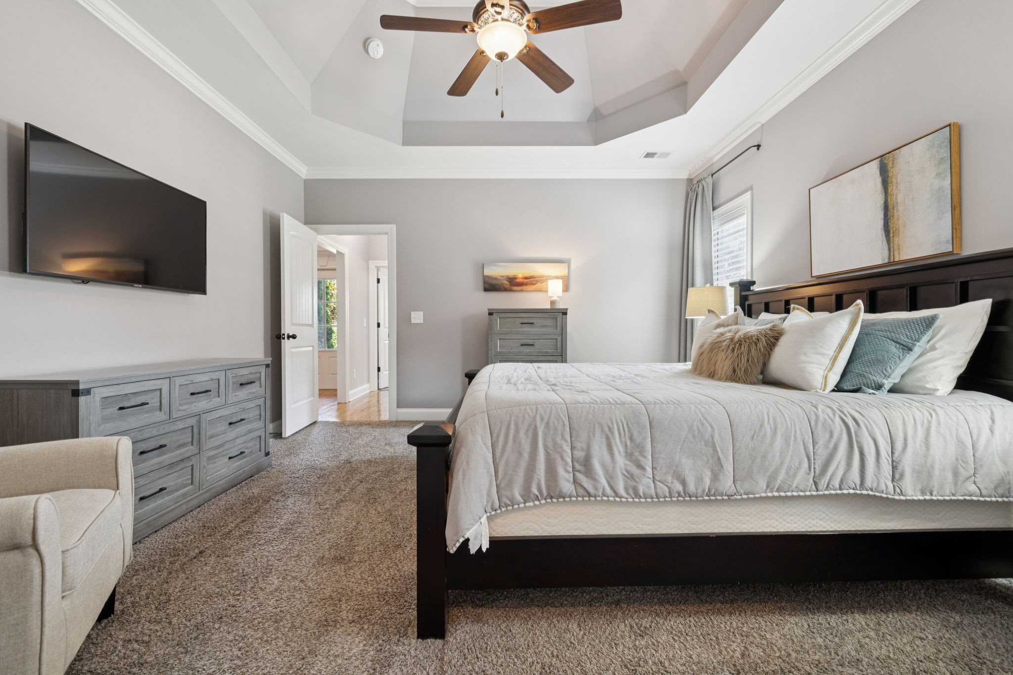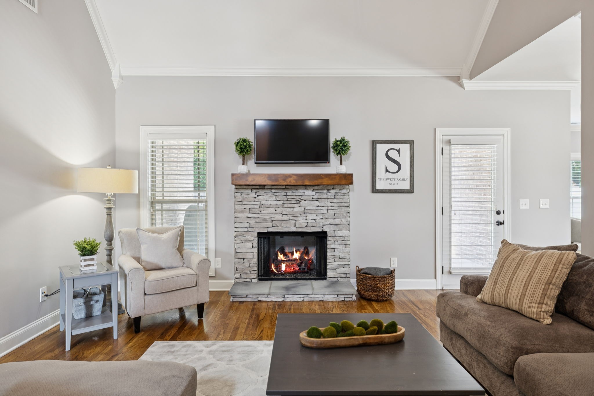 Inside, you’ll find soothing color palettes, beautiful hardwood floors, and a bright, open kitchen complete with stainless steel appliances and quality hardware. Two zoned bedrooms are located on the main level, including a spacious primary suite with dual walk-in closets and a large en-suite bath with double vanities. An oversized bonus room with a wet bar, offers versatility for entertainment, guests, or workspace.