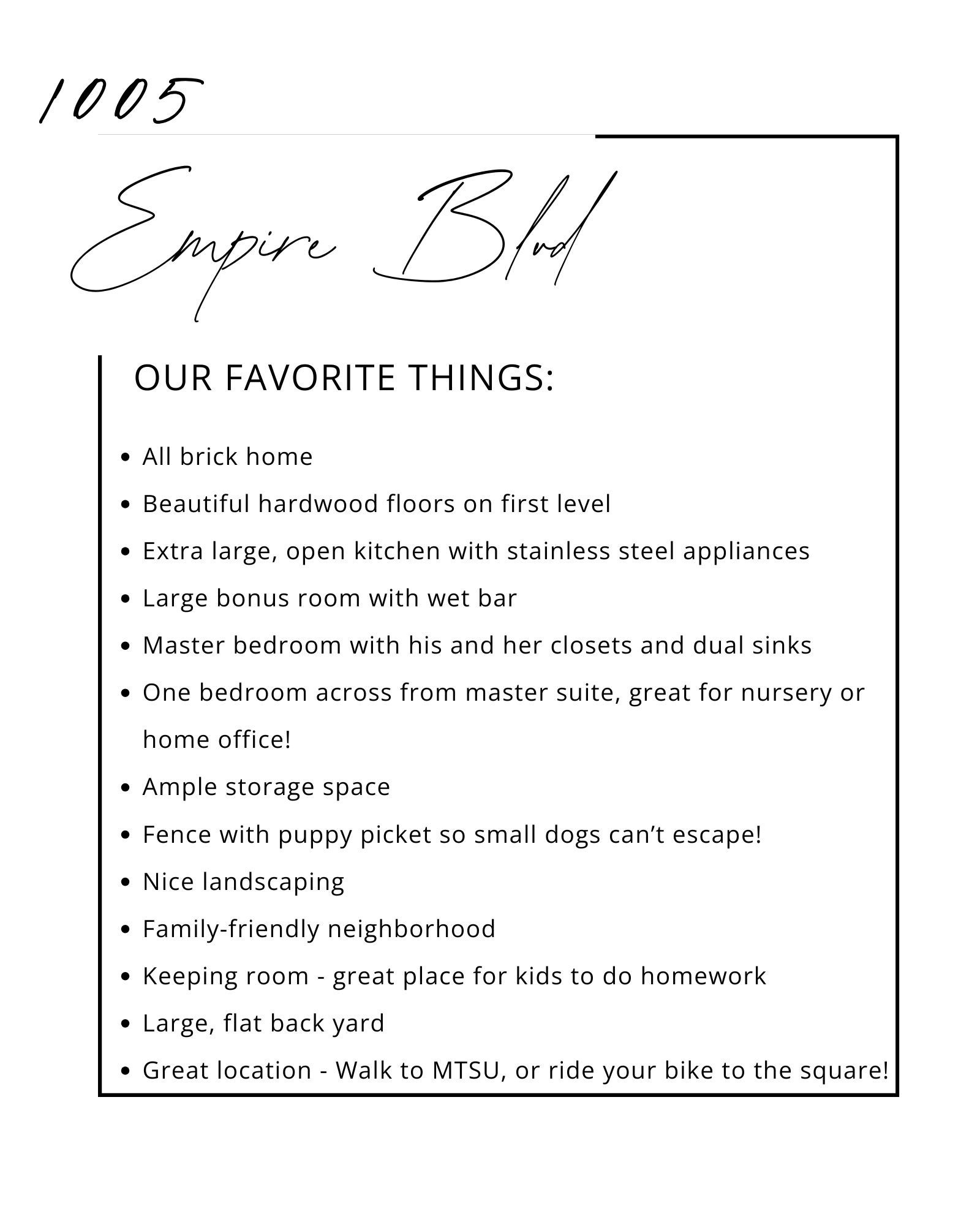 Homes this close to MTSU don’t come available often!! Ask us about creative financing options! 4 bedrooms and 3 full baths, ALL BRICK home….1005 Empire Blvd. stands apart with thoughtful details and everyday livability in mind. Located in a newer, yet well-established neighborhood with wide streets and sidewalks, and easy access to all sides of town, this home offers both comfort and convenience. The all-brick exterior is matched by a spacious driveway with room for multiple vehicles.