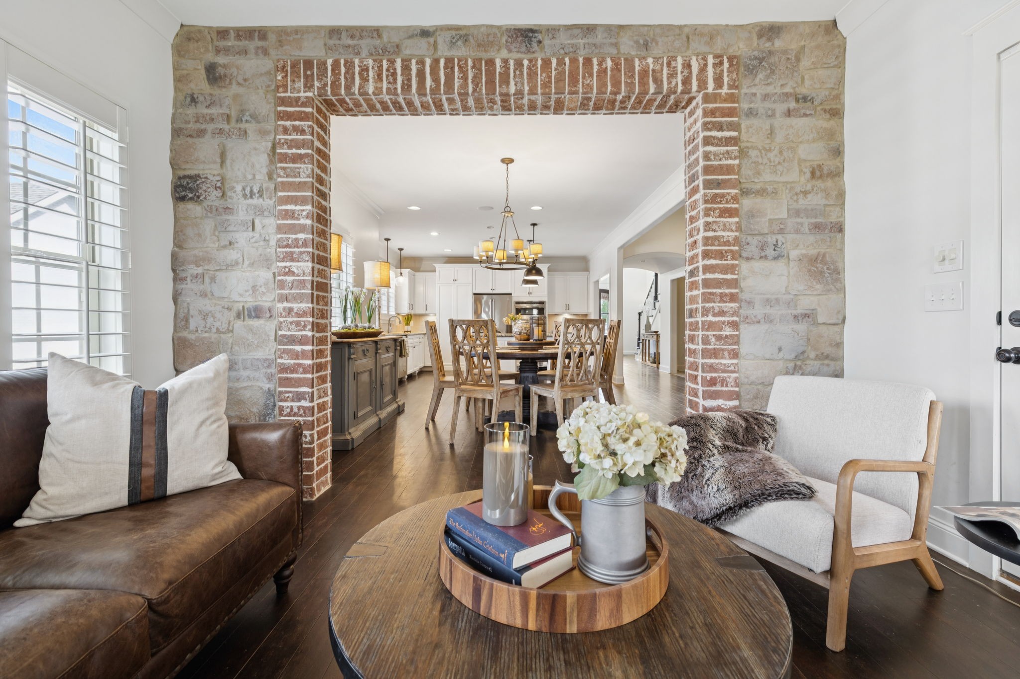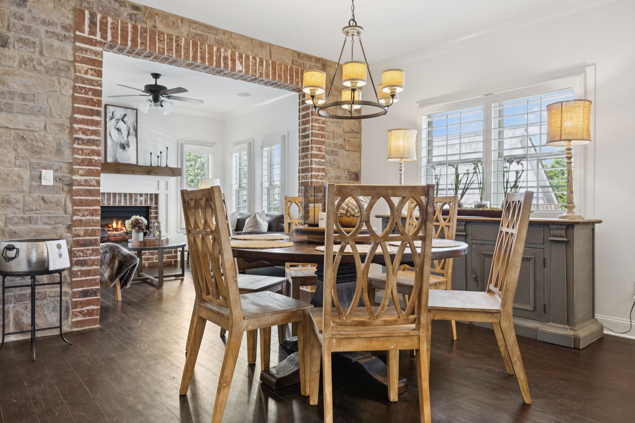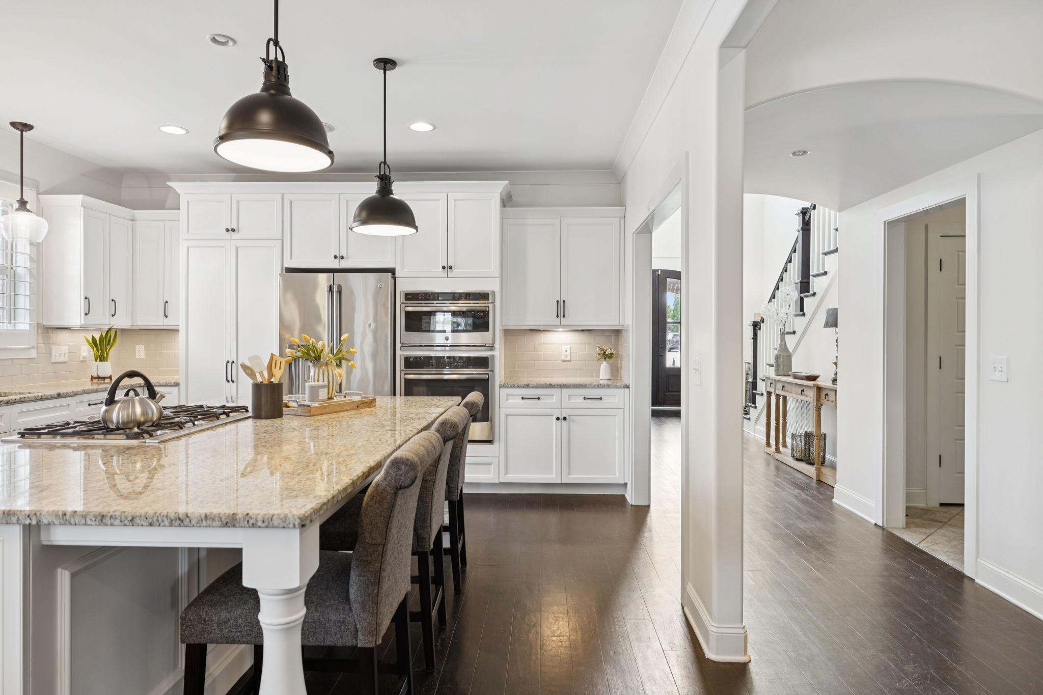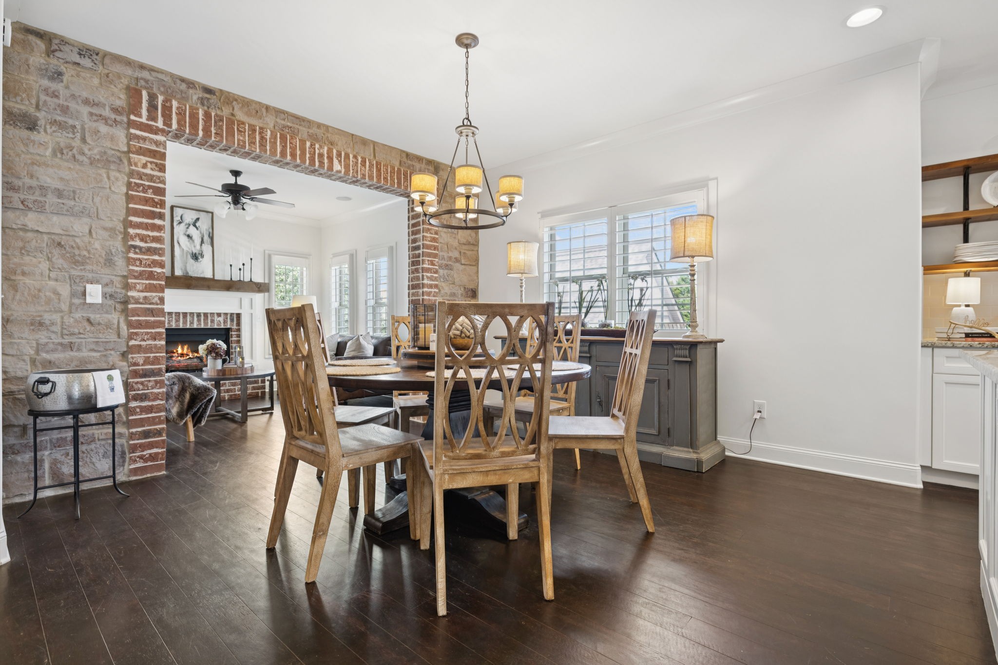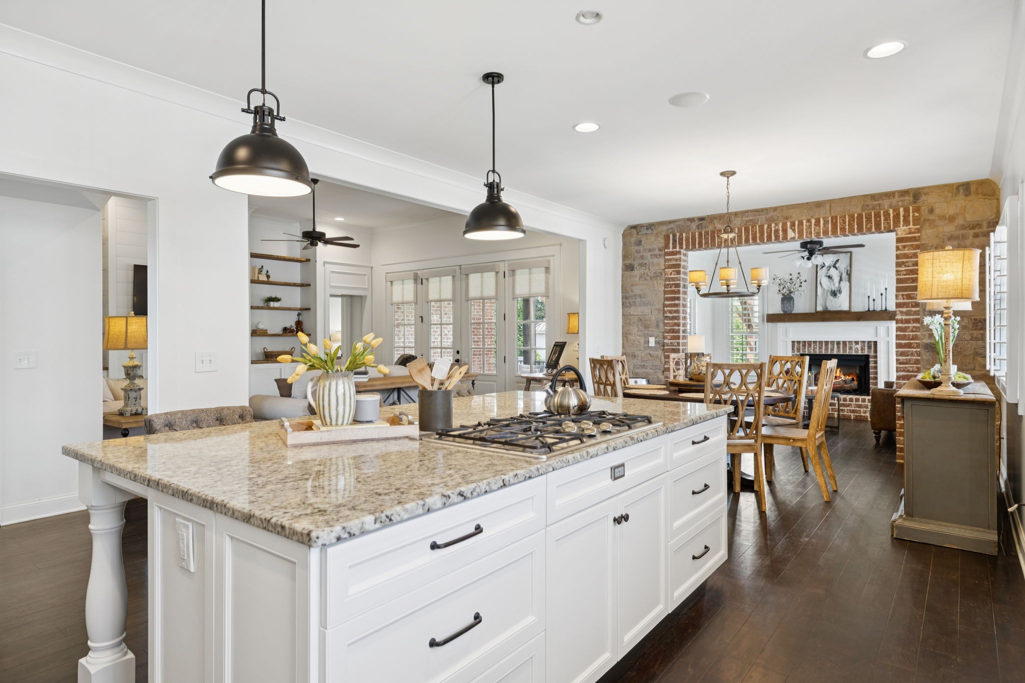 Entertainer's dream in the coveted Puckett Station community! Offering 4196 sq. ft. of living space, this 4/BR, 4/BA home combines elegance with everyday comfort. The open floor plan features a spacious living room with fireplace, a hearth-room with fireplace, a chef's kitchen with gas cooktop, oversized island, hidden pantry, and an eat in dining room. Enjoy your primary suite on the main level with his and her closets, and a spa-like bath with double vanities and dual shower heads in your super shower!