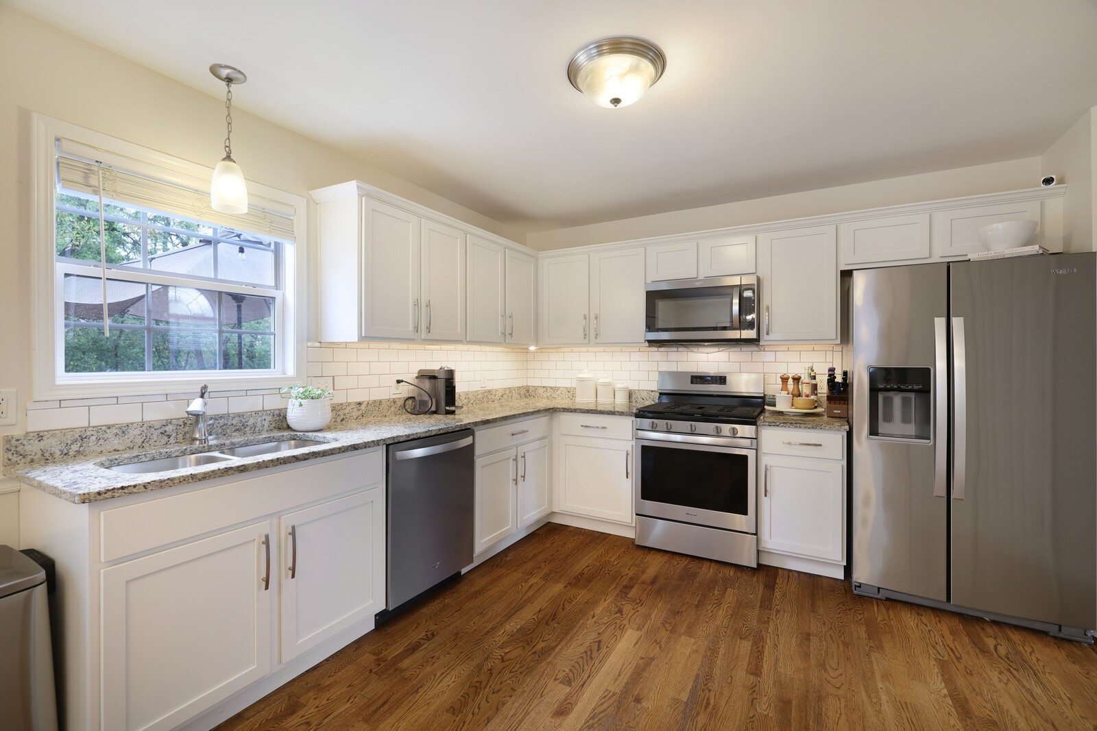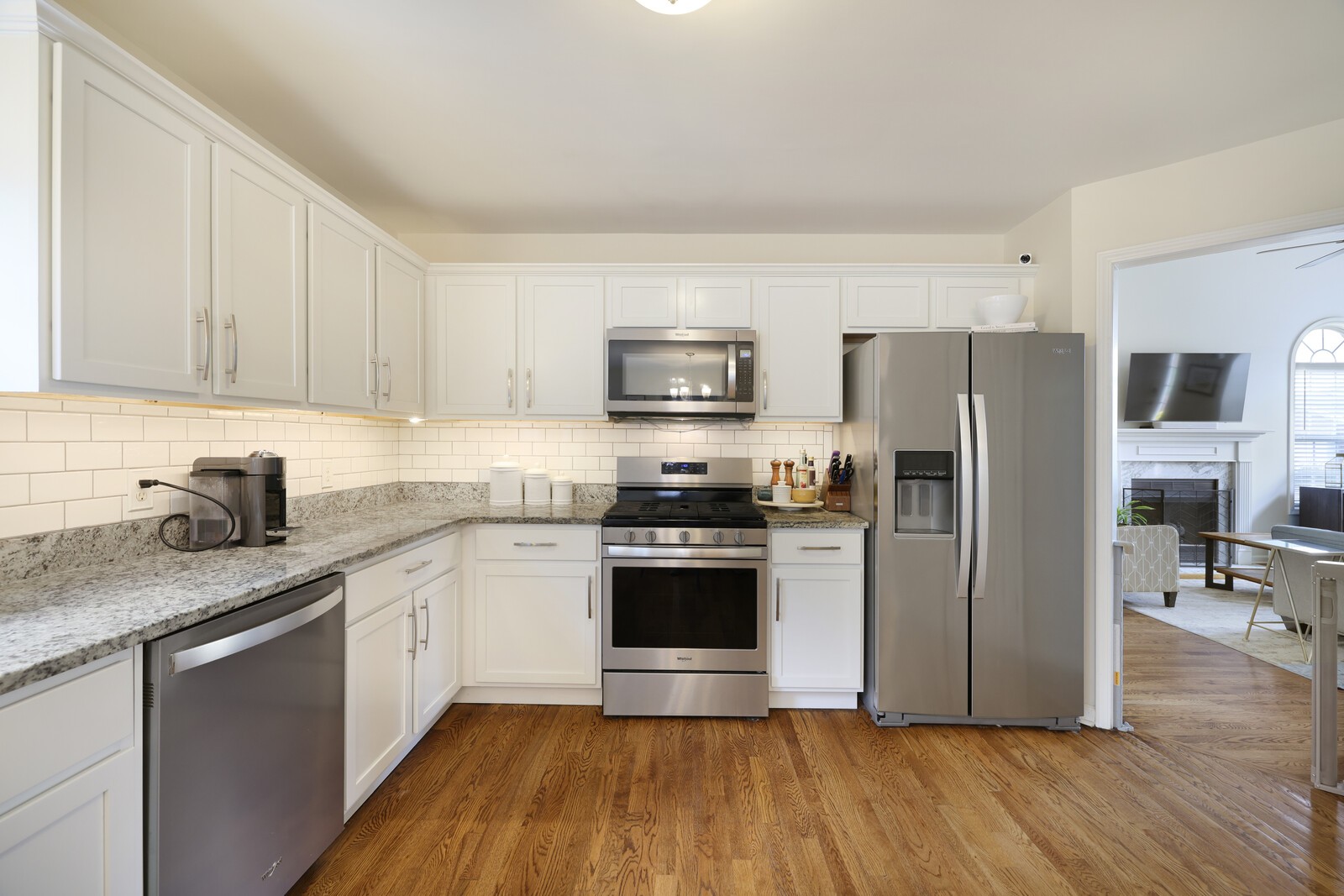 The inviting living room features a cozy fireplace and oversized arched windows, while both a formal dining room and an eat-in kitchen provide flexible spaces for gatherings. The updated kitchen boasts granite countertops, stainless steel appliances, subway tile backsplash, and crisp white cabinetry—perfect for both everyday meals and entertaining.