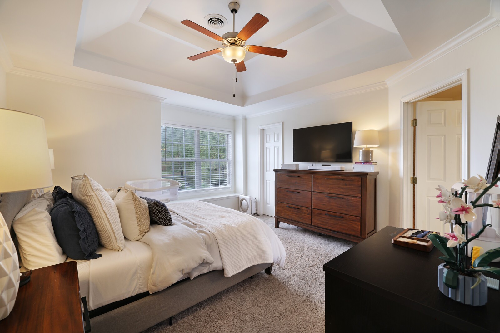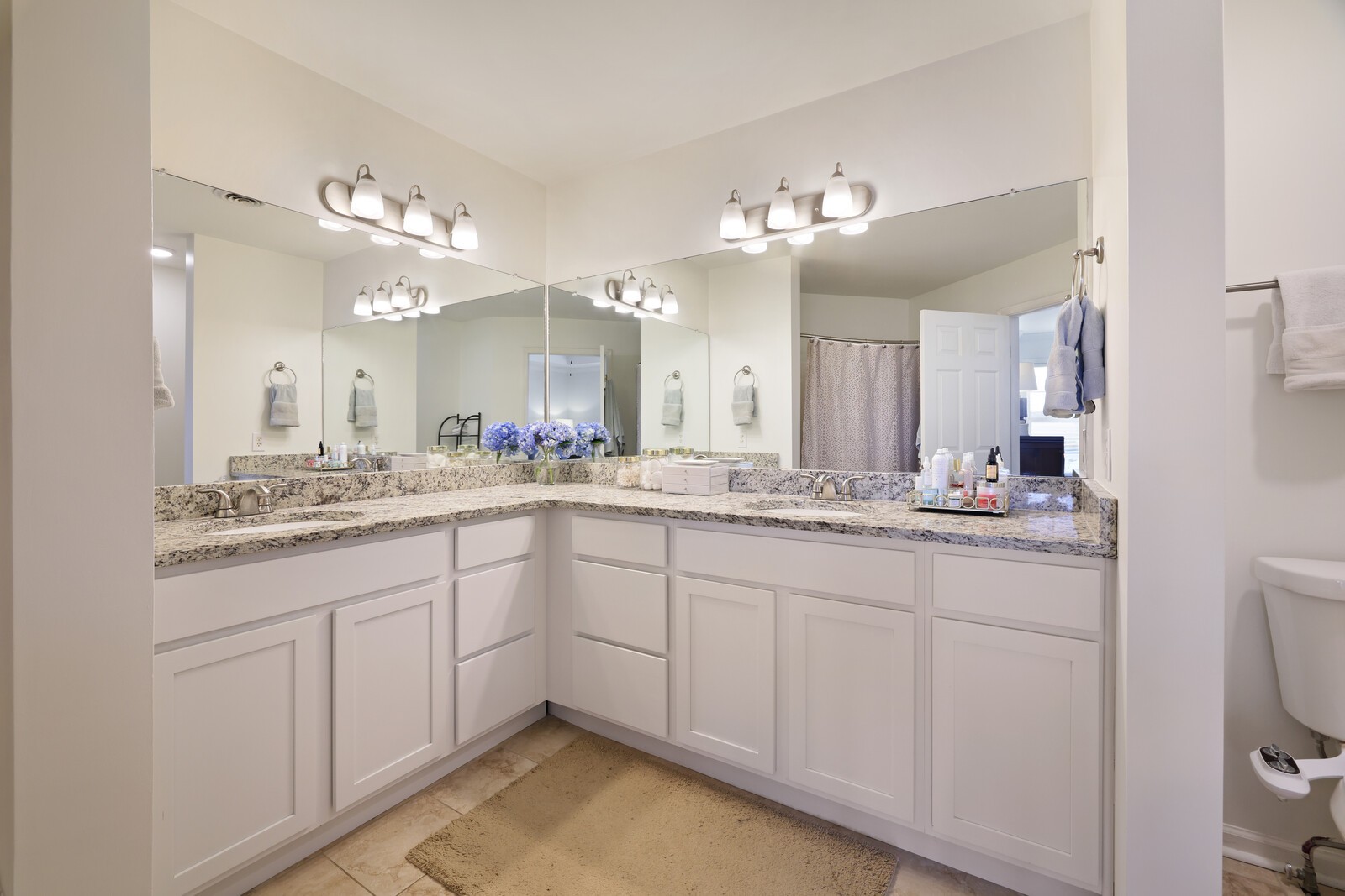 The spacious owner’s suite offers a serene retreat with a tray ceiling, walk-in closet, and private bath with dual vanities and granite countertops. Additional bedrooms are well-sized with ample closet space and share a generously sized Jack and Jill bathroom. A convenient half bath is located just off the living room for guests.