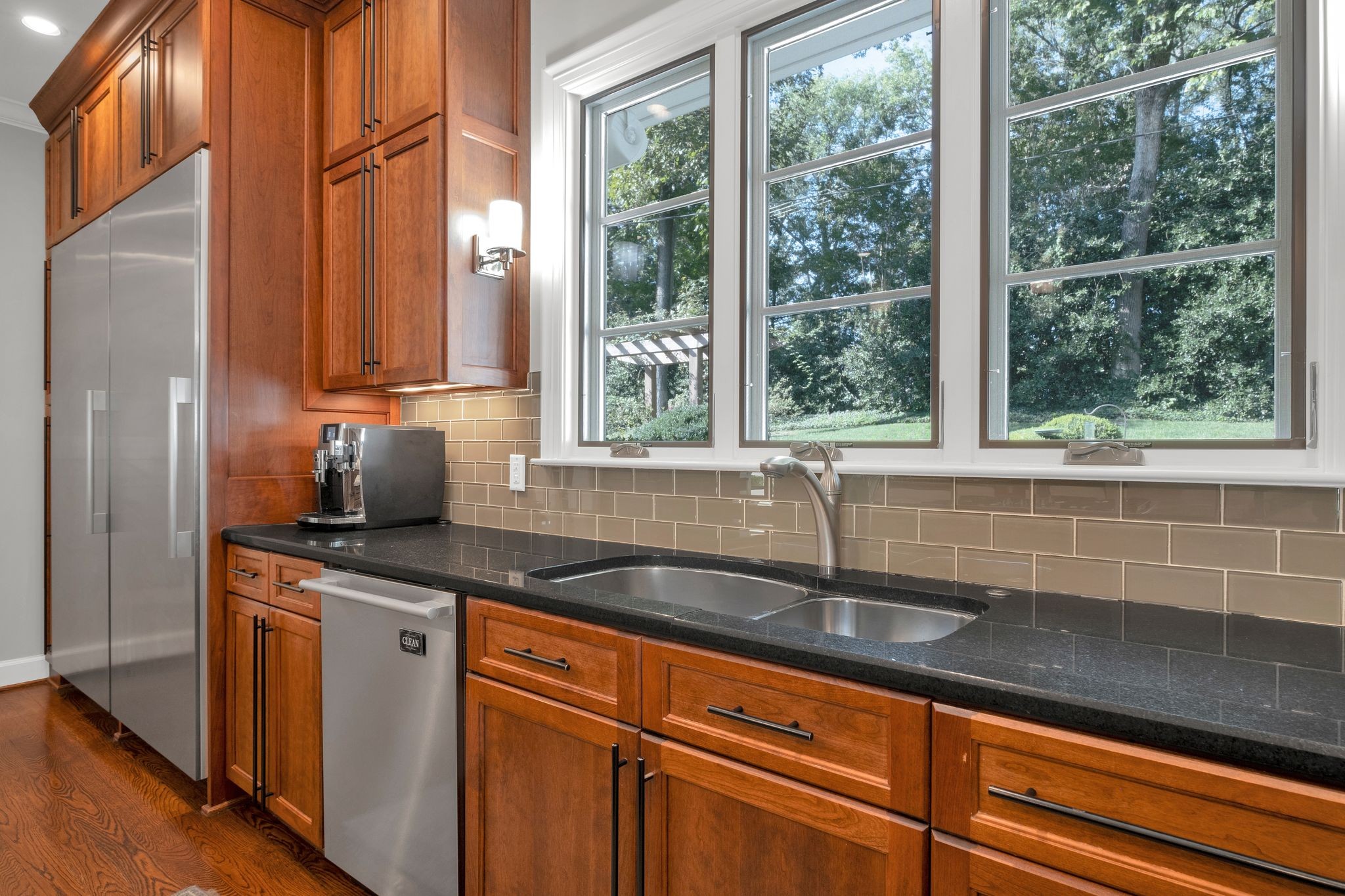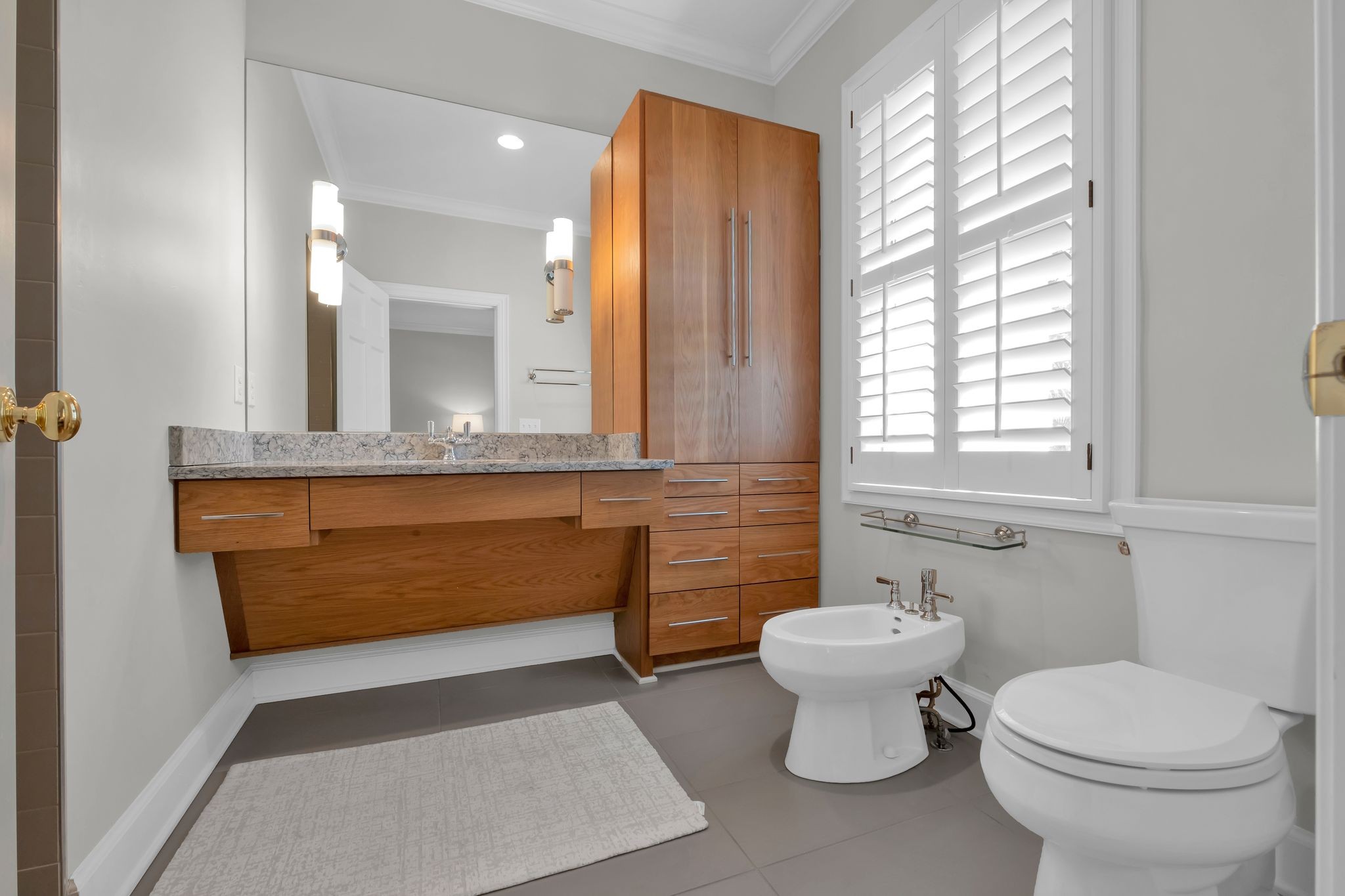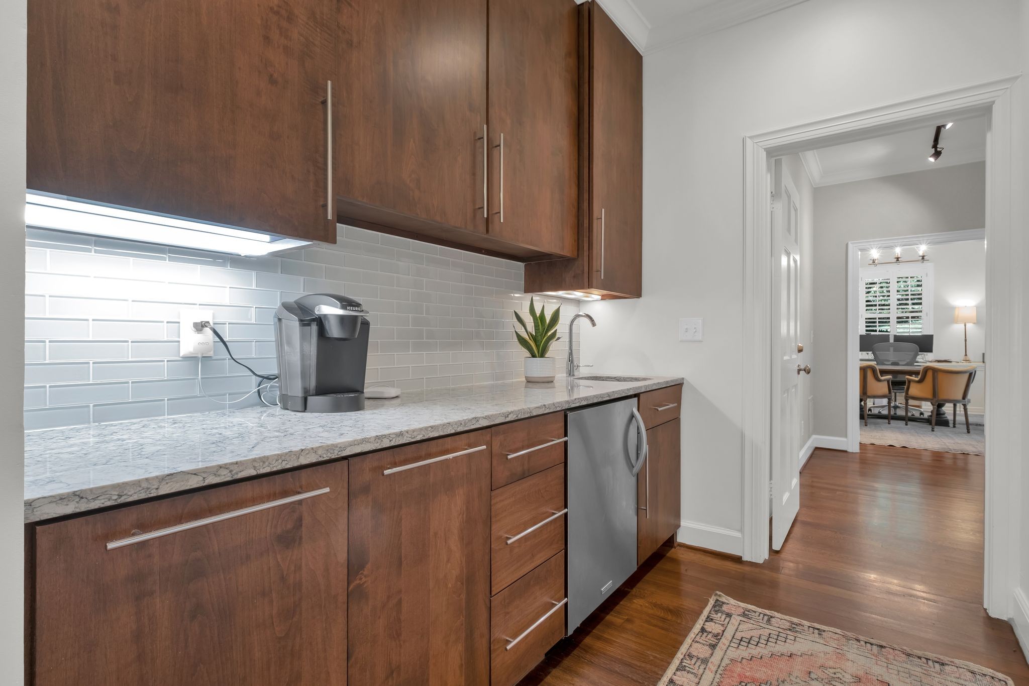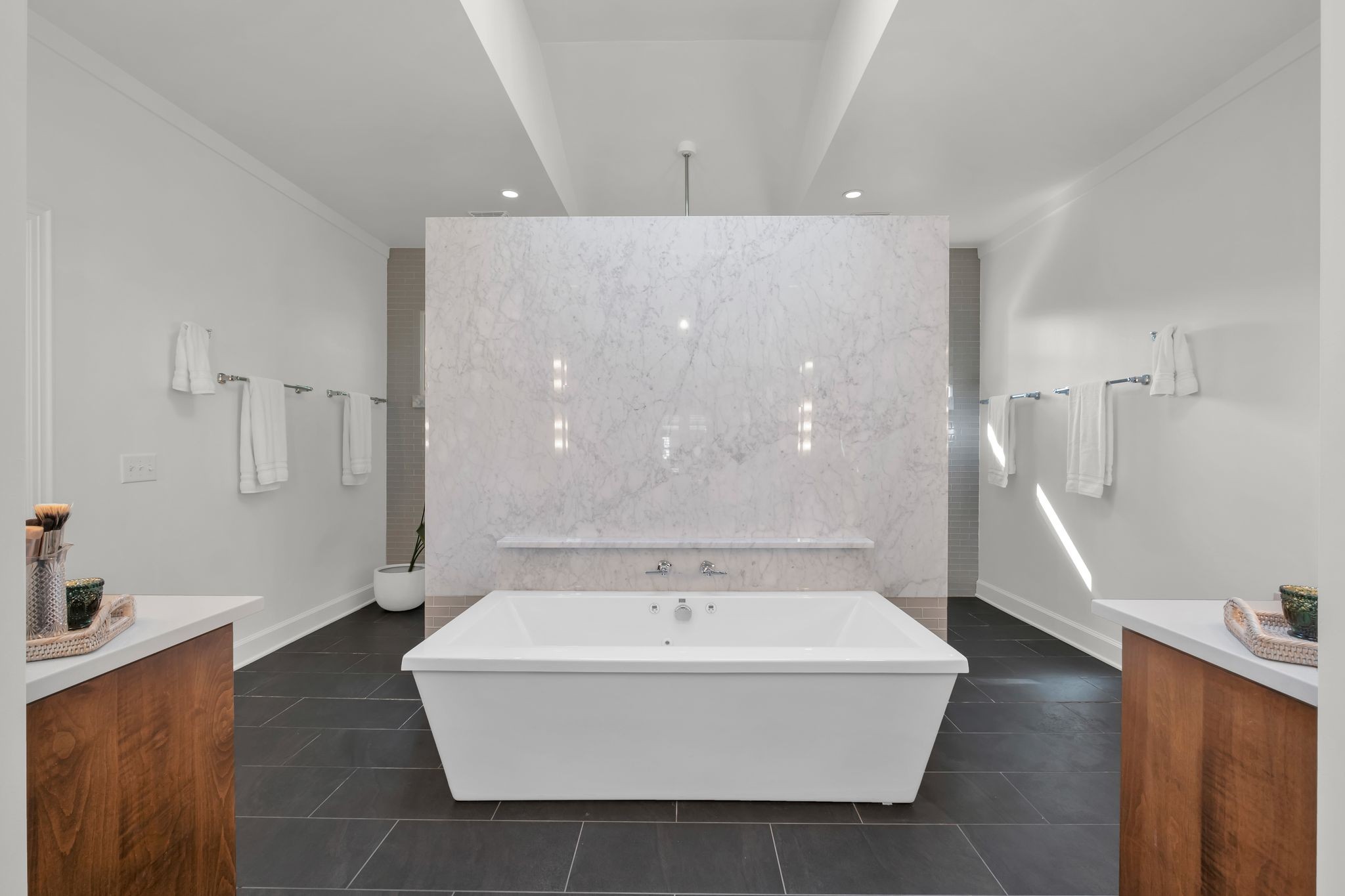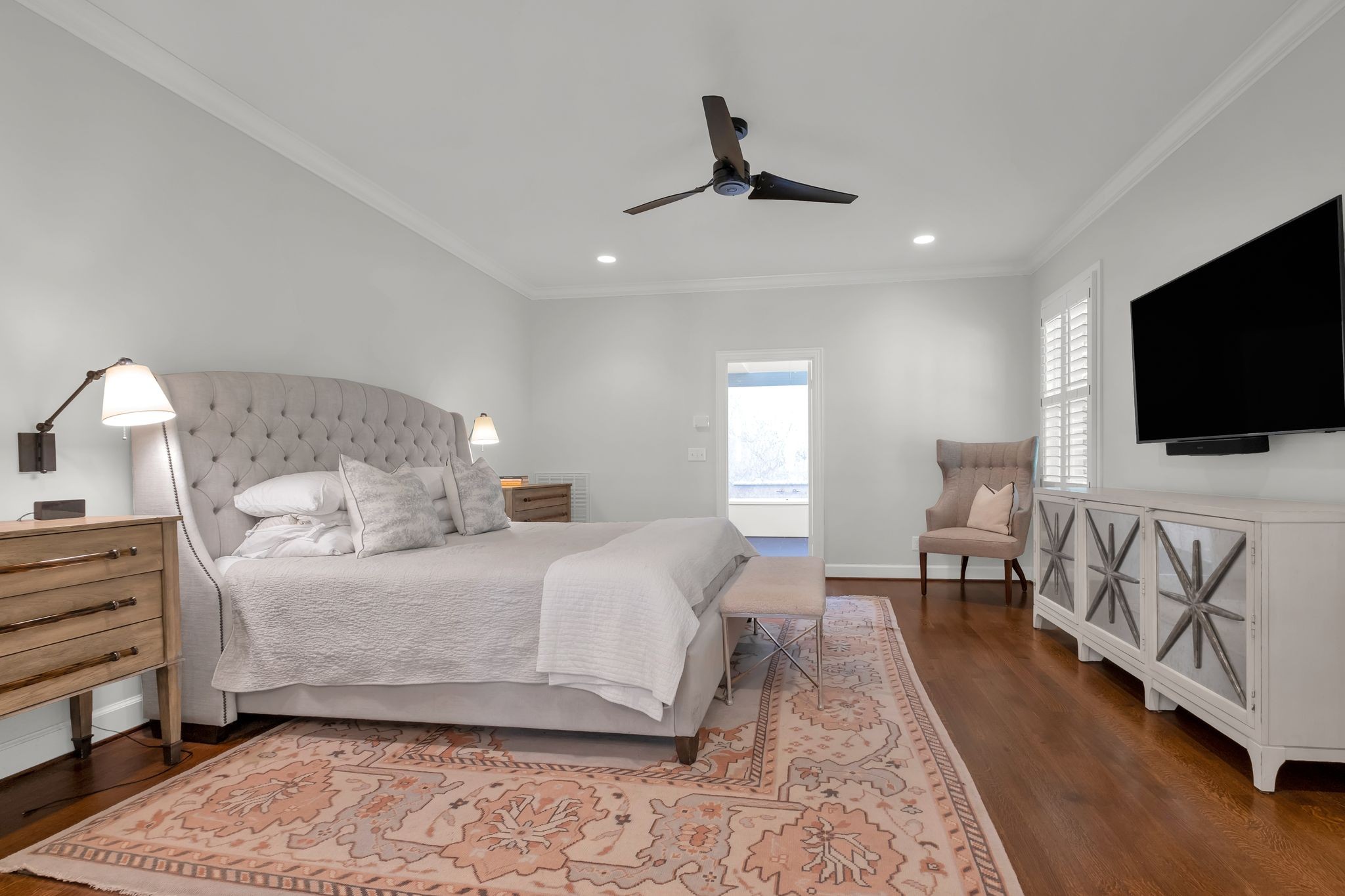 The primary suite is a retreat within itself. Beyond the bedroom, a private living/working/exercise space flows naturally to the landscaped backyard. A built-in coffee bar ensures mornings begin with ease and indulgence. The spa-inspired bathroom elevates daily living with a heated stand-alone soaking tub, a Carrera marble shower wall with dual shower heads, heated tile floors, and soaring ceilings crowned with dual skylights—a sanctuary designed for pure rejuvenation.