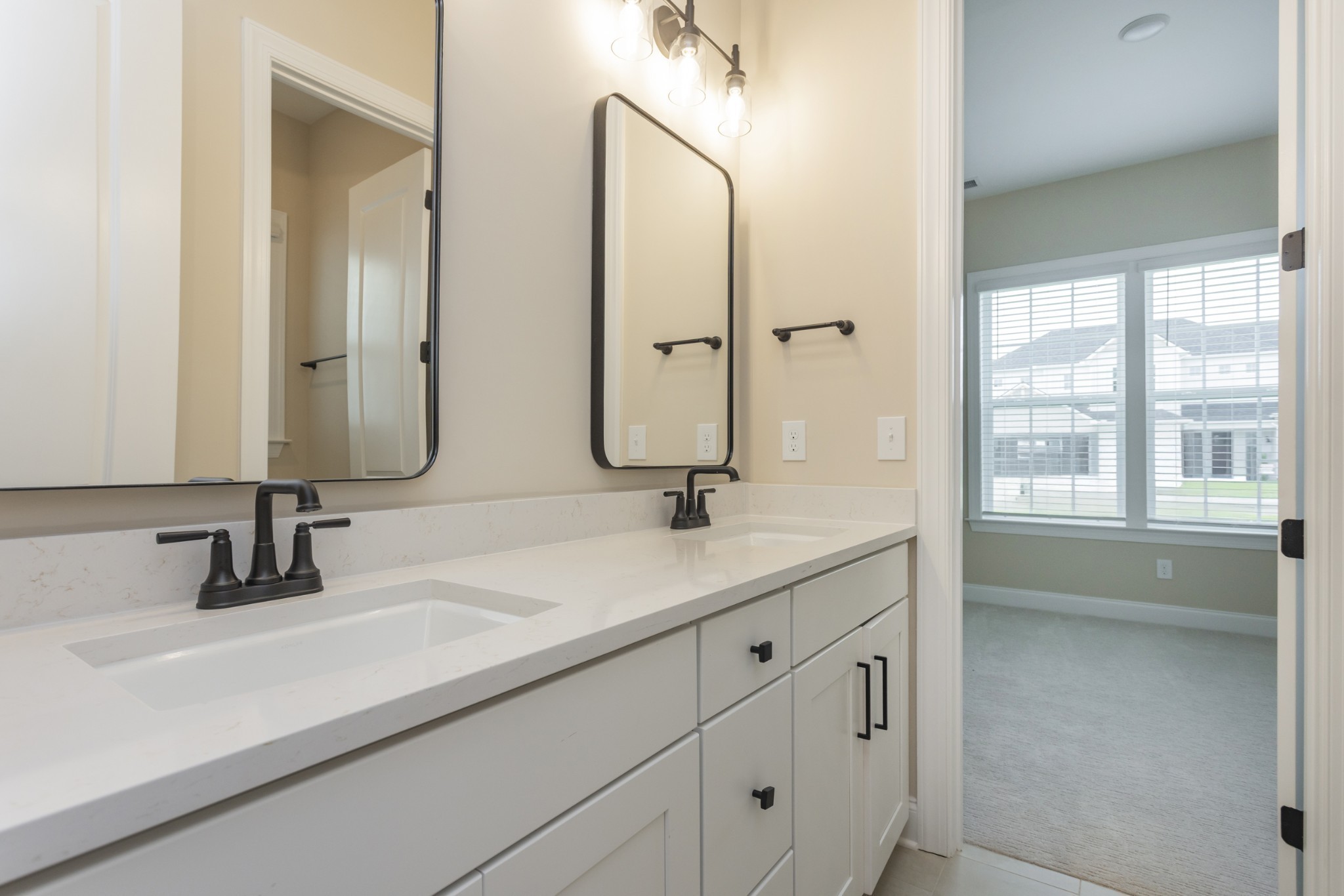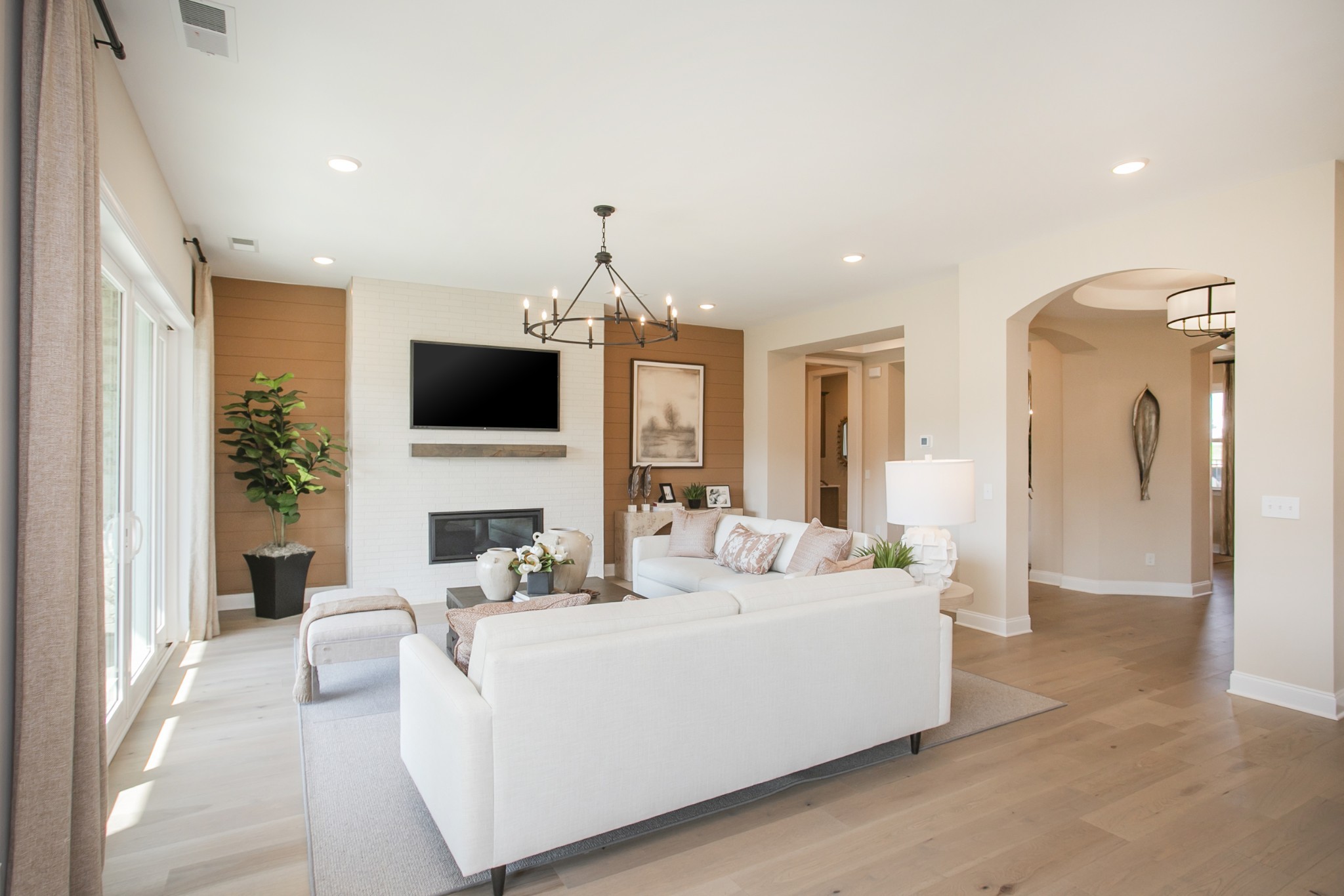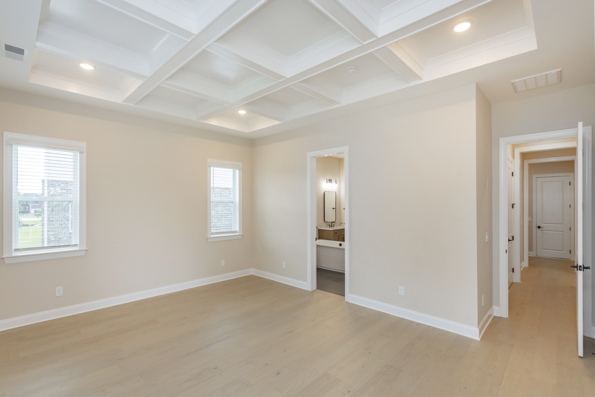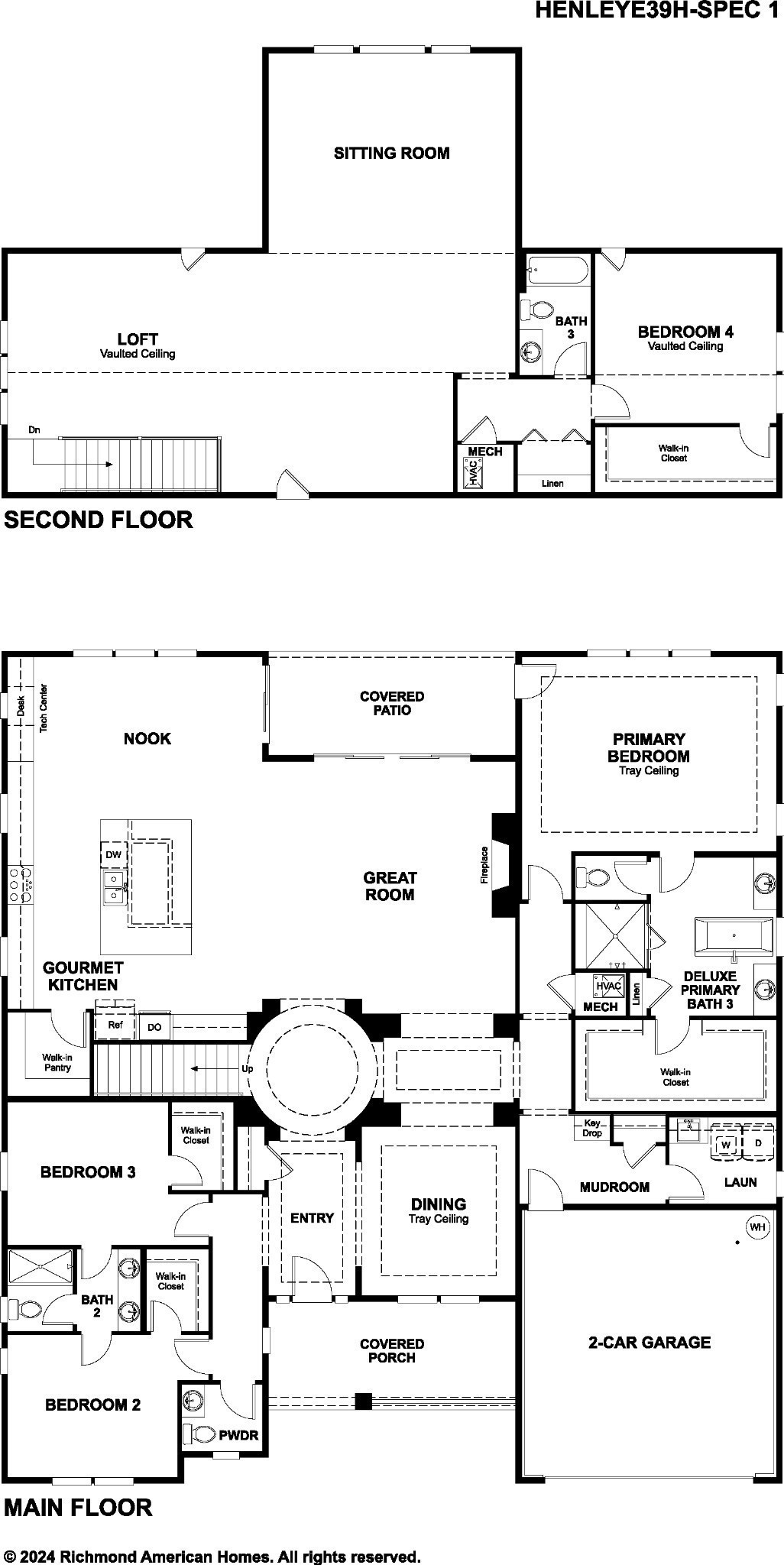 The luxurious primary suite on the main floor includes a tray ceiling, a spa-inspired deluxe bathroom, and a large walk-in closet for the ultimate retreat. Two additional bedrooms with walk-in closets and a shared bathroom, along with a powder room, complete the main level.