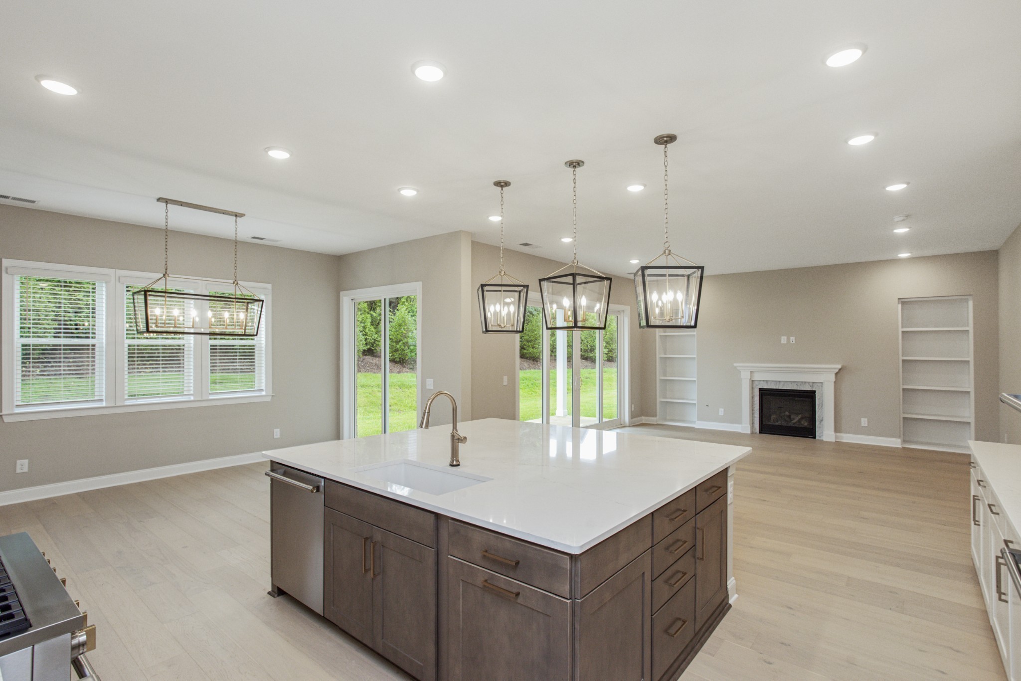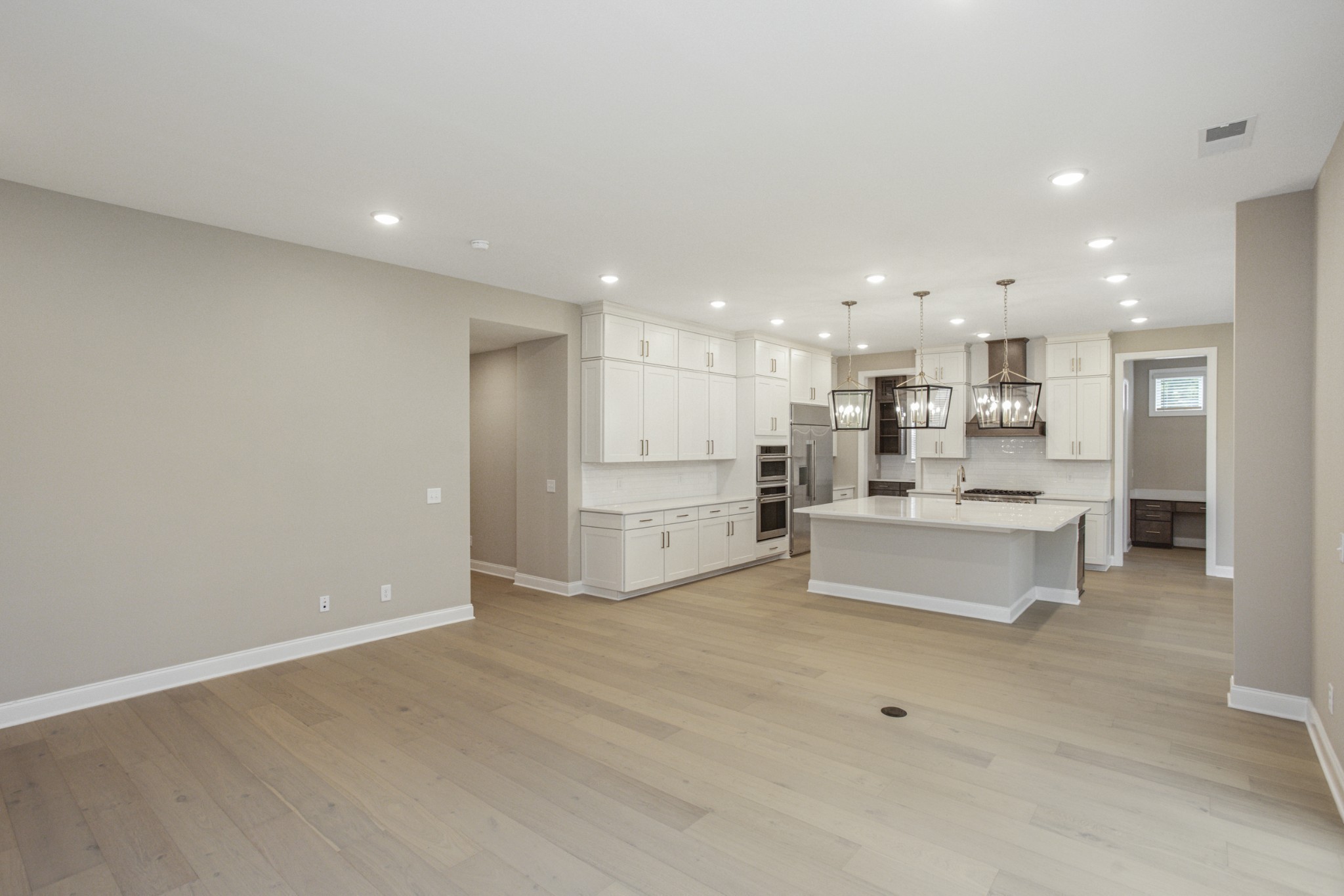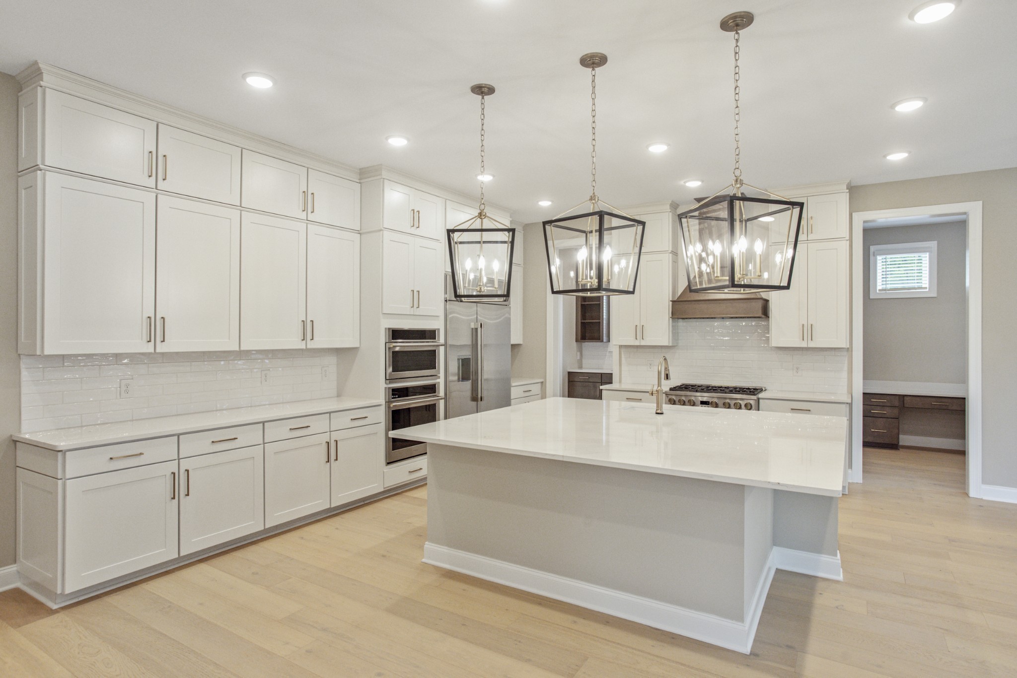 The gourmet kitchen is a chef’s dream, featuring a large center island, walk-in pantry, and premium finishes throughout. An adjacent breakfast nook opens to a covered patio, ideal for entertaining guests or enjoying quiet mornings outdoors.