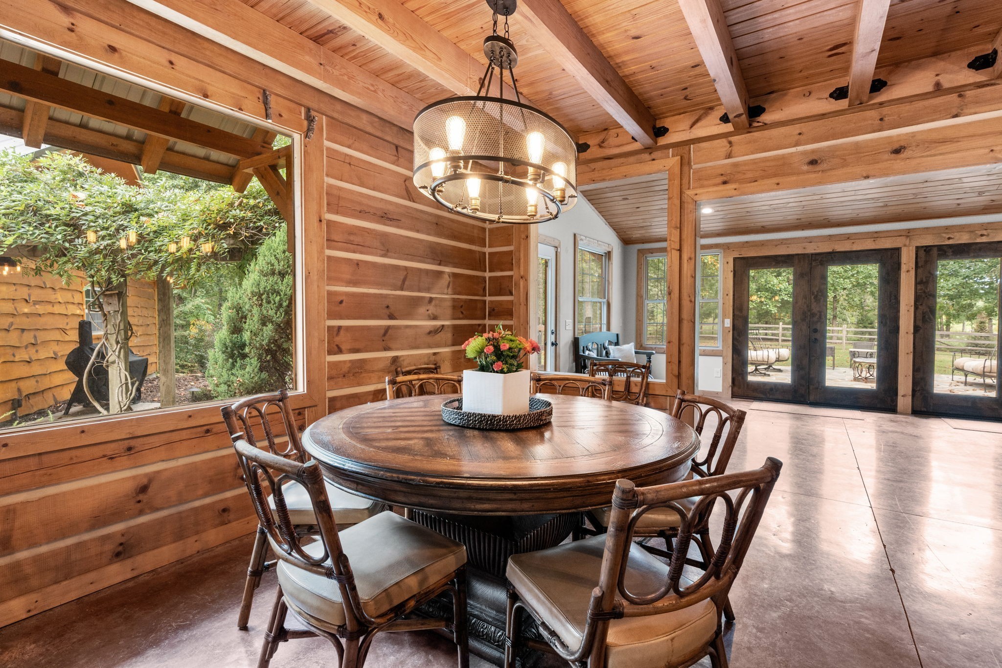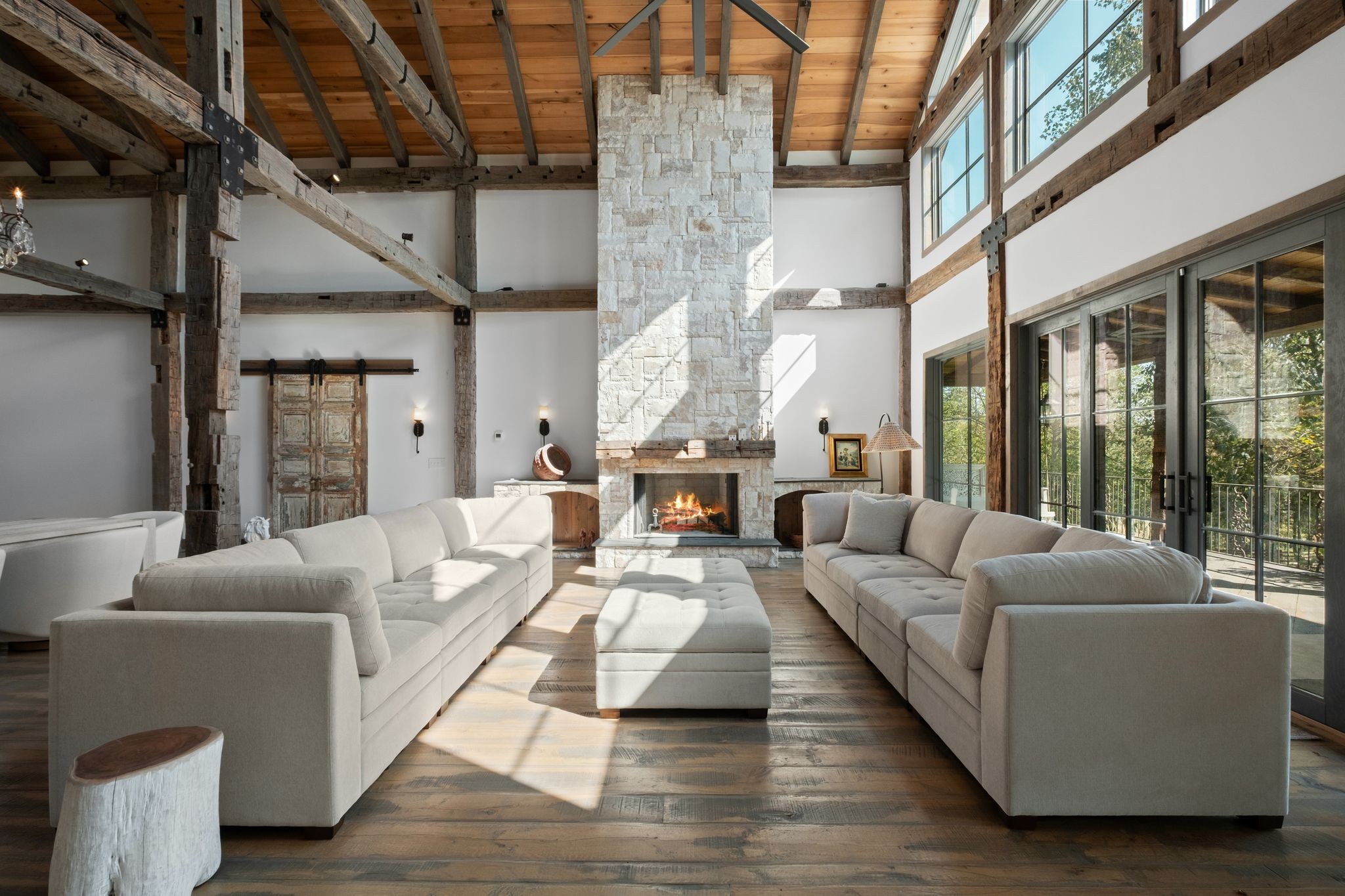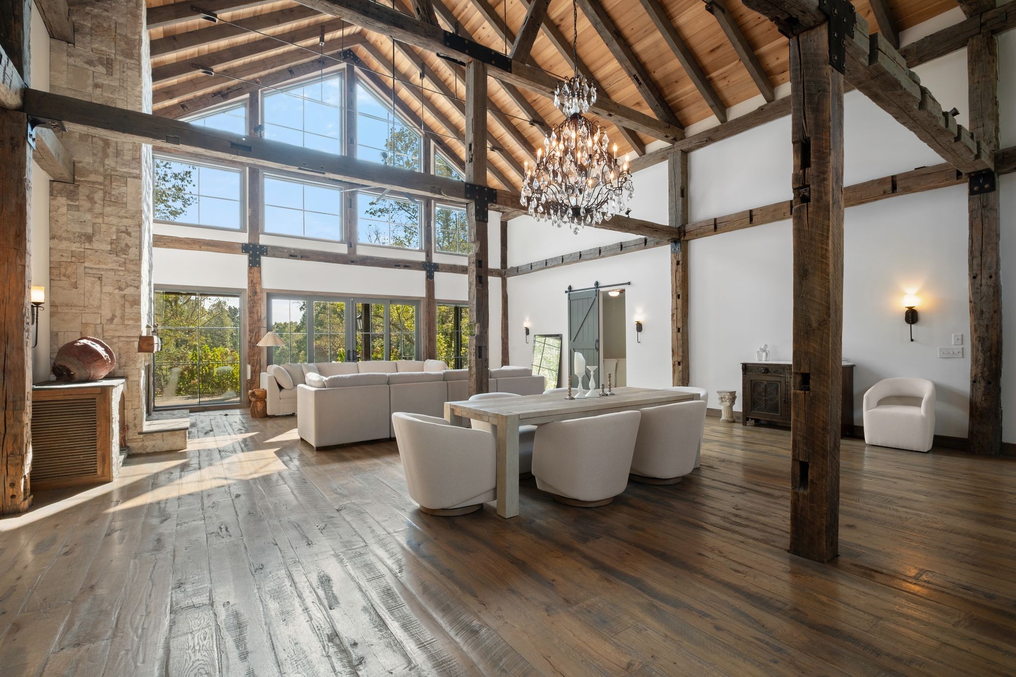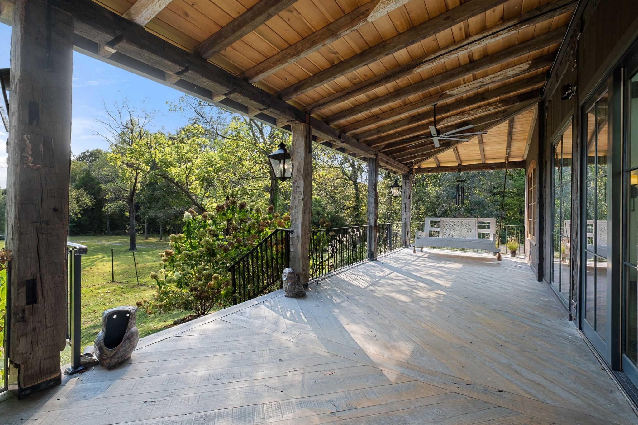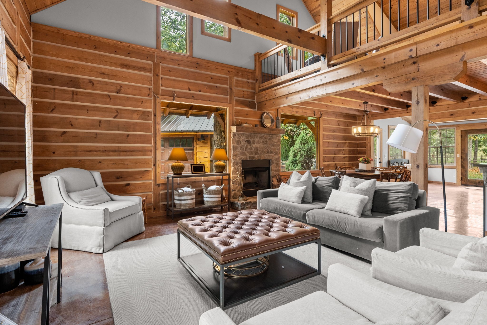 Captivating rustic retreat on 13.88 acres with two stunning homes (totaling 7975 SF) in the rolling hills of Tennessee. Upon entering the 5,371 SF primary residence, the ballroom inspired great room instantly takes your breath away with 28-foot ceilings, 150-year-old Montana timber beams, & abundant natural light that creates a space both grand & welcoming. The chef’s kitchen features Bertazzoni appliances & open counters designed for effortless cooking while family and friends gather nearby. The thoughtfully curated grand scullery adjacent to kitchen allows for larger-scale gatherings out on the terraces or in the great room. Terracotta stone and Restoration Hardware chandelier lighting throughout the home balances modern elegance with timeless beauty. Seventy-year-old haveli mansion Indian teak doors open into the main floor primary suite with a spa bath designed for relaxation. An additional first floor bedroom with full bath offers added space and flexibility, currently being used as a private office. The French Quarter floating staircase leads to three spacious bedrooms, including a secondary primary suite. The expansive studio on the second floor with its own full bathroom directly across, is flooded with natural light & can be used also as an additional bedroom, a home office, lounge or creative retreat space. Expansive 1,500 SF porches & terraces with a swim spa provide a perfect place to relax outdoors surrounded by nature or under the stars. Across from the primary residence, a charming 2604 SF second home with 3-bedroom, 2.5-bath is nestled on 6.88 acres. It features an expansive sunroom for morning coffee, a commercial-grade kitchen with Wolf appliances, downstairs primary & a peaceful backyard retreat with views of sweeping meadows-protected by The Tennessee Land Trust ensuring permanent privacy & quietude. Together, these homes create a private sanctuary where every space blends warmth, light & thoughtful design to embrace the beauty of country living.