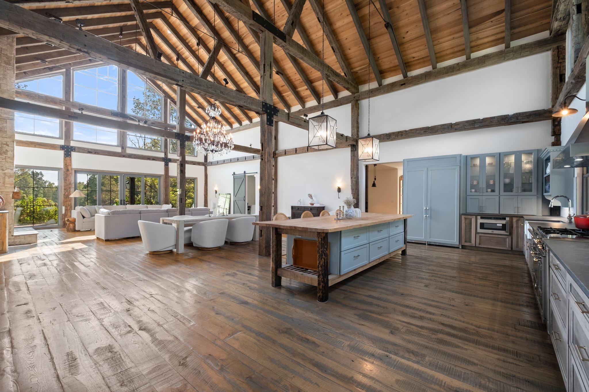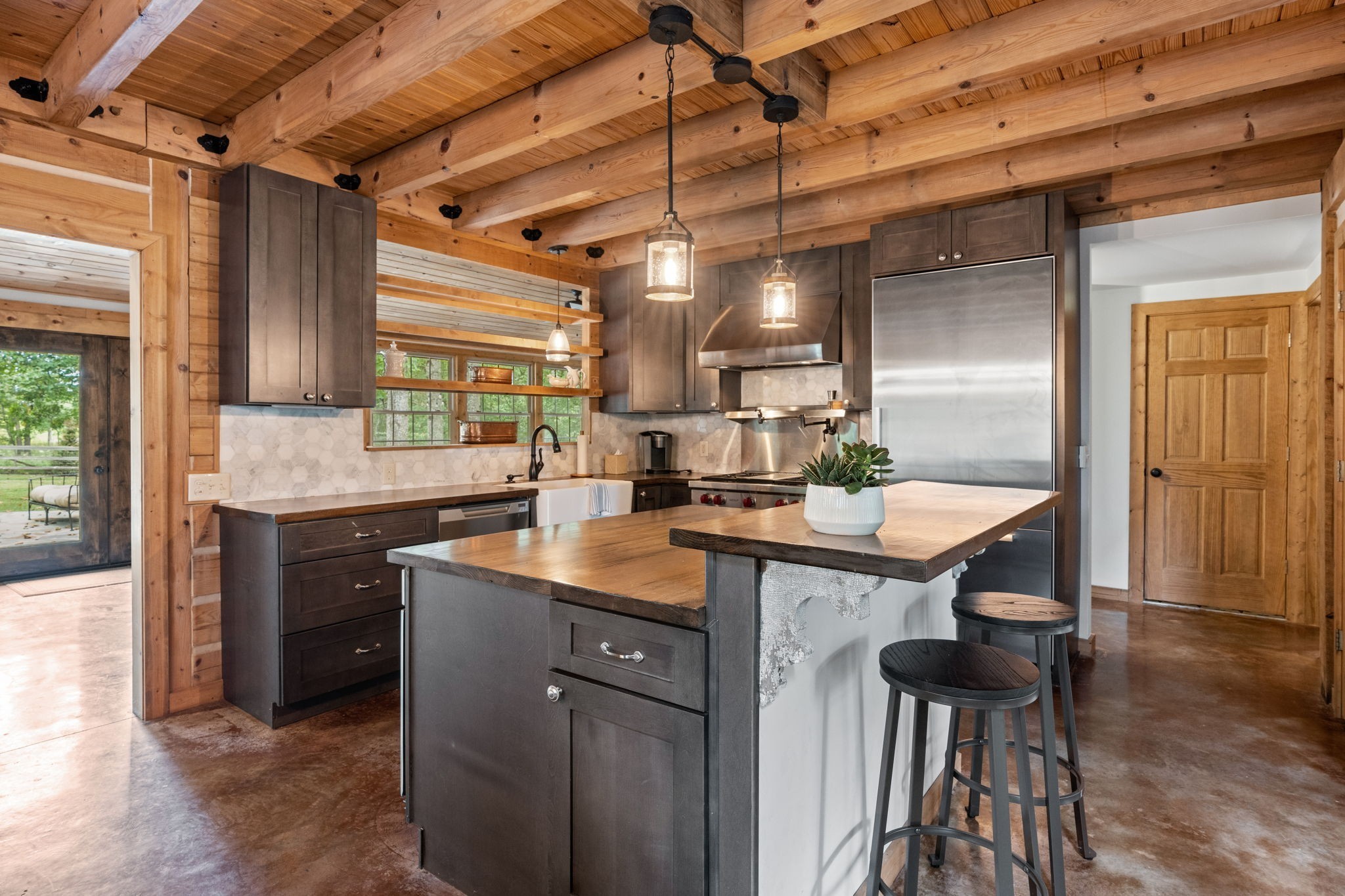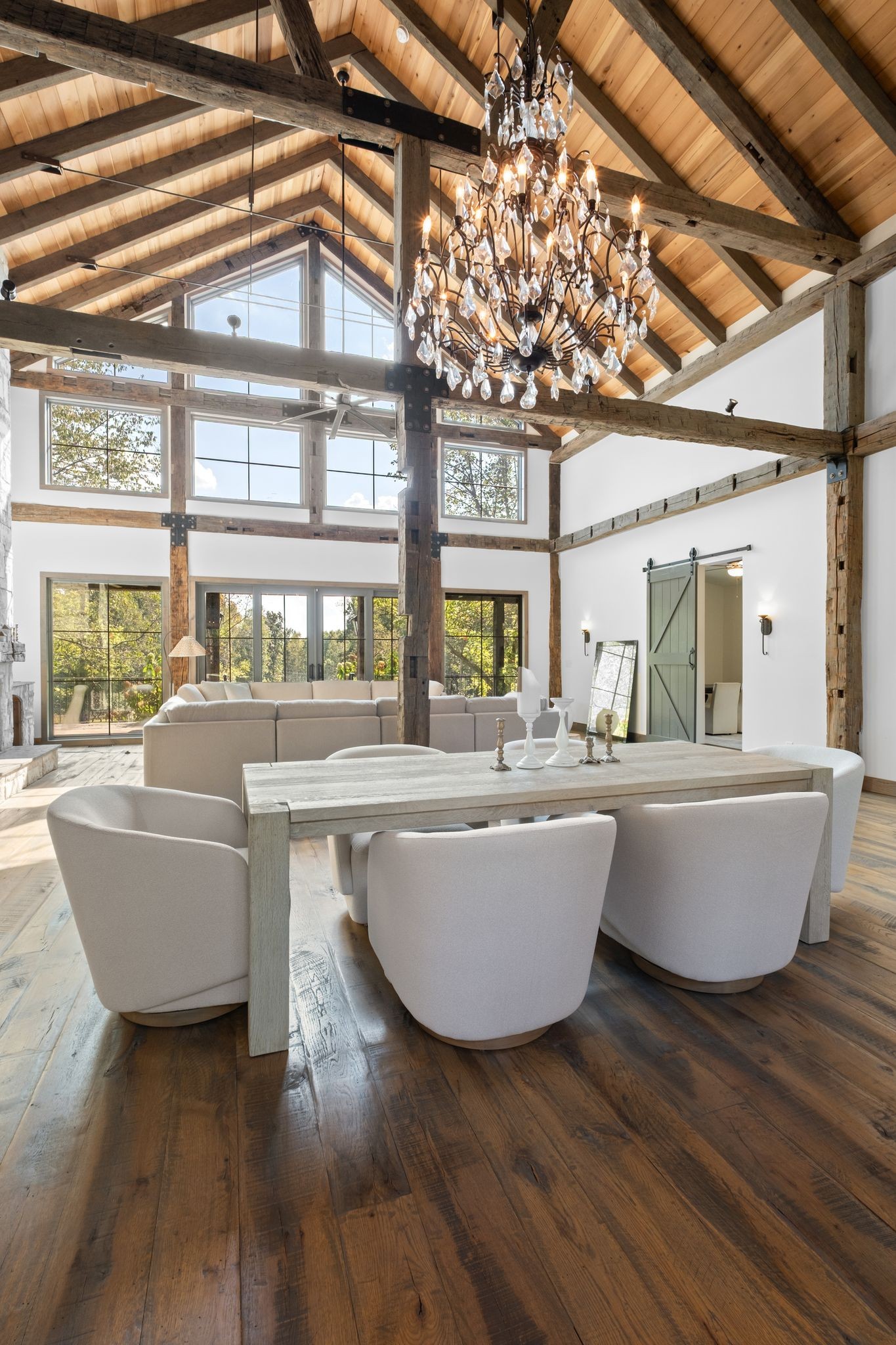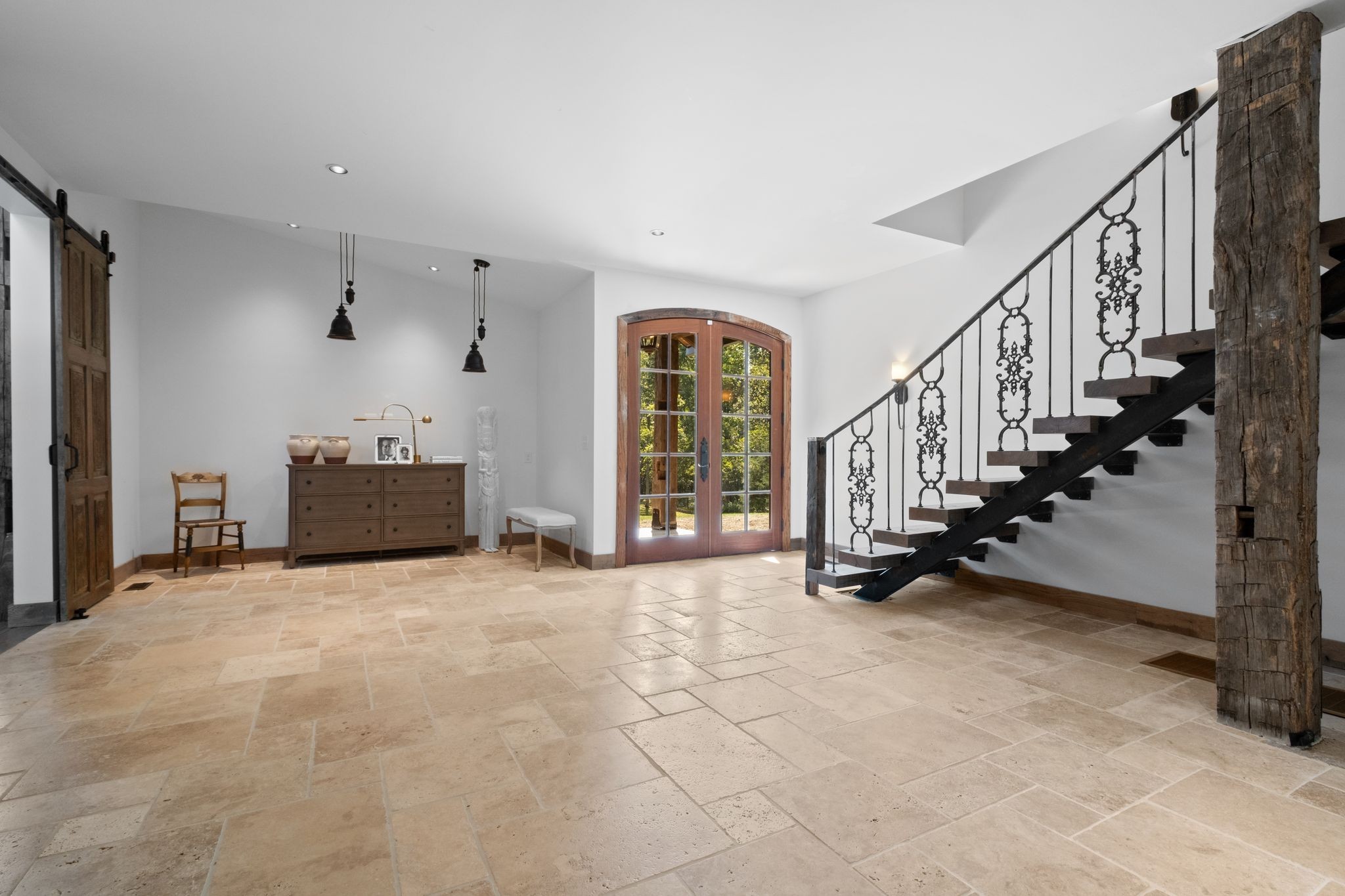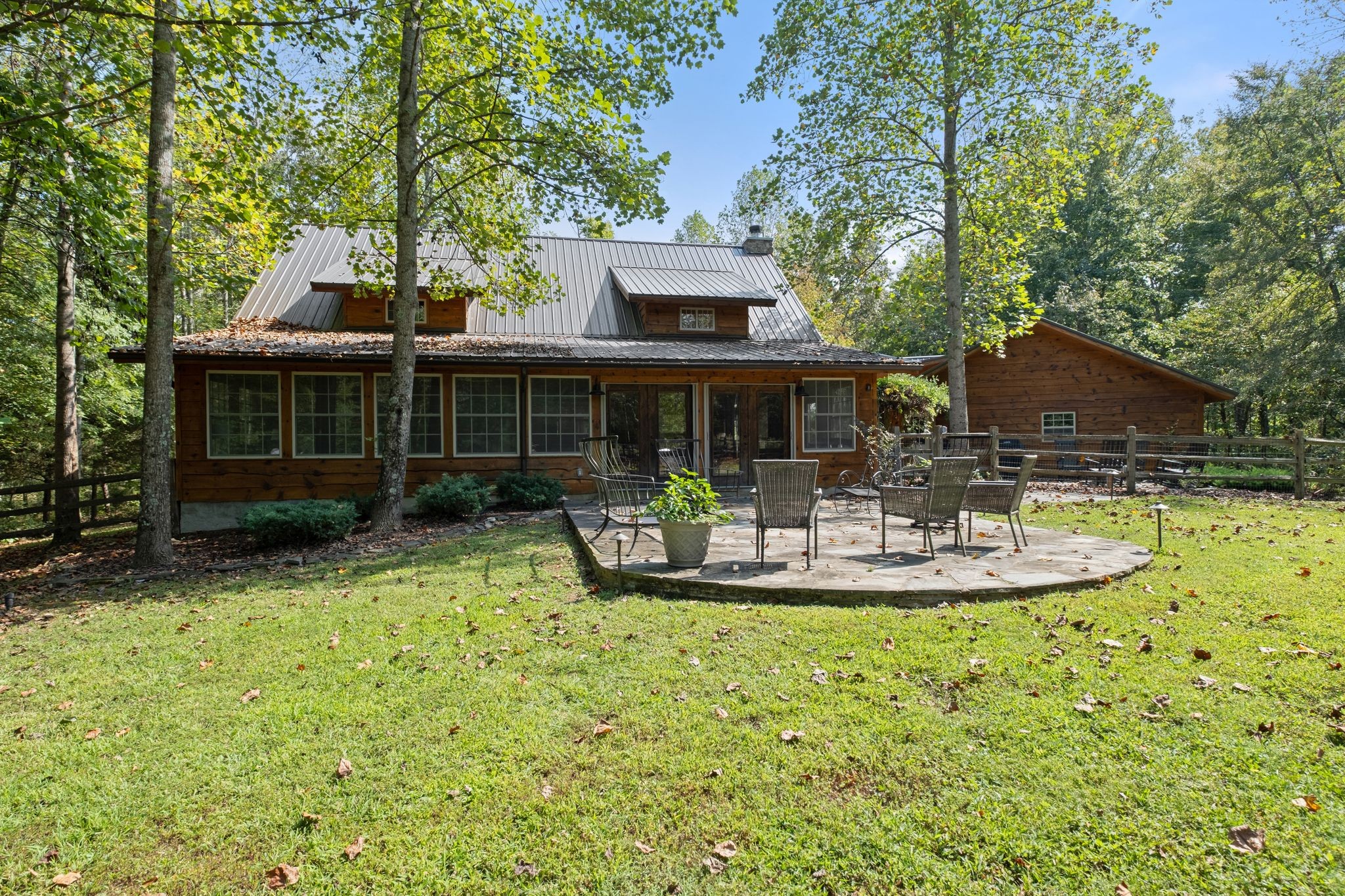 Captivating rustic retreat on 13.88 acres with two stunning homes (totaling 7975 SF) in the rolling hills of Tennessee. Upon entering the 5,371 SF primary residence, the ballroom inspired great room instantly takes your breath away with 28-foot ceilings, 150-year-old Montana timber beams, & abundant natural light that creates a space both grand & welcoming. The chef’s kitchen features Bertazzoni appliances & open counters designed for effortless cooking while family and friends gather nearby. The thoughtfully curated grand scullery adjacent to kitchen allows for larger-scale gatherings out on the terraces or in the great room. Terracotta stone and Restoration Hardware chandelier lighting throughout the home balances modern elegance with timeless beauty. Seventy-year-old haveli mansion Indian teak doors open into the main floor primary suite with a spa bath designed for relaxation. An additional first floor bedroom with full bath offers added space and flexibility, currently being used as a private office. The French Quarter floating staircase leads to three spacious bedrooms, including a secondary primary suite. The expansive studio on the second floor with its own full bathroom directly across, is flooded with natural light & can be used also as an additional bedroom, a home office, lounge or creative retreat space. Expansive 1,500 SF porches & terraces with a swim spa provide a perfect place to relax outdoors surrounded by nature or under the stars. Across from the primary residence, a charming 2604 SF second home with 3-bedroom, 2.5-bath is nestled on 6.88 acres. It features an expansive sunroom for morning coffee, a commercial-grade kitchen with Wolf appliances, downstairs primary & a peaceful backyard retreat with views of sweeping meadows-protected by The Tennessee Land Trust ensuring permanent privacy & quietude. Together, these homes create a private sanctuary where every space blends warmth, light & thoughtful design to embrace the beauty of country living.