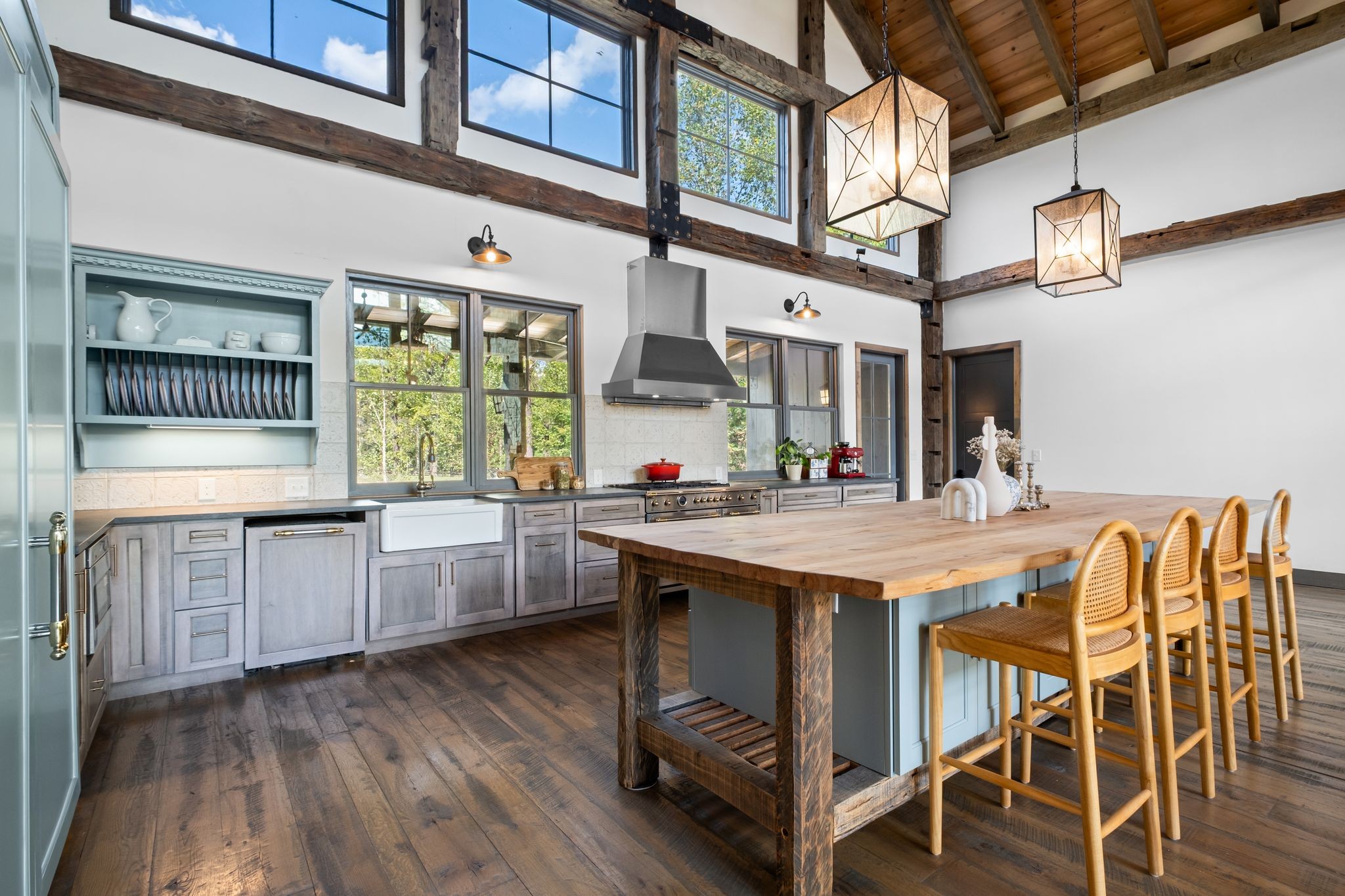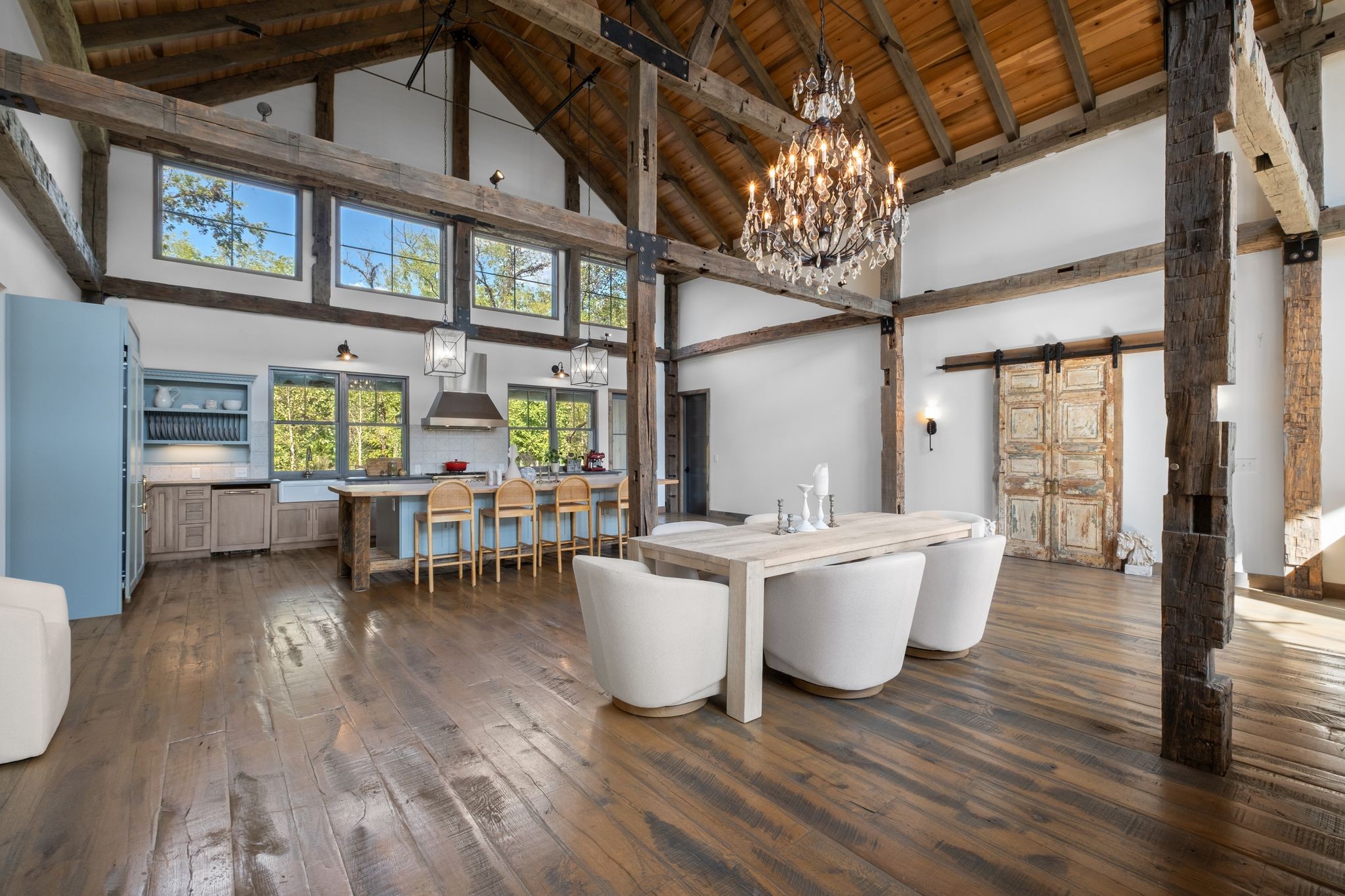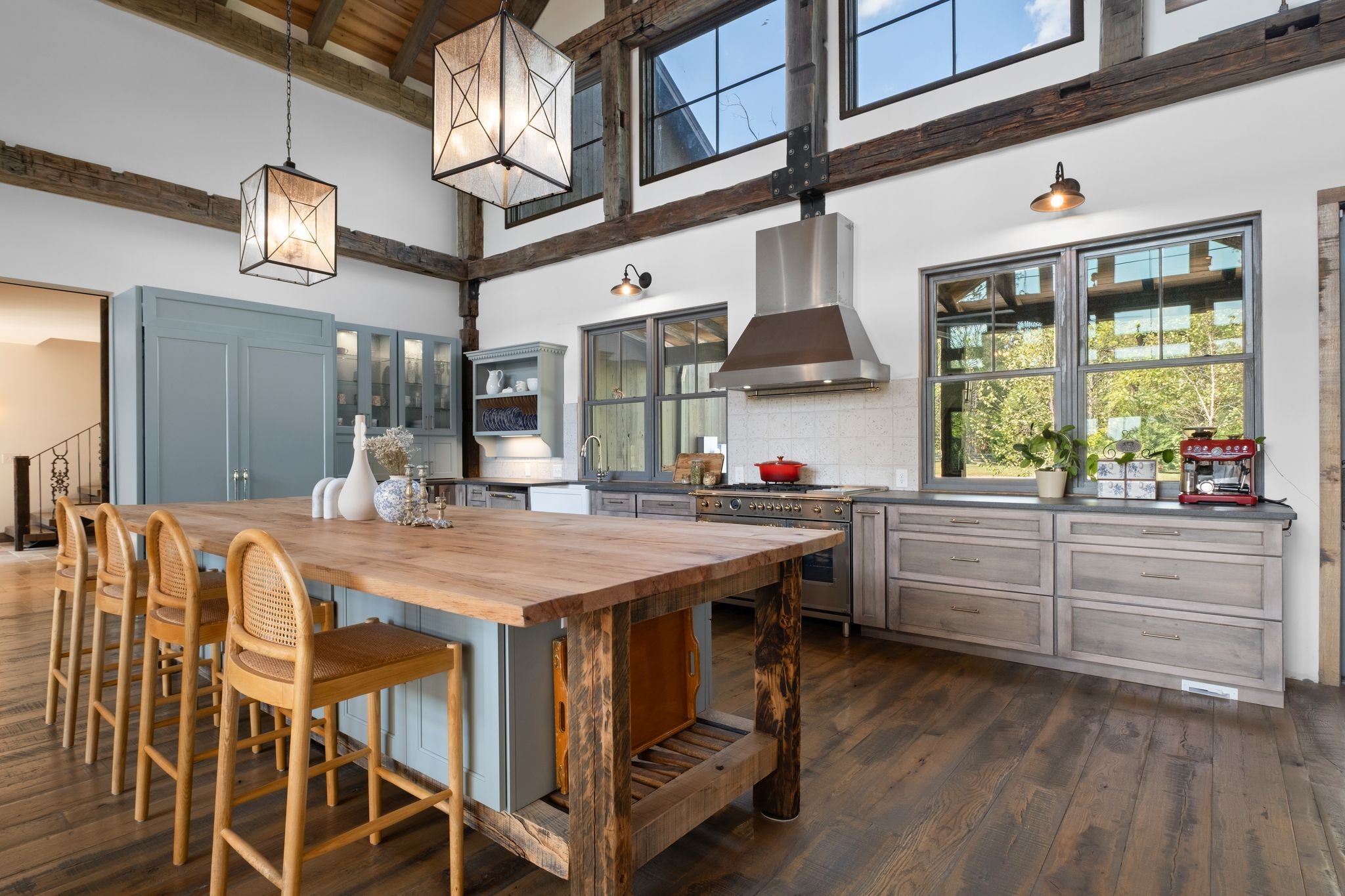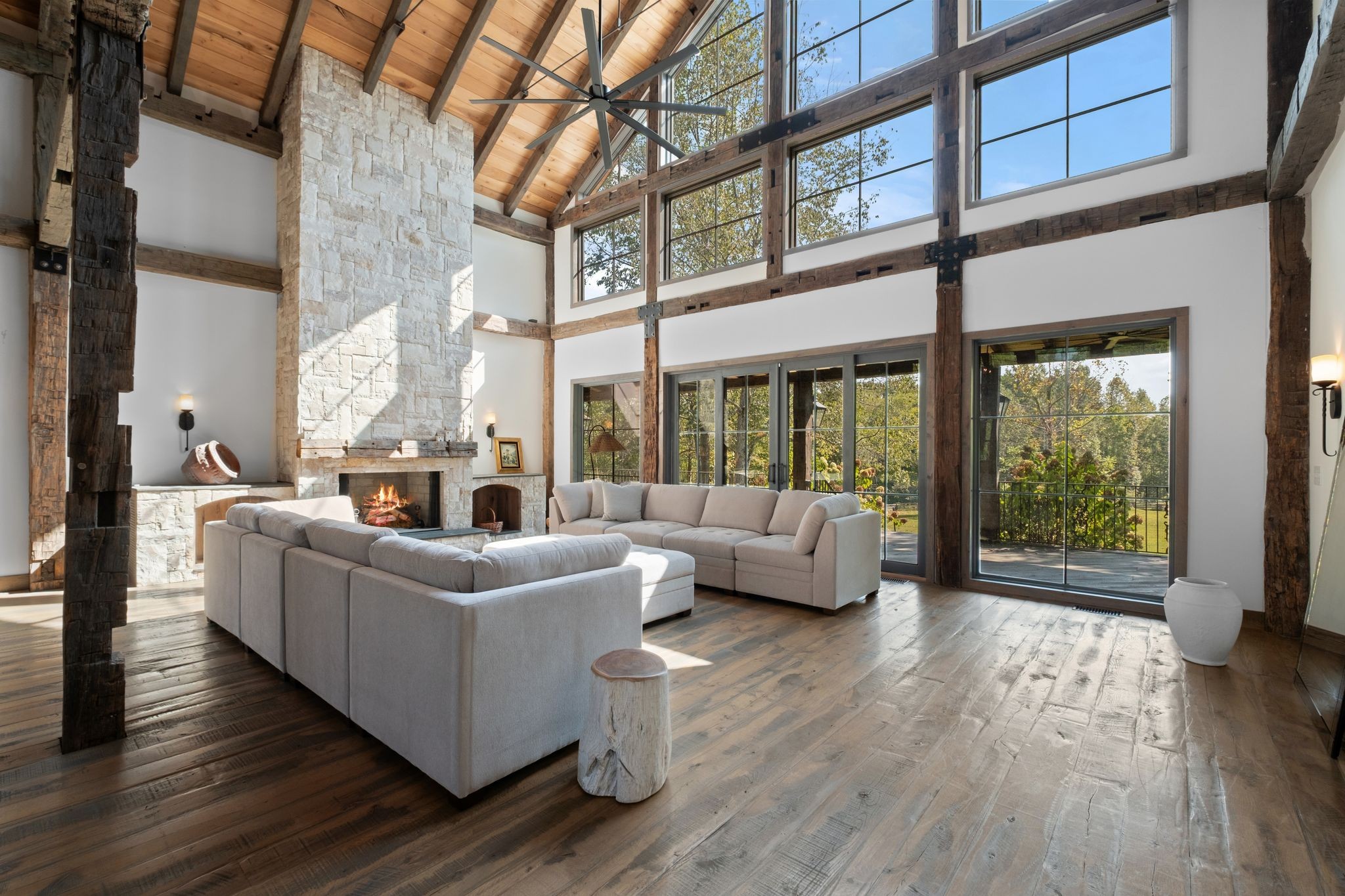 Captivating rustic retreat on 13.88 acres with two stunning homes (totaling 7975 SF) in the rolling hills of Tennessee. Upon entering the 5,371 SF primary residence, the ballroom inspired great room instantly takes your breath away with 28-foot ceilings, 150-year-old Montana timber beams, & abundant natural light that creates a space both grand & welcoming. The chef’s kitchen features Bertazzoni appliances & open counters designed for effortless cooking while family and friends gather nearby. The thoughtfully curated grand scullery adjacent to kitchen allows for larger-scale gatherings out on the terraces or in the great room. Terracotta stone and Restoration Hardware chandelier lighting throughout the home balances modern elegance with timeless beauty. Seventy-year-old haveli mansion Indian teak doors open into the main floor primary suite with a spa bath designed for relaxation. An additional first floor bedroom with full bath offers added space and flexibility, currently being used as a private office. The French Quarter floating staircase leads to three spacious bedrooms, including a secondary primary suite. The expansive studio on the second floor with its own full bathroom directly across, is flooded with natural light & can be used also as an additional bedroom, a home office, lounge or creative retreat space. Expansive 1,500 SF porches & terraces with a swim spa provide a perfect place to relax outdoors surrounded by nature or under the stars. Across from the primary residence, a charming 2604 SF second home with 3-bedroom, 2.5-bath is nestled on 6.88 acres. It features an expansive sunroom for morning coffee, a commercial-grade kitchen with Wolf appliances, downstairs primary & a peaceful backyard retreat with views of sweeping meadows-protected by The Tennessee Land Trust ensuring permanent privacy & quietude. Together, these homes create a private sanctuary where every space blends warmth, light & thoughtful design to embrace the beauty of country living.