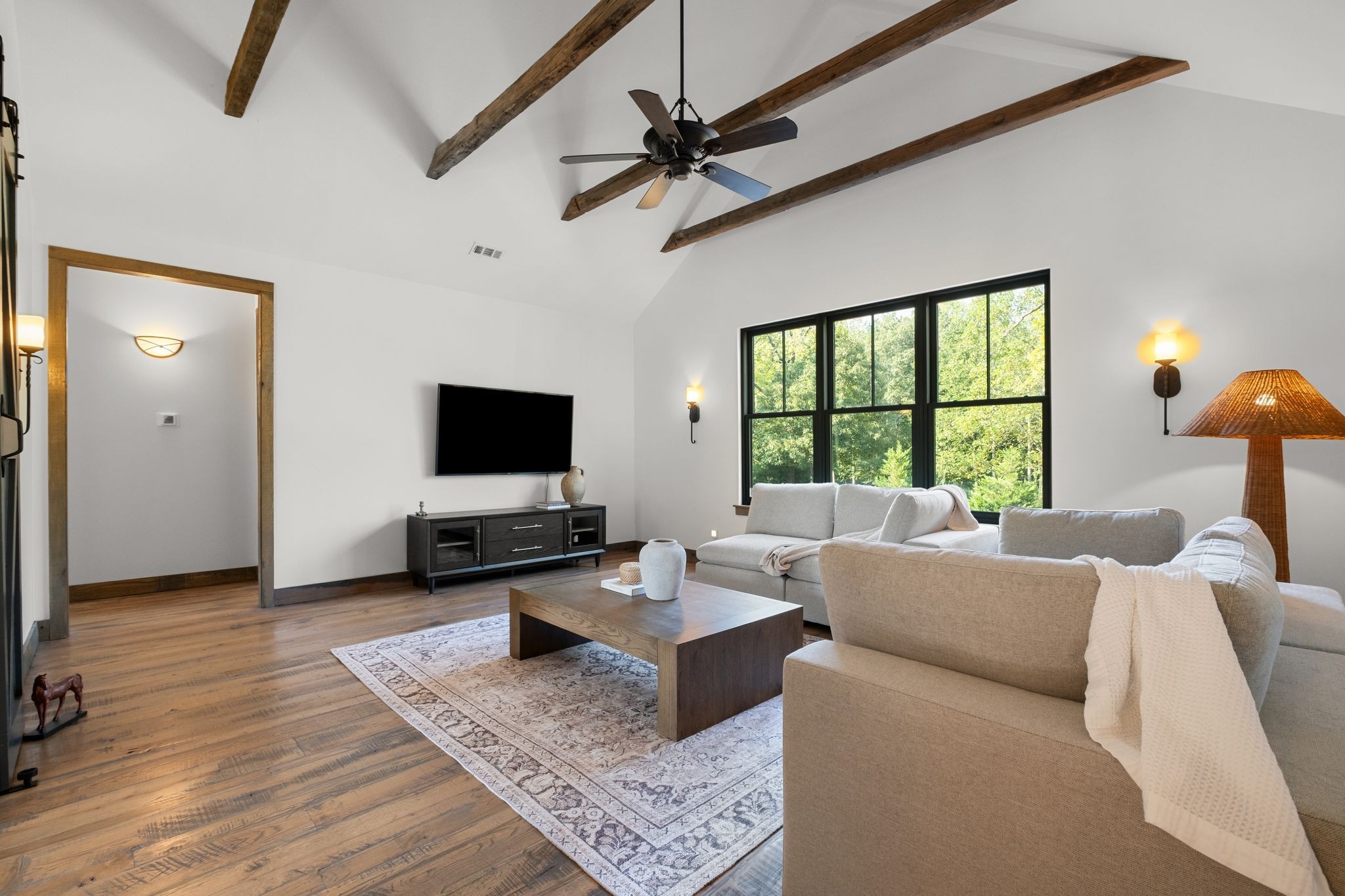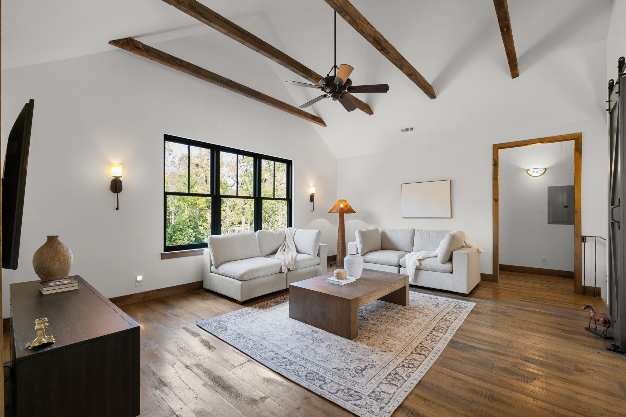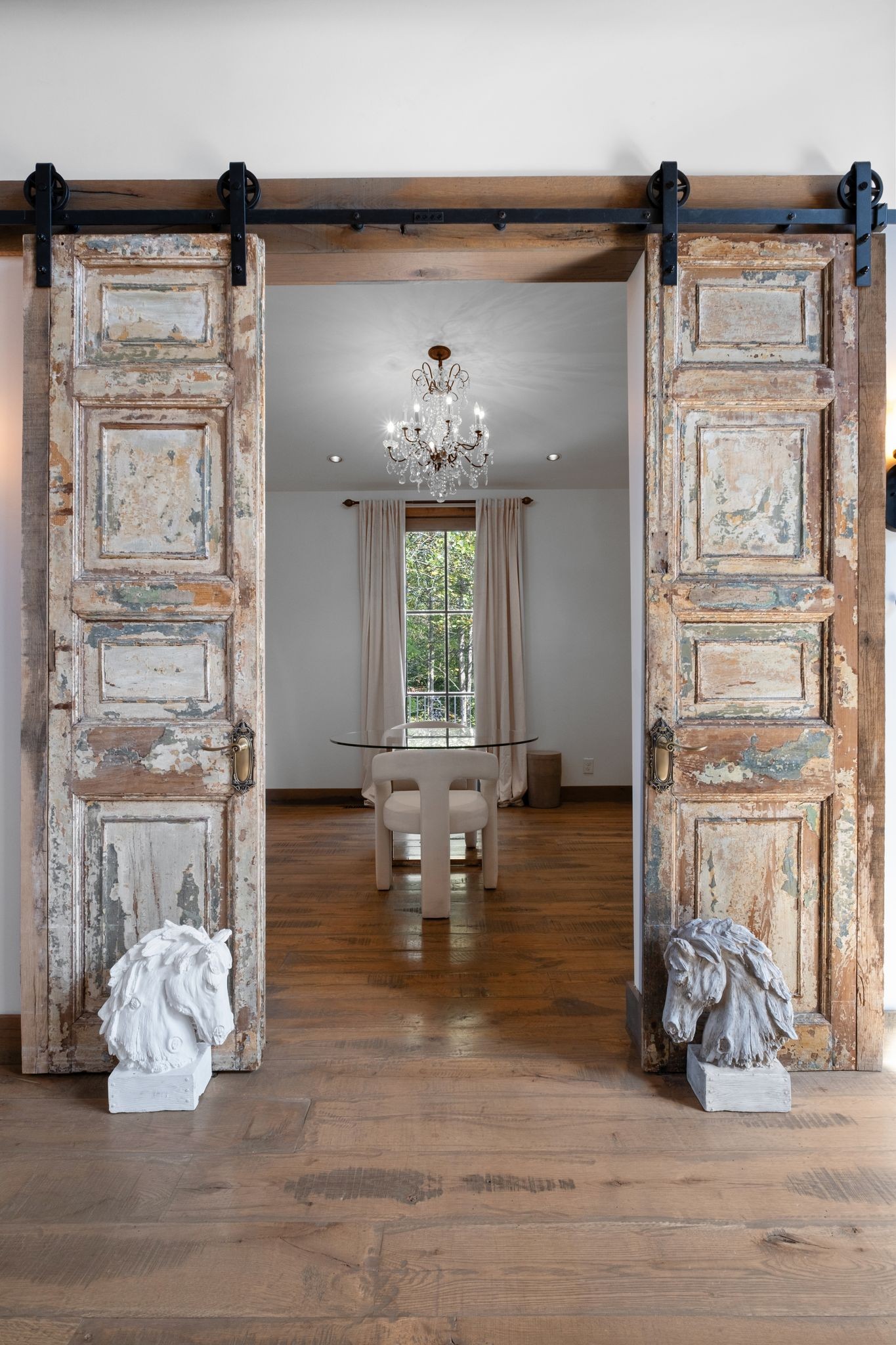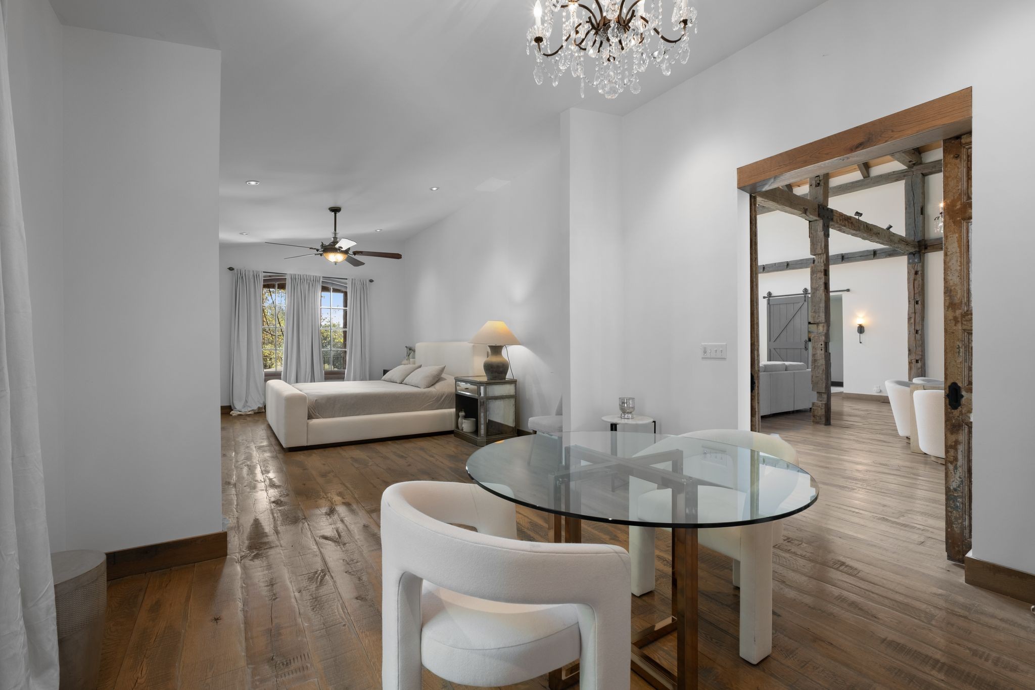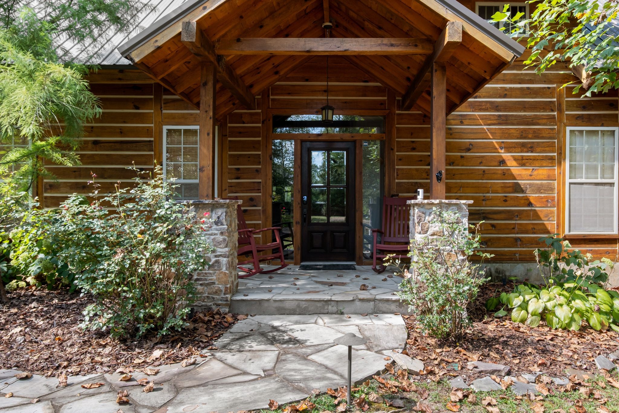 Captivating rustic retreat on 13.88 acres with two stunning homes (totaling 7975 SF) in the rolling hills of Tennessee. Upon entering the 5,371 SF primary residence, the ballroom inspired great room instantly takes your breath away with 28-foot ceilings, 150-year-old Montana timber beams, & abundant natural light that creates a space both grand & welcoming. The chef’s kitchen features Bertazzoni appliances & open counters designed for effortless cooking while family and friends gather nearby. The thoughtfully curated grand scullery adjacent to kitchen allows for larger-scale gatherings out on the terraces or in the great room. Terracotta stone and Restoration Hardware chandelier lighting throughout the home balances modern elegance with timeless beauty. Seventy-year-old haveli mansion Indian teak doors open into the main floor primary suite with a spa bath designed for relaxation. An additional first floor bedroom with full bath offers added space and flexibility, currently being used as a private office. The French Quarter floating staircase leads to three spacious bedrooms, including a secondary primary suite. The expansive studio on the second floor with its own full bathroom directly across, is flooded with natural light & can be used also as an additional bedroom, a home office, lounge or creative retreat space. Expansive 1,500 SF porches & terraces with a swim spa provide a perfect place to relax outdoors surrounded by nature or under the stars. Across from the primary residence, a charming 2604 SF second home with 3-bedroom, 2.5-bath is nestled on 6.88 acres. It features an expansive sunroom for morning coffee, a commercial-grade kitchen with Wolf appliances, downstairs primary & a peaceful backyard retreat with views of sweeping meadows-protected by The Tennessee Land Trust ensuring permanent privacy & quietude. Together, these homes create a private sanctuary where every space blends warmth, light & thoughtful design to embrace the beauty of country living.