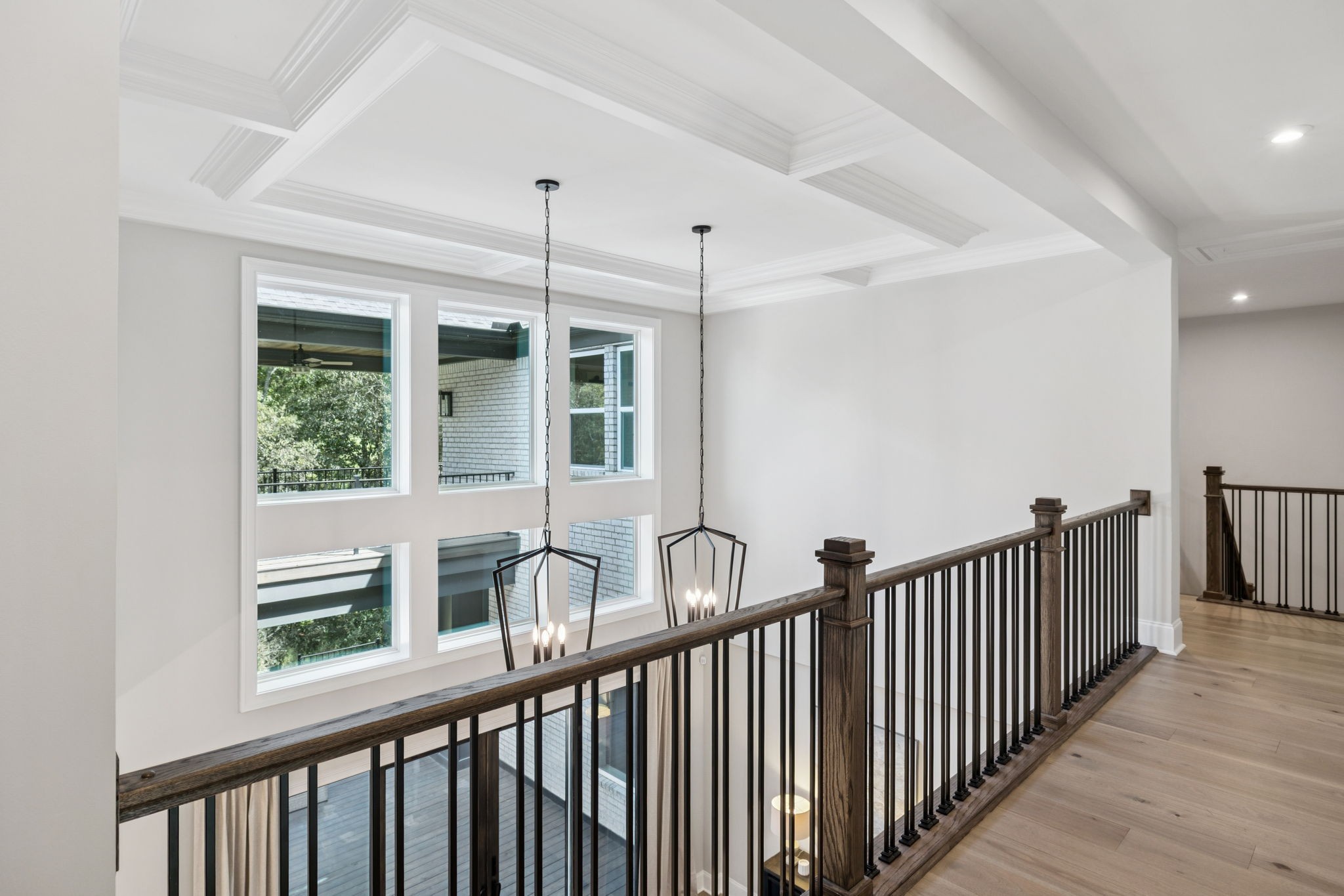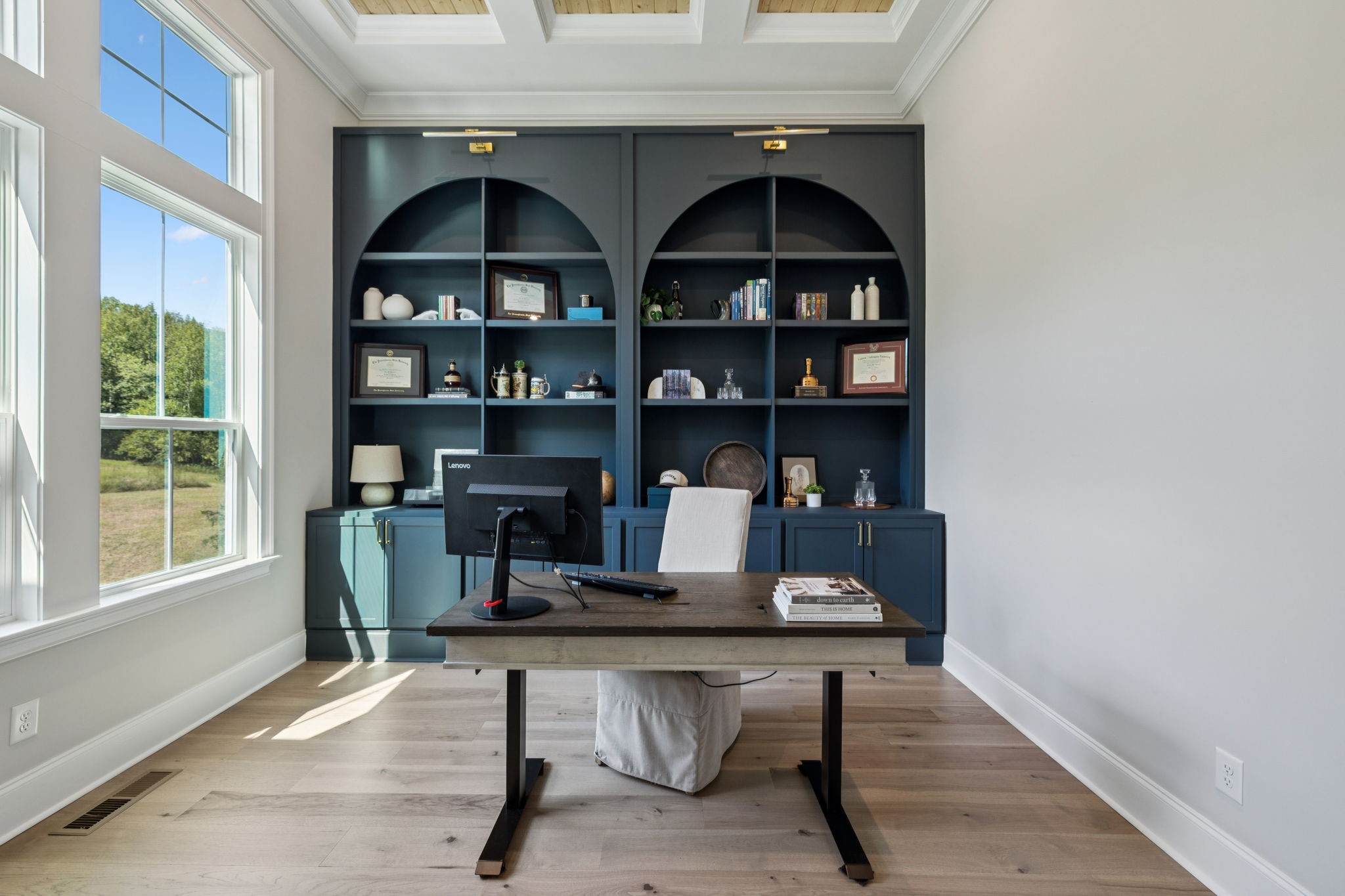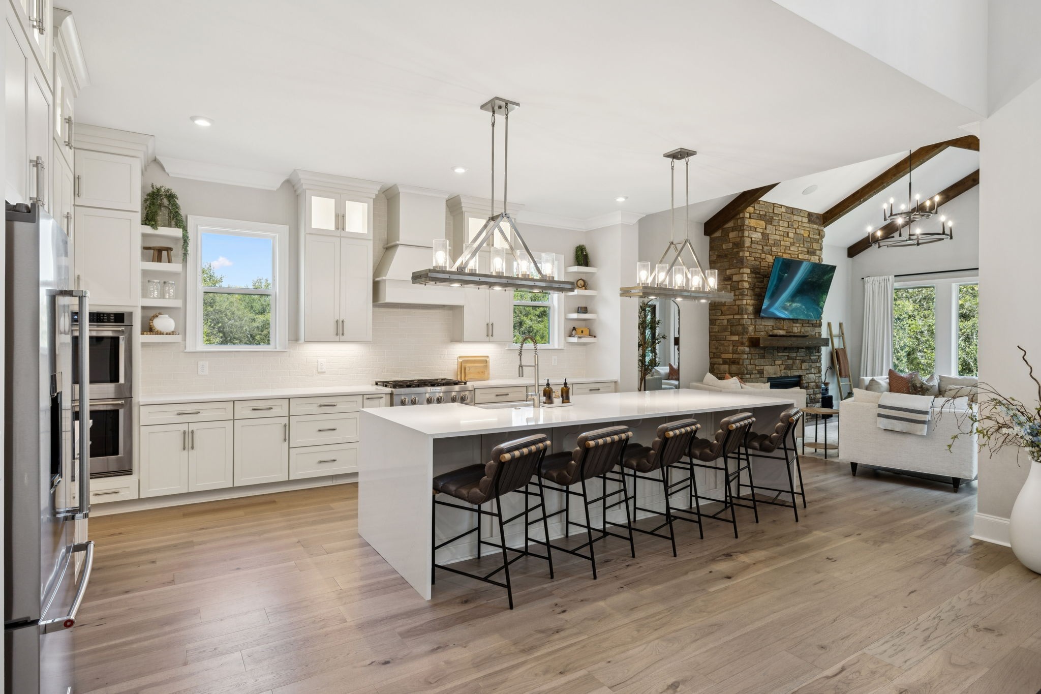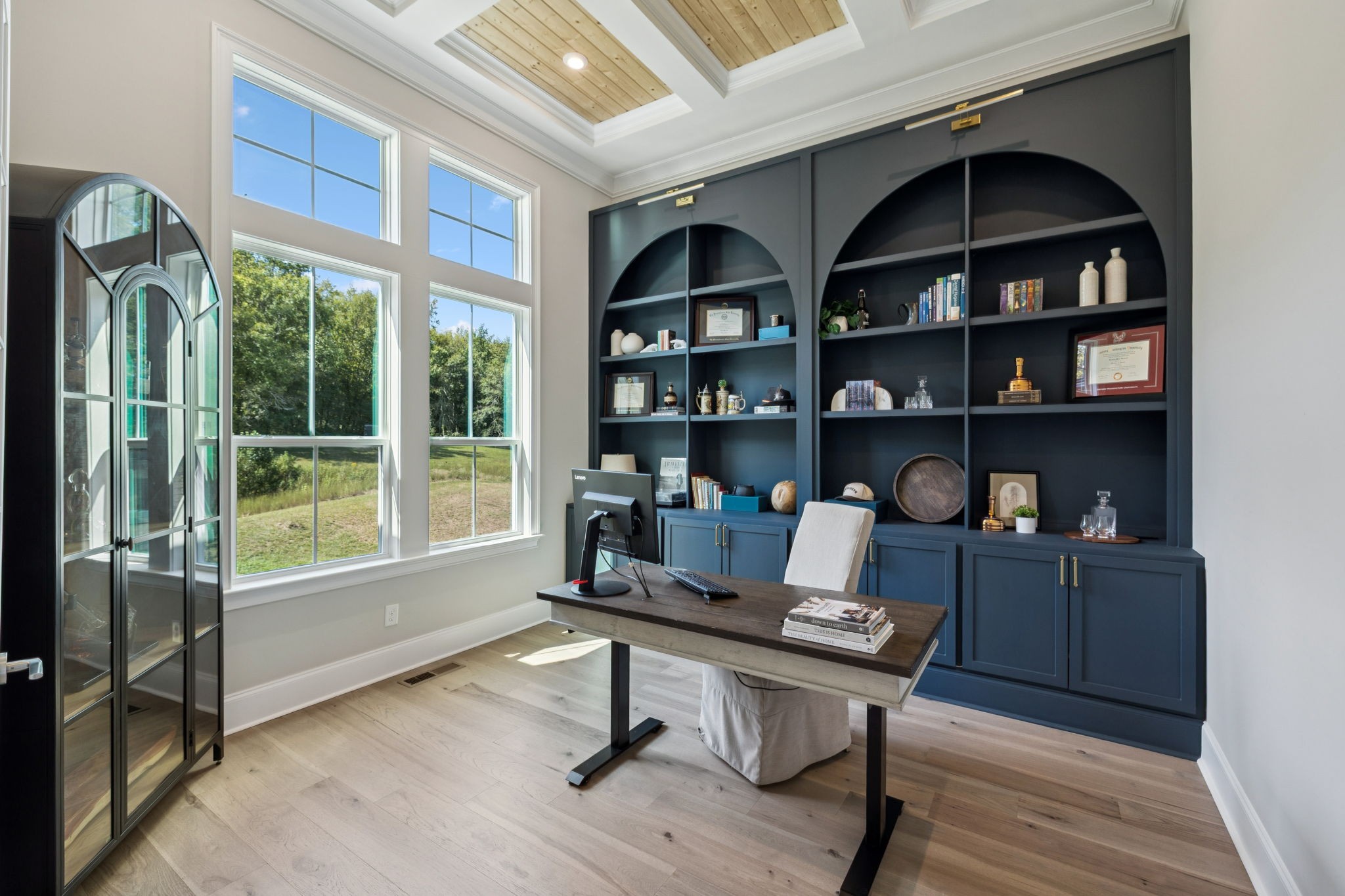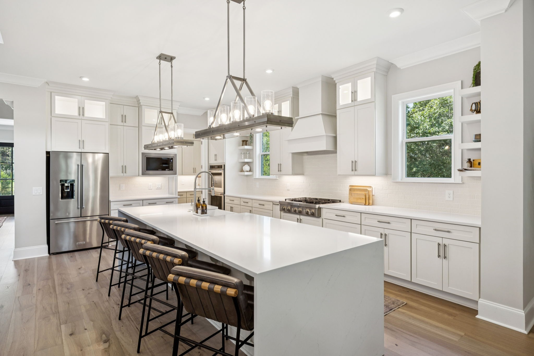 The main level offers a grand two-story foyer and dining room, an inviting office with glass French doors, and a seamless flow between the living room and chef’s kitchen. Custom cabinetry, coffered wood-detailed ceilings, and wide-plank hardwood floors highlight the attention to detail. The spacious walk-in pantry, mudroom, and oversized laundry are designed with everyday convenience in mind.
