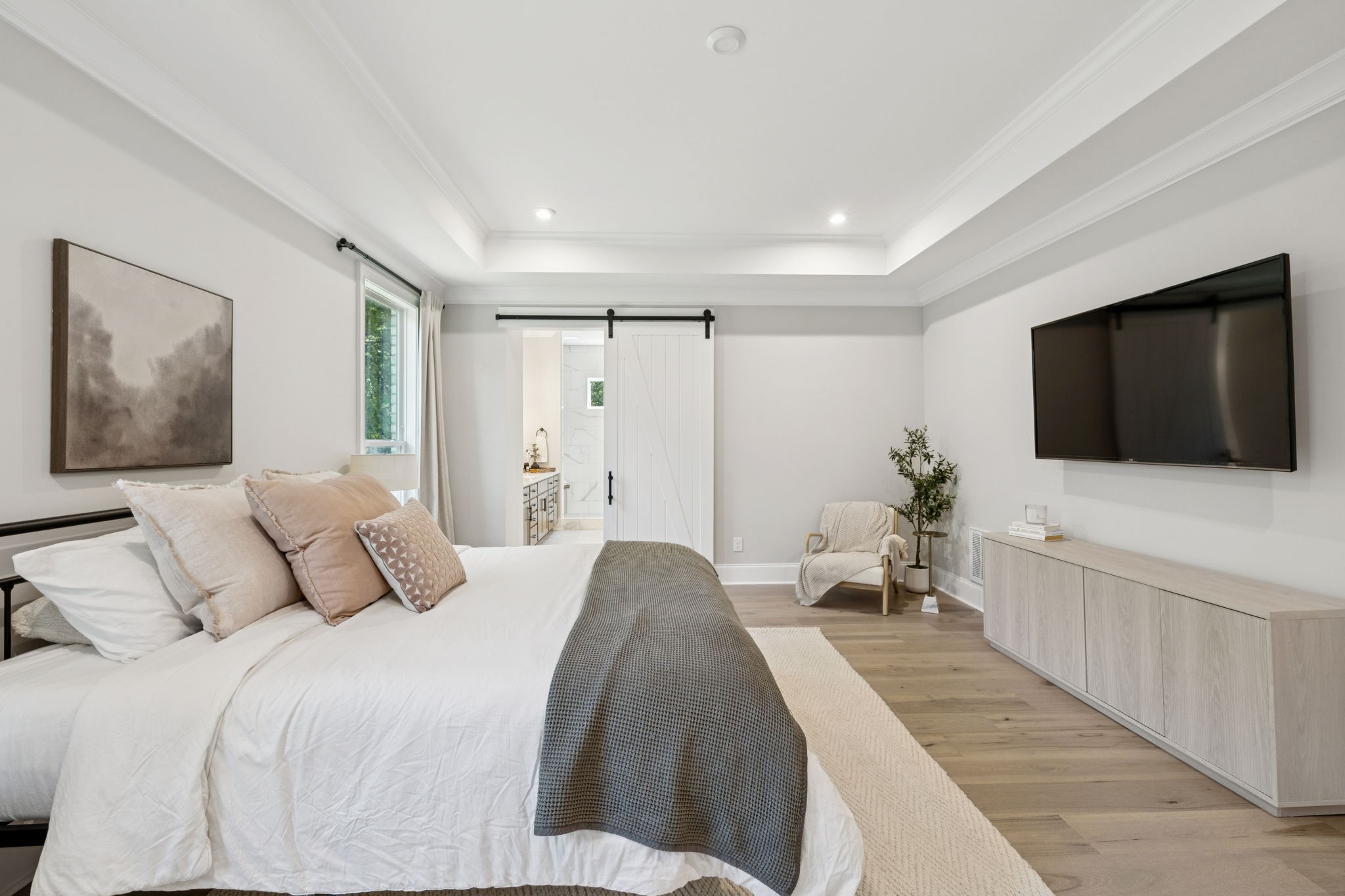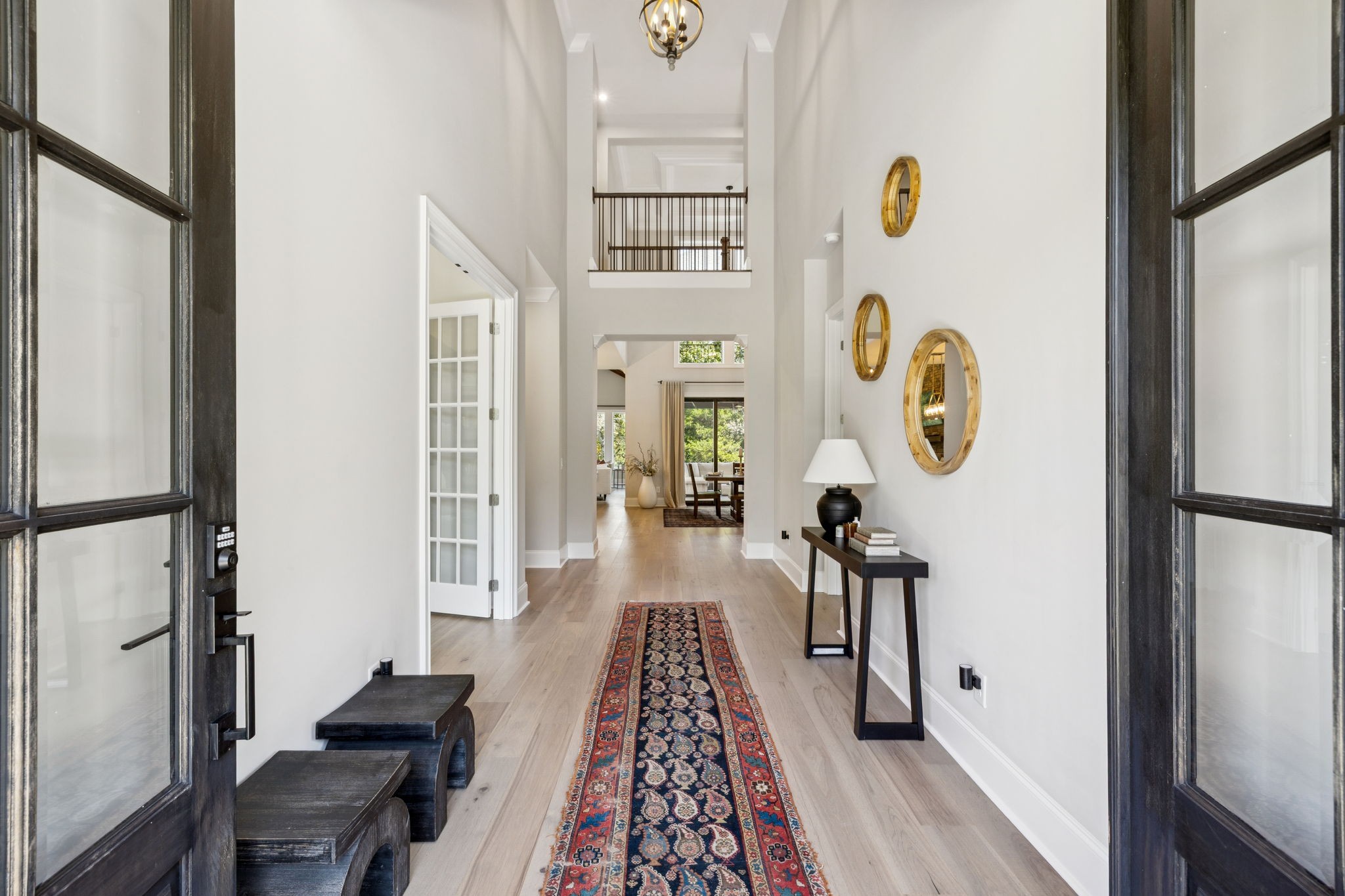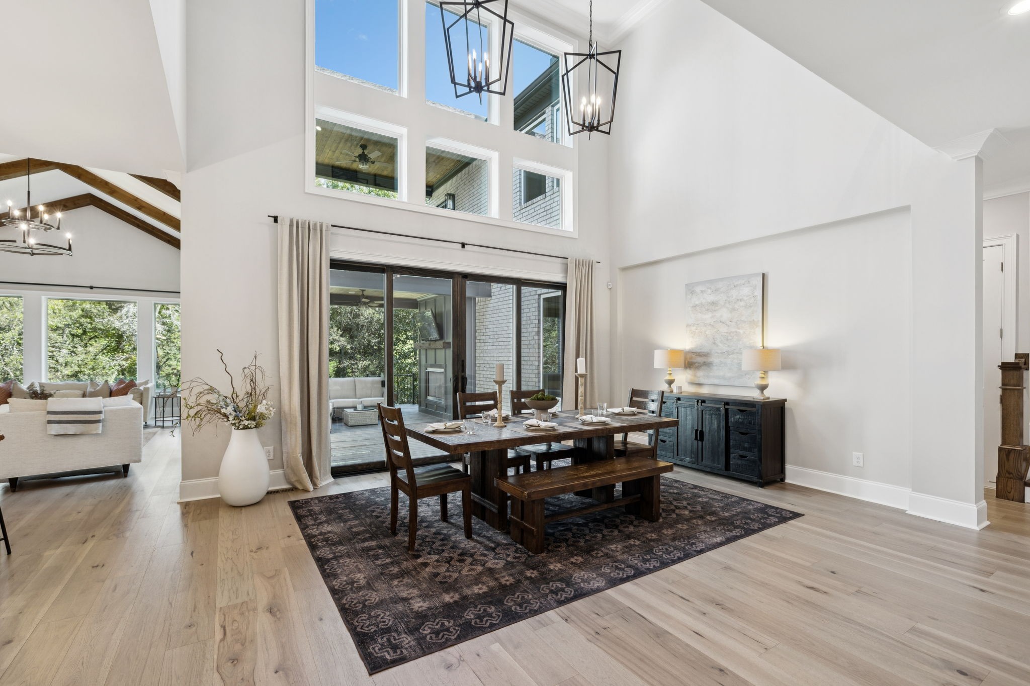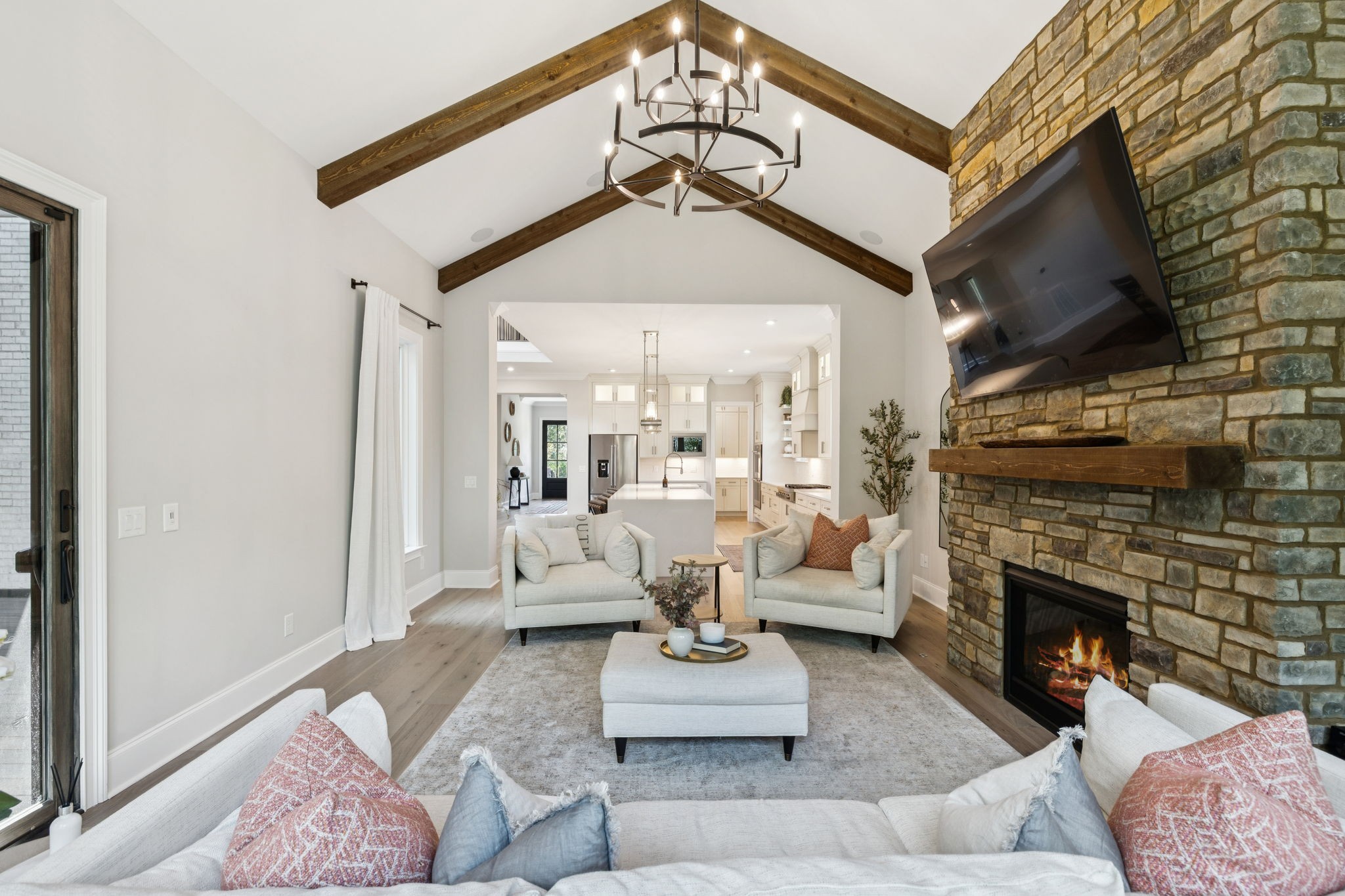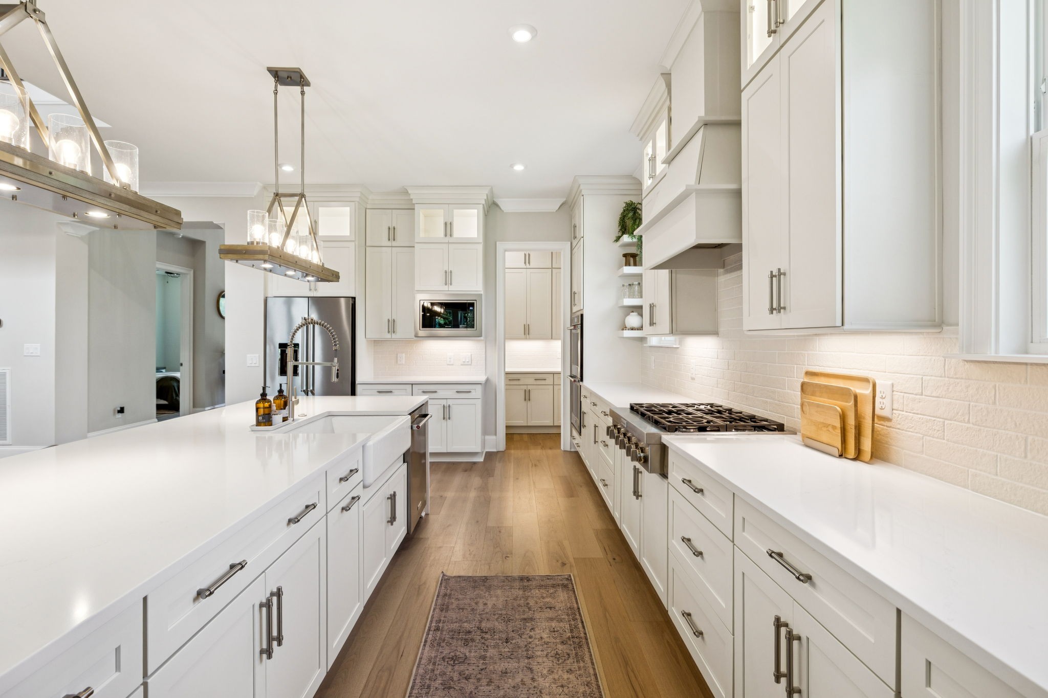 The main level offers a grand two-story foyer and dining room, an inviting office with glass French doors, and a seamless flow between the living room and chef’s kitchen. Custom cabinetry, coffered wood-detailed ceilings, and wide-plank hardwood floors highlight the attention to detail. The spacious walk-in pantry, mudroom, and oversized laundry are designed with everyday convenience in mind.