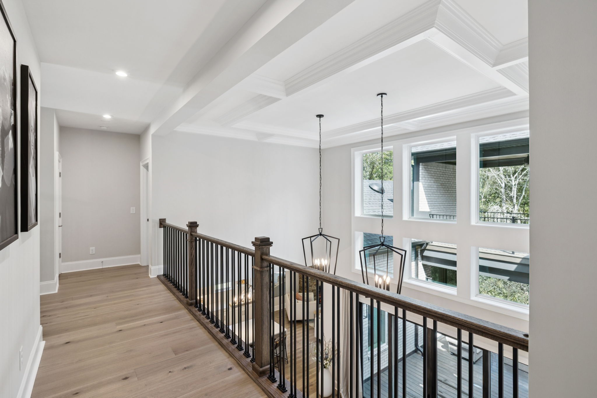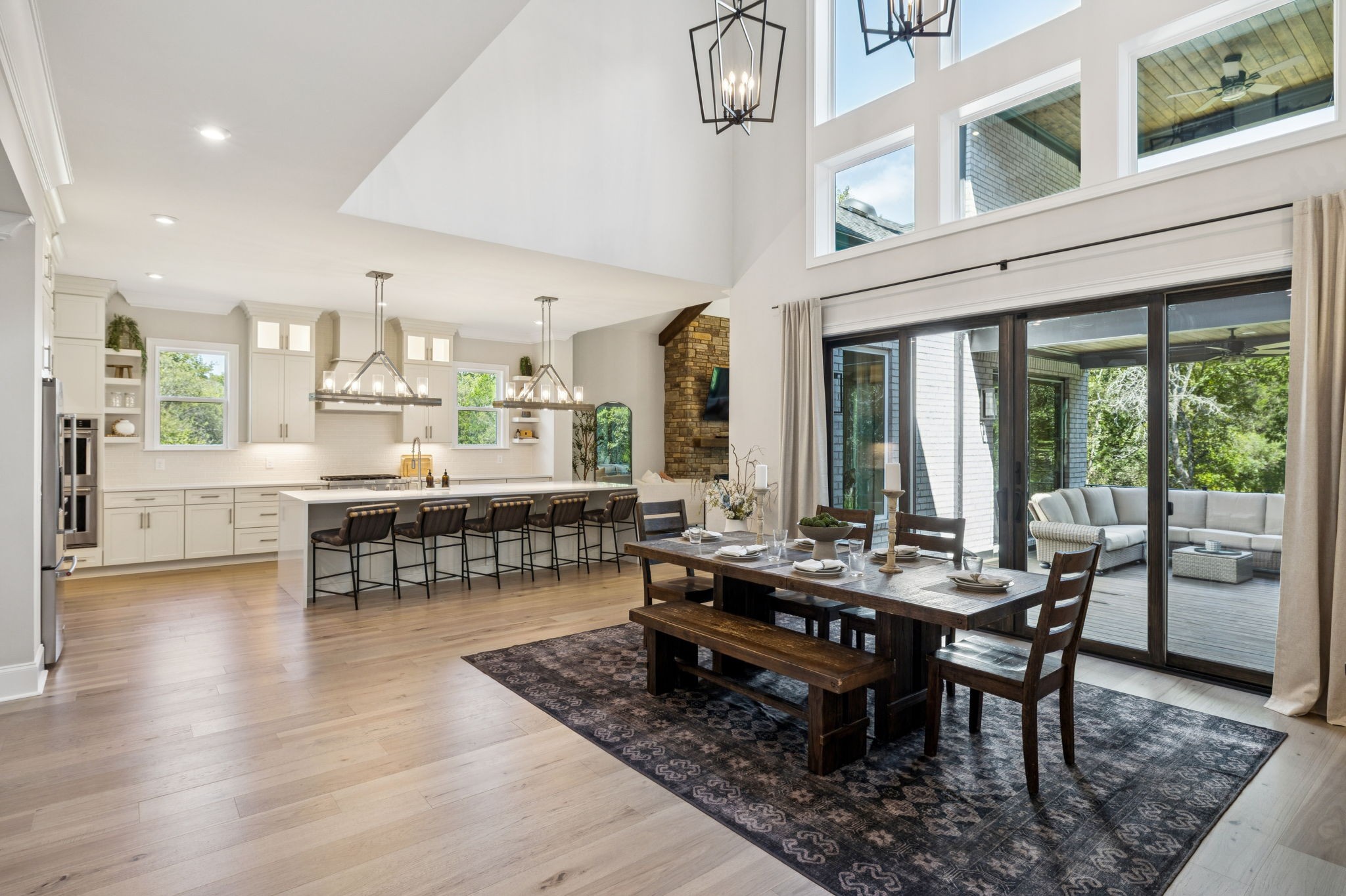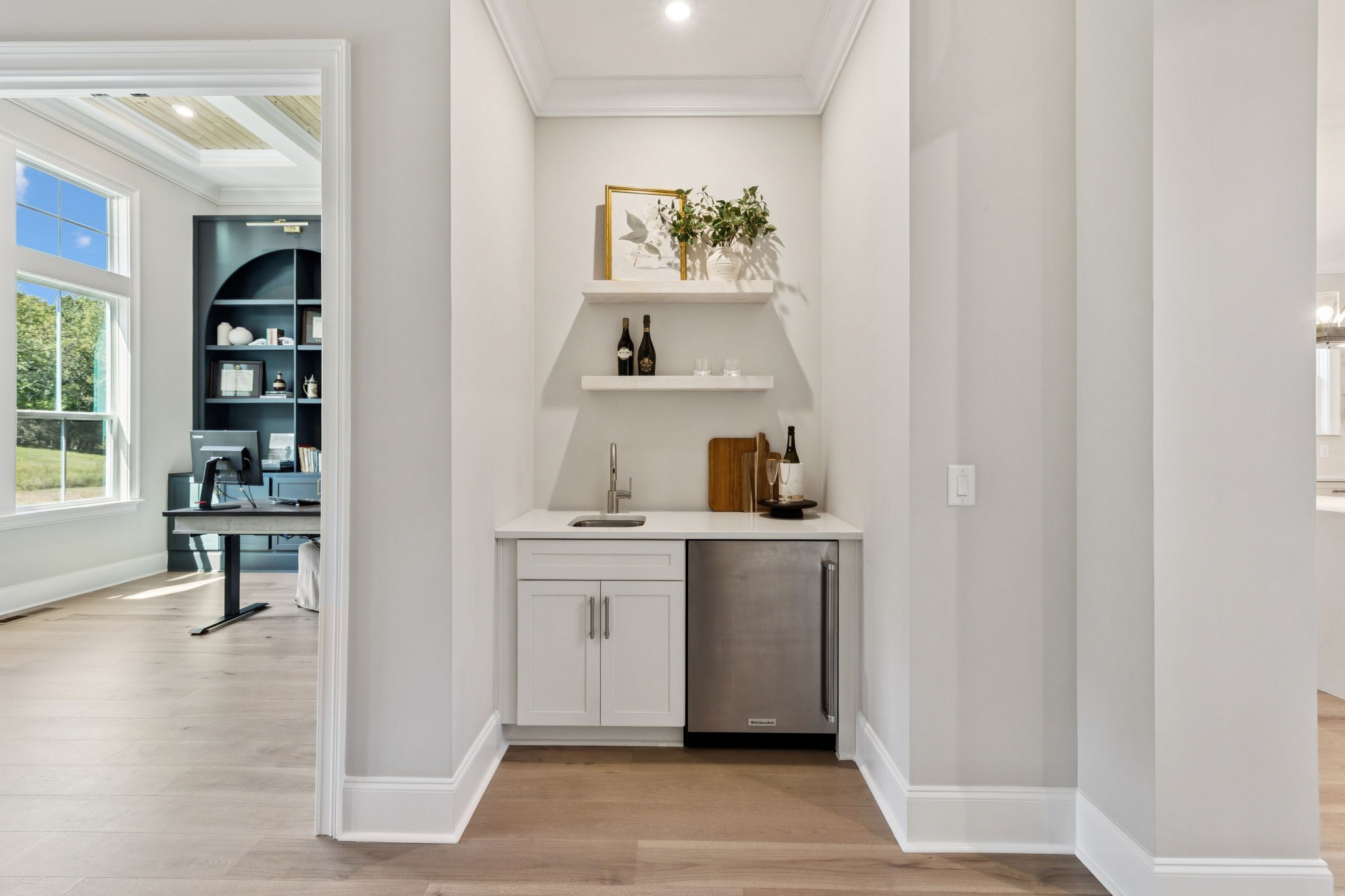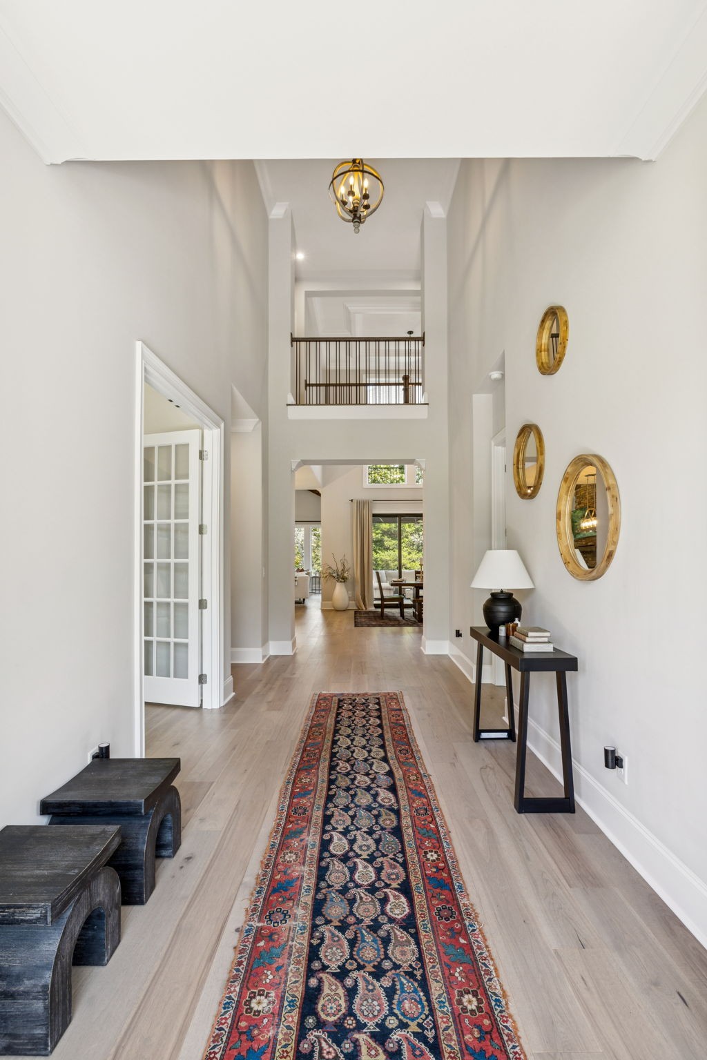 The main level offers a grand two-story foyer and dining room, an inviting office with glass French doors, and a seamless flow between the living room and chef’s kitchen. Custom cabinetry, coffered wood-detailed ceilings, and wide-plank hardwood floors highlight the attention to detail. The spacious walk-in pantry, mudroom, and oversized laundry are designed with everyday convenience in mind.