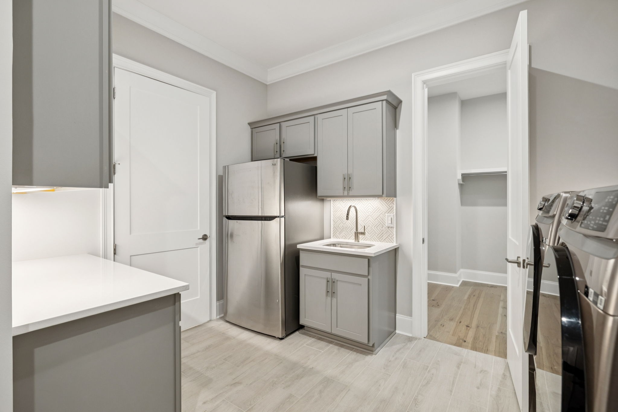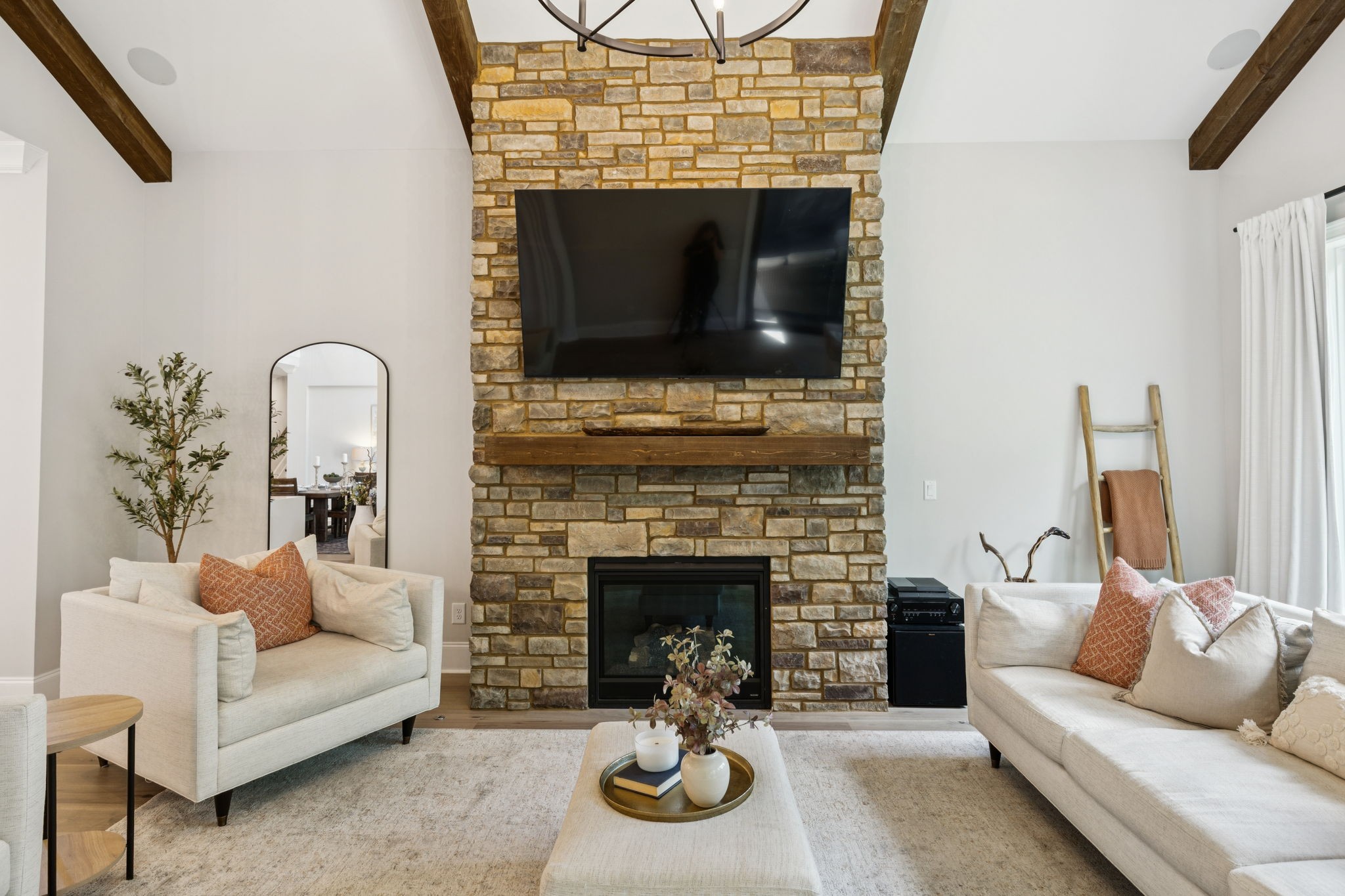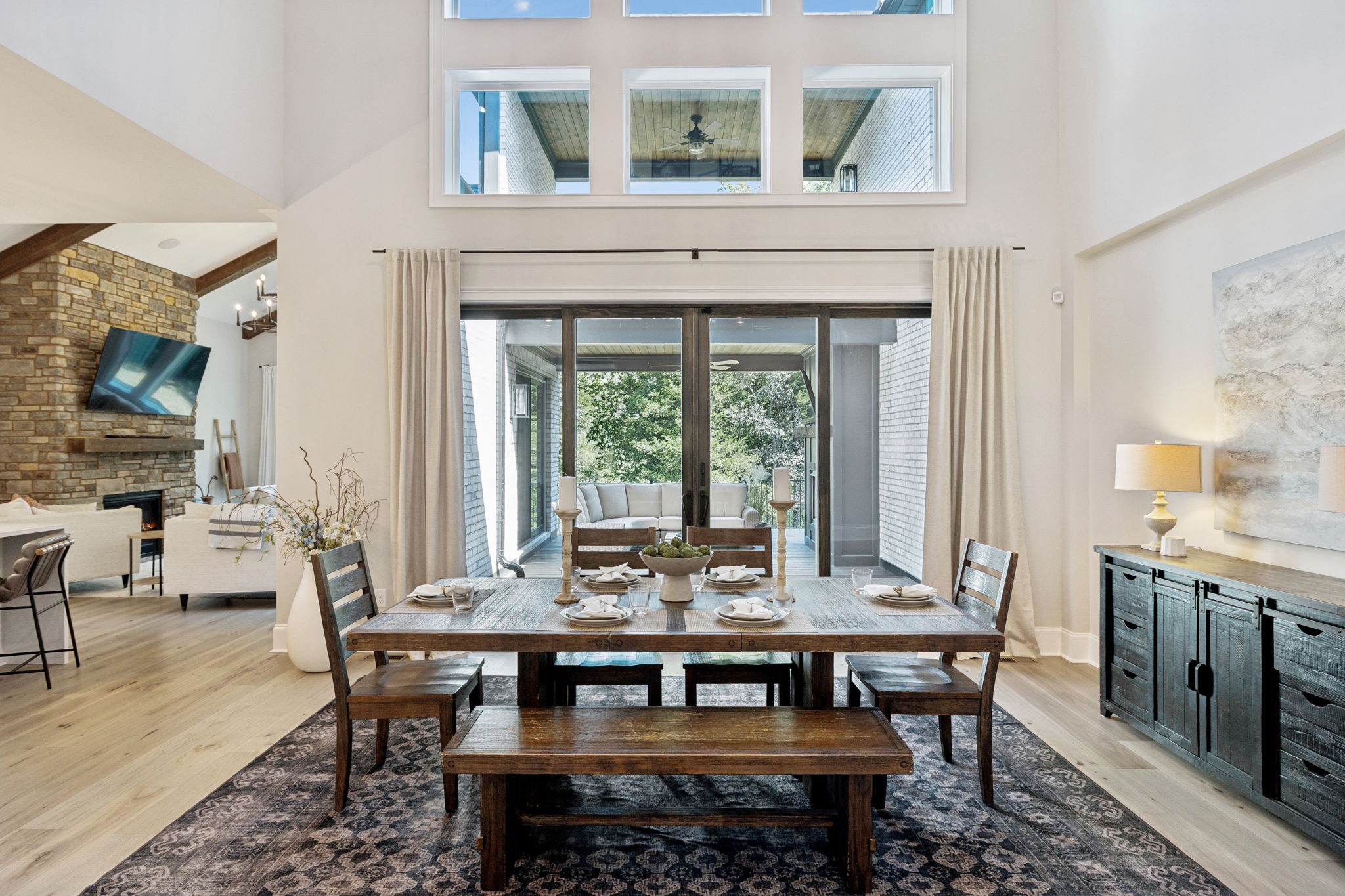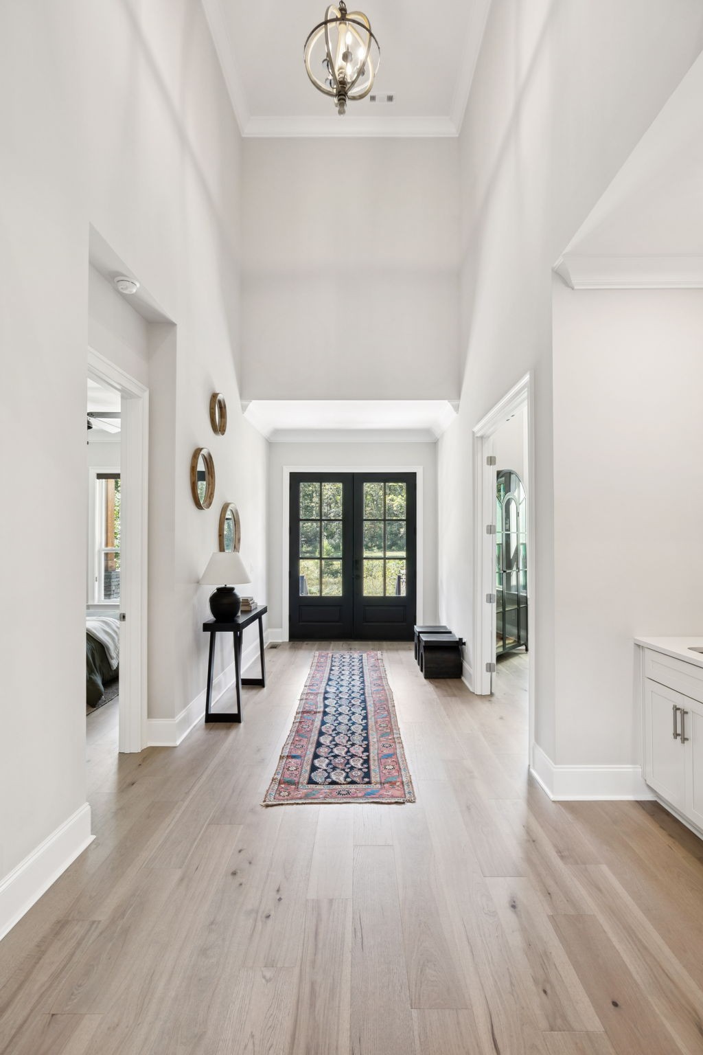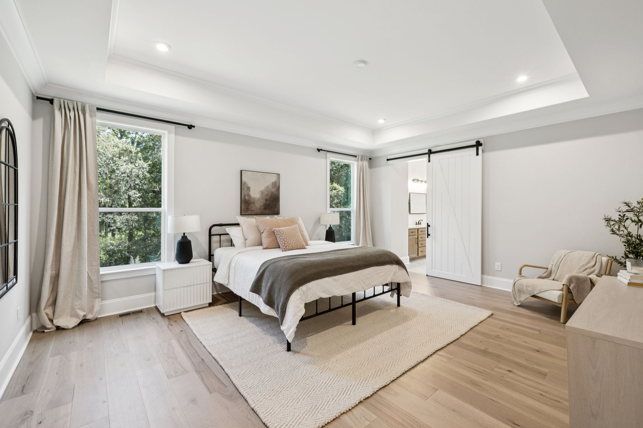 The main level offers a grand two-story foyer and dining room, an inviting office with glass French doors, and a seamless flow between the living room and chef’s kitchen. Custom cabinetry, coffered wood-detailed ceilings, and wide-plank hardwood floors highlight the attention to detail. The spacious walk-in pantry, mudroom, and oversized laundry are designed with everyday convenience in mind.