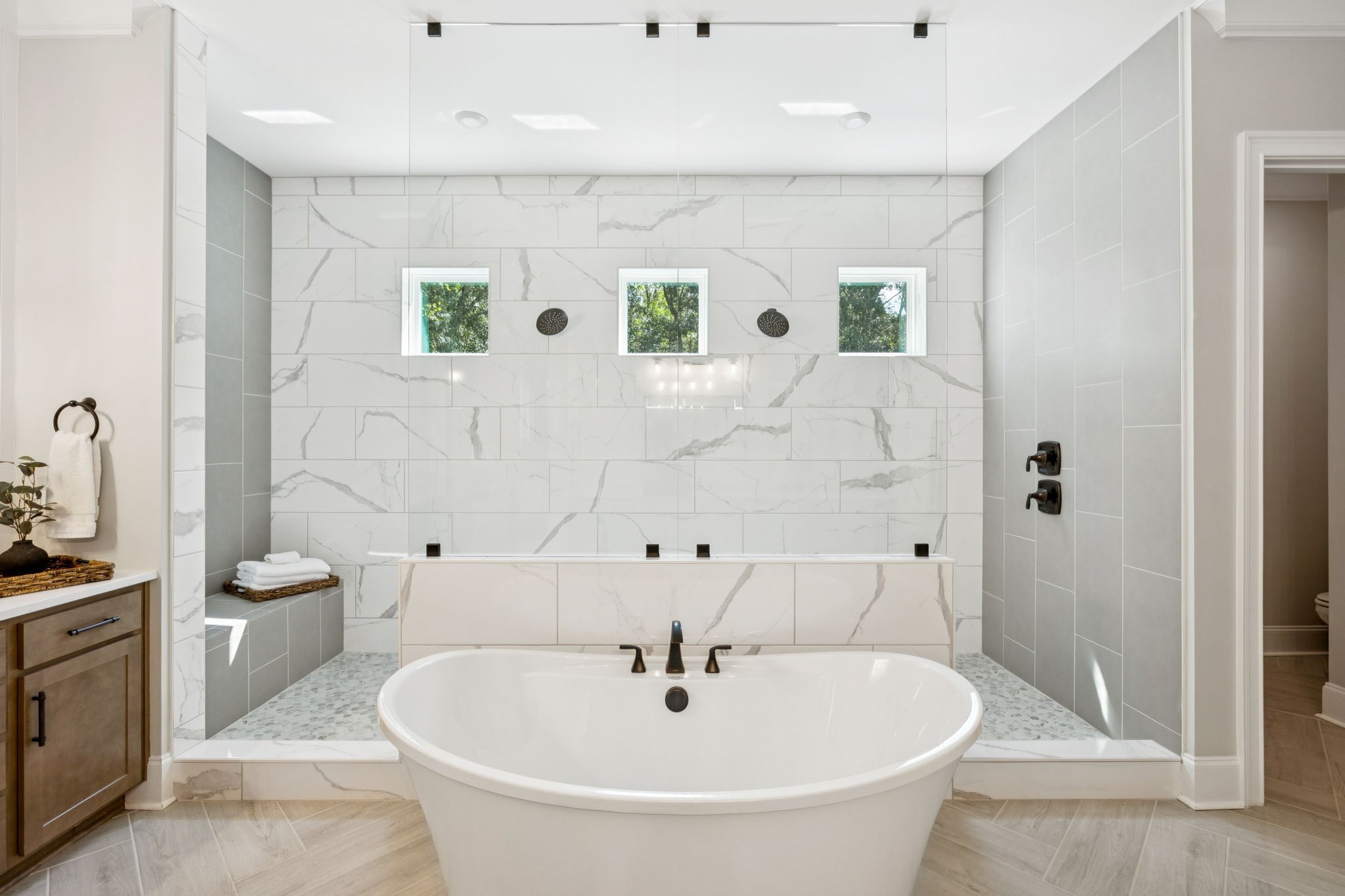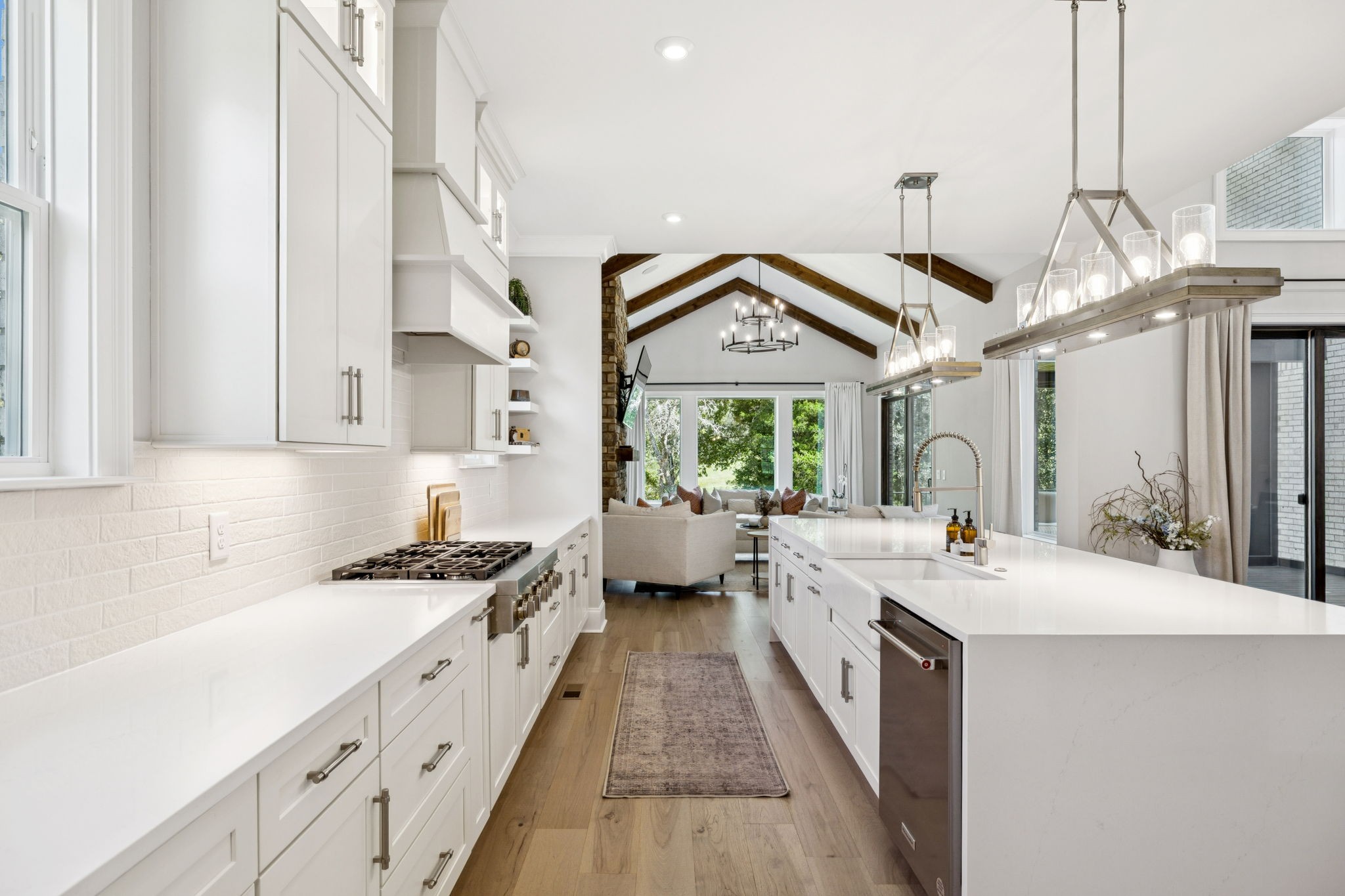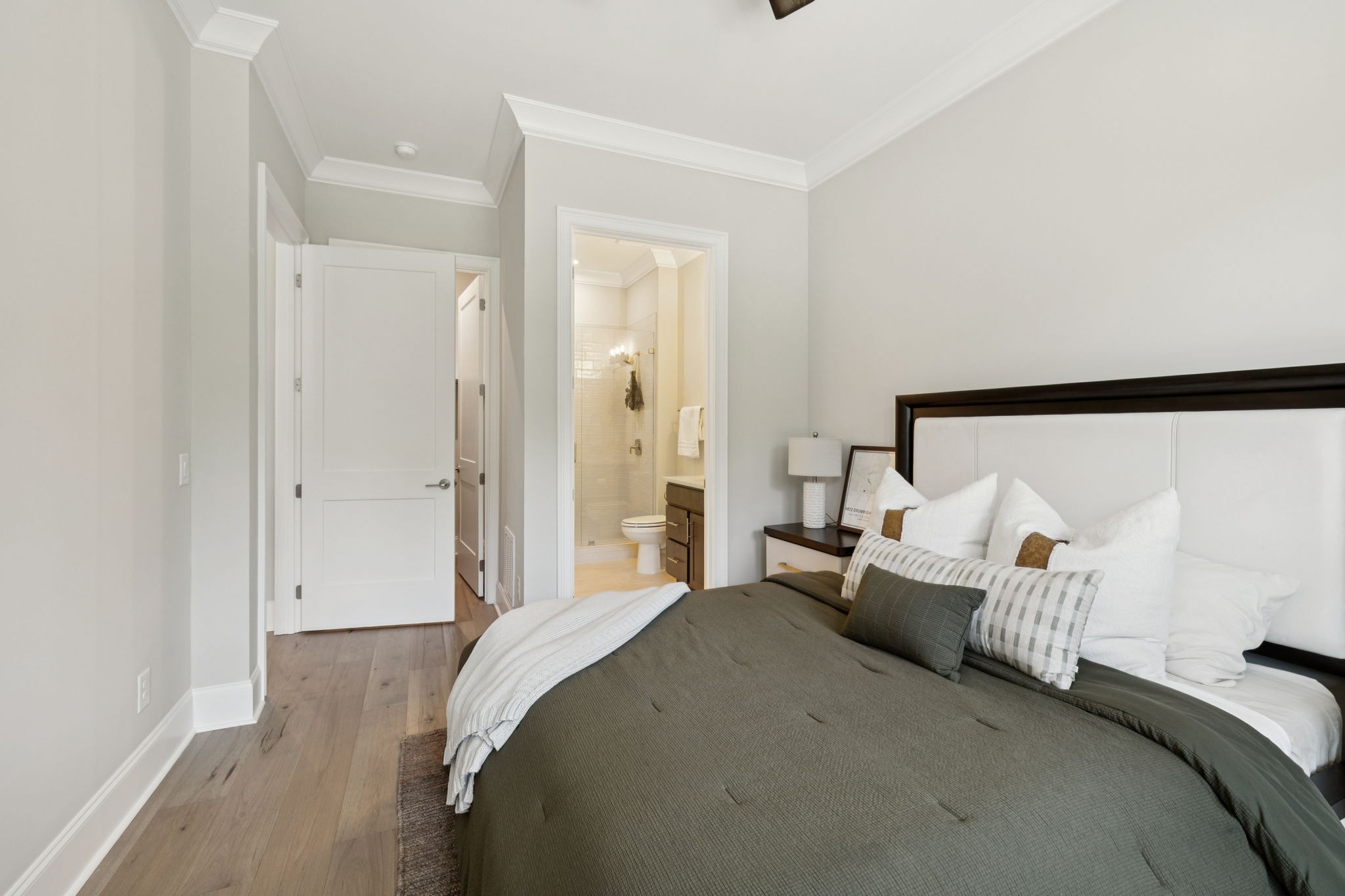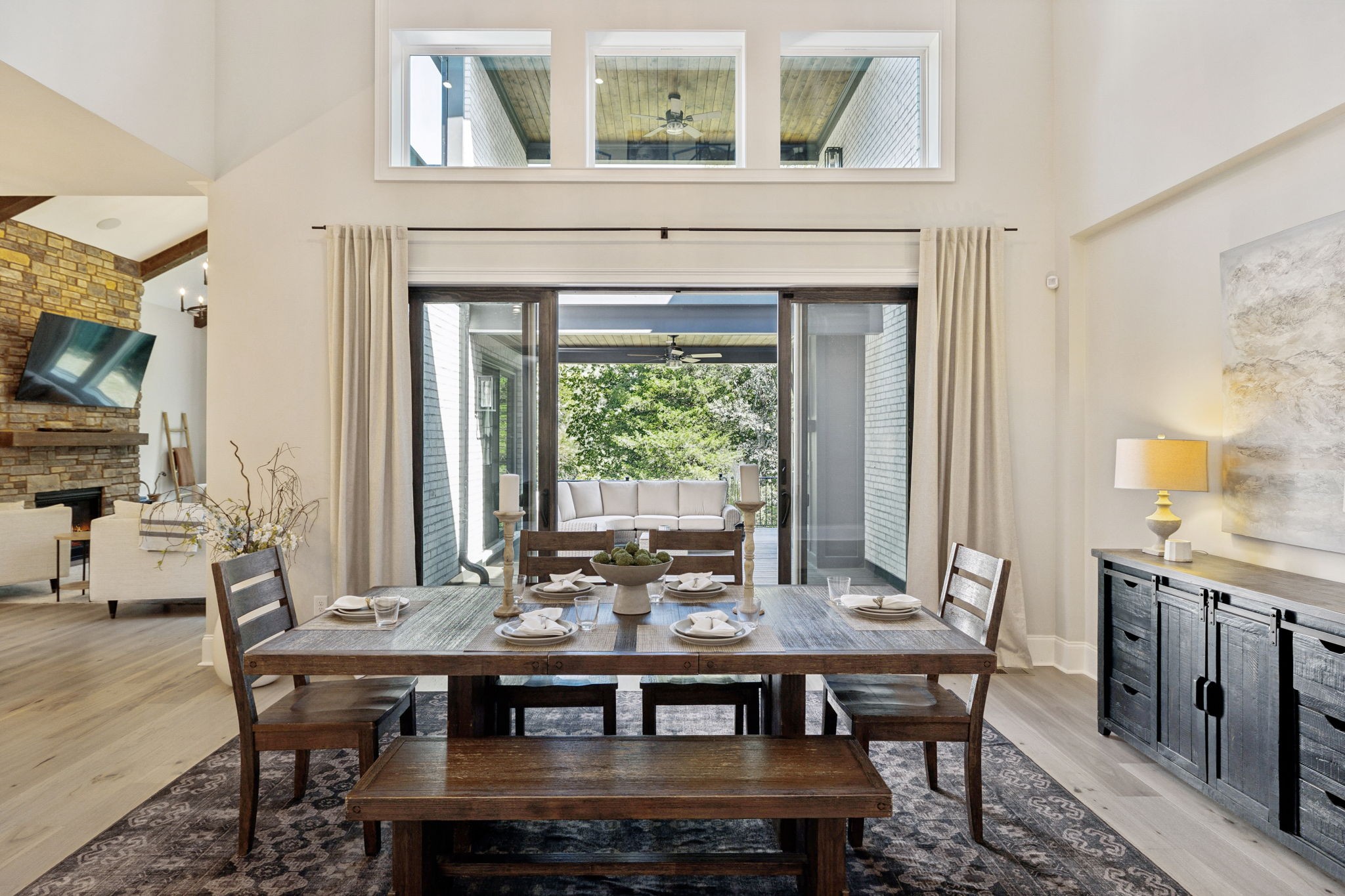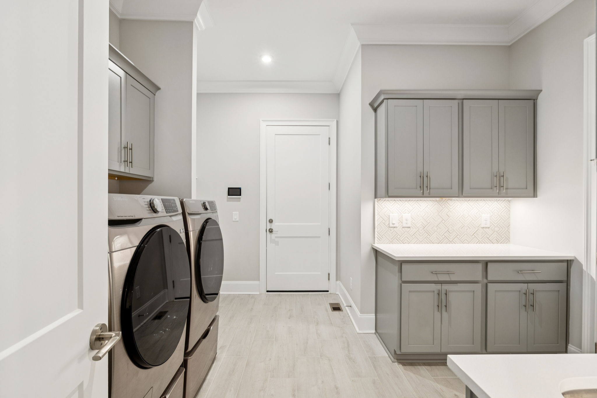 The main level offers a grand two-story foyer and dining room, an inviting office with glass French doors, and a seamless flow between the living room and chef’s kitchen. Custom cabinetry, coffered wood-detailed ceilings, and wide-plank hardwood floors highlight the attention to detail. The spacious walk-in pantry, mudroom, and oversized laundry are designed with everyday convenience in mind.