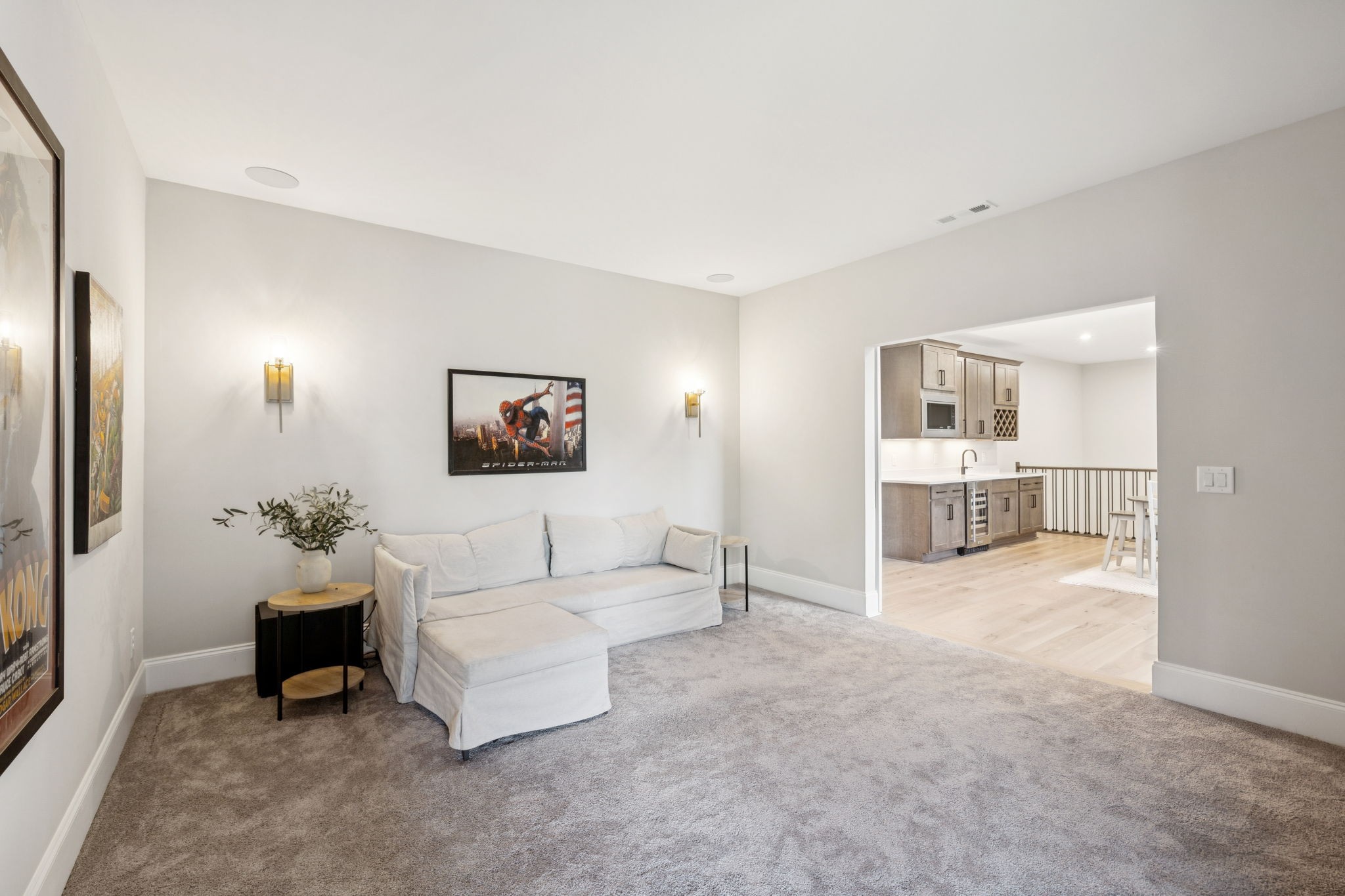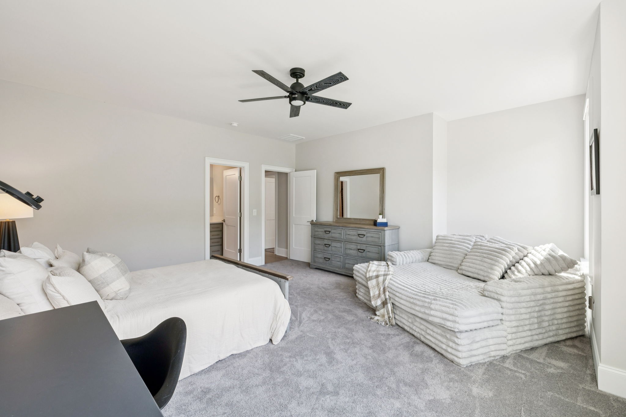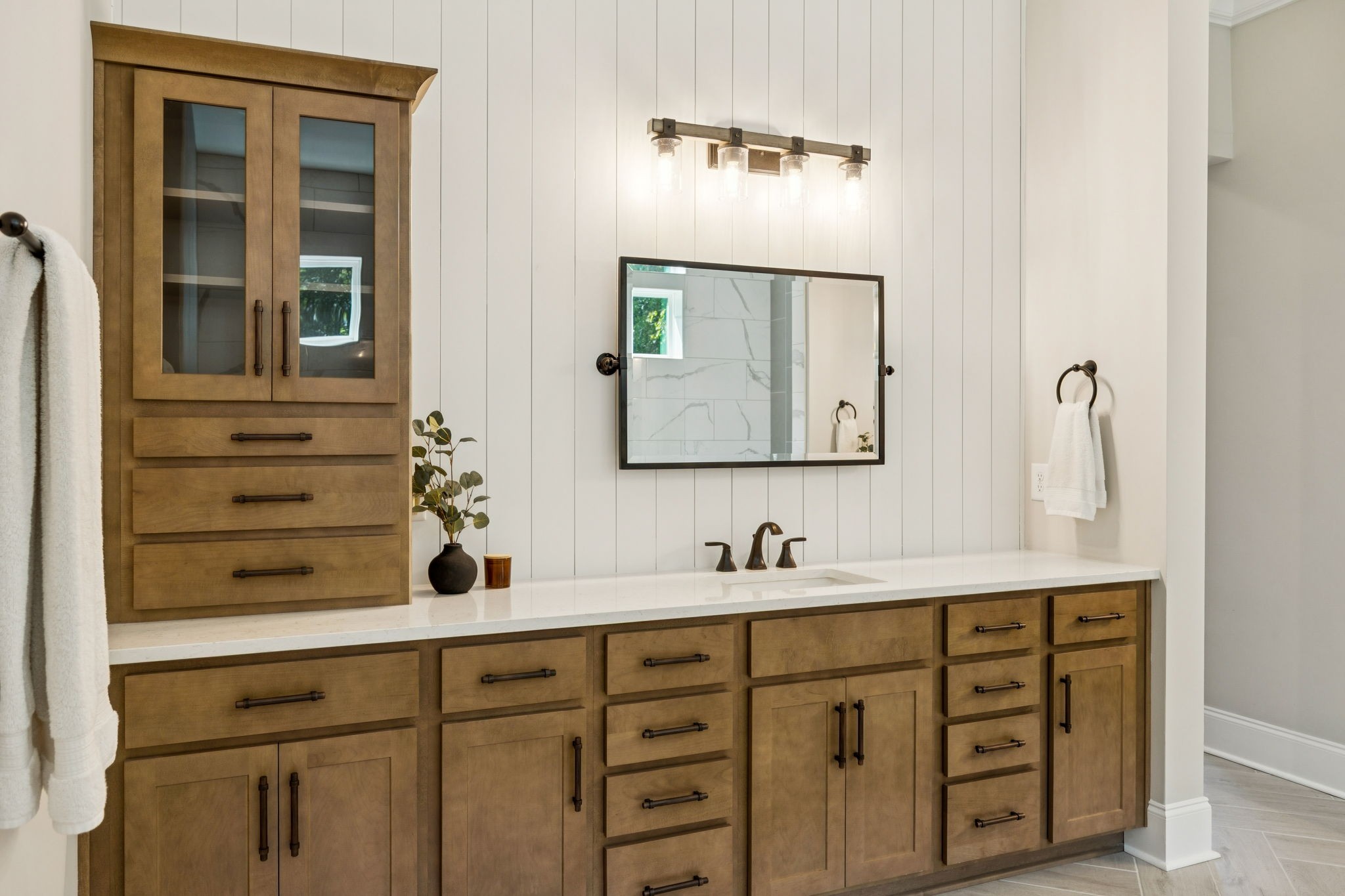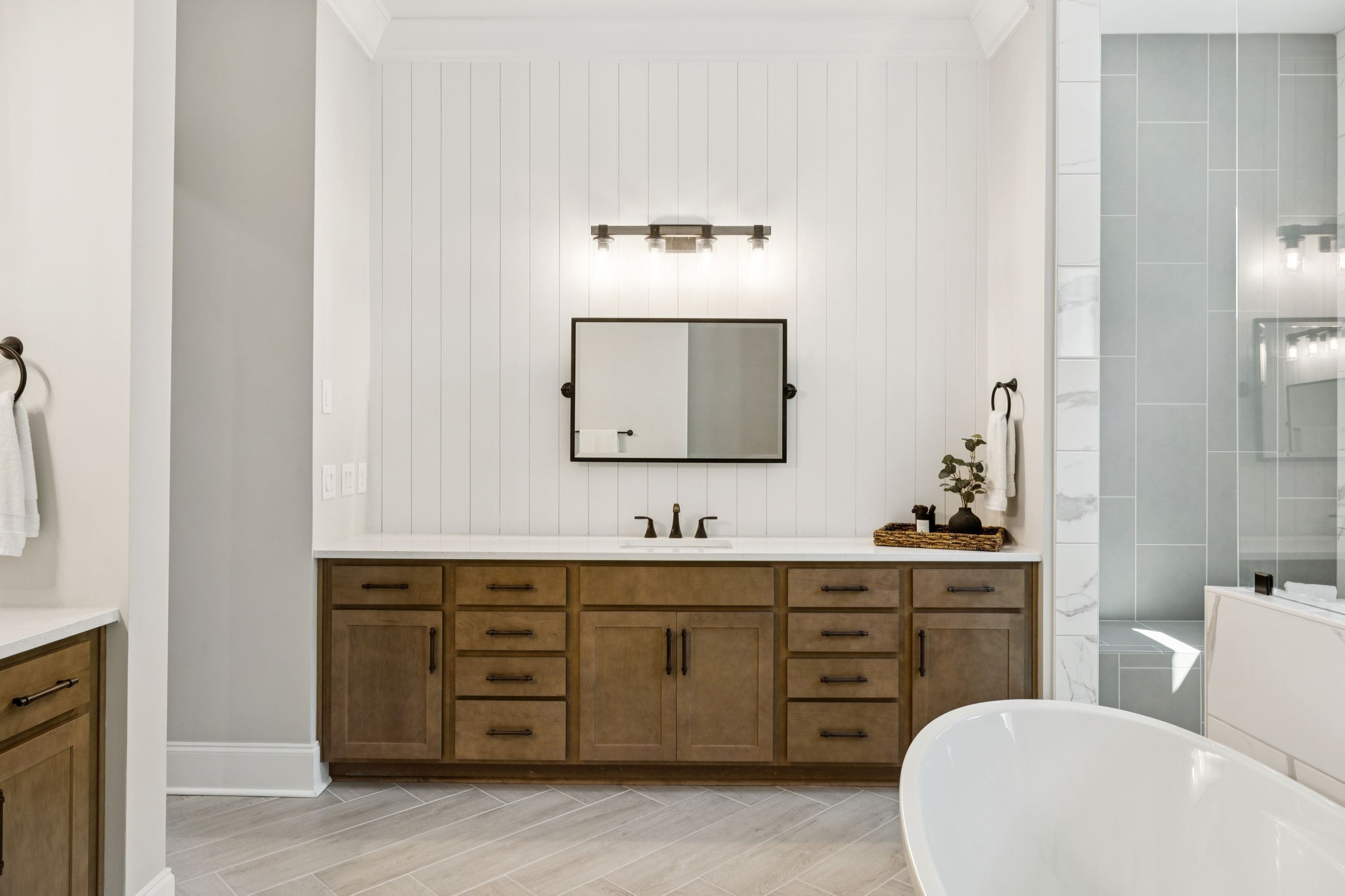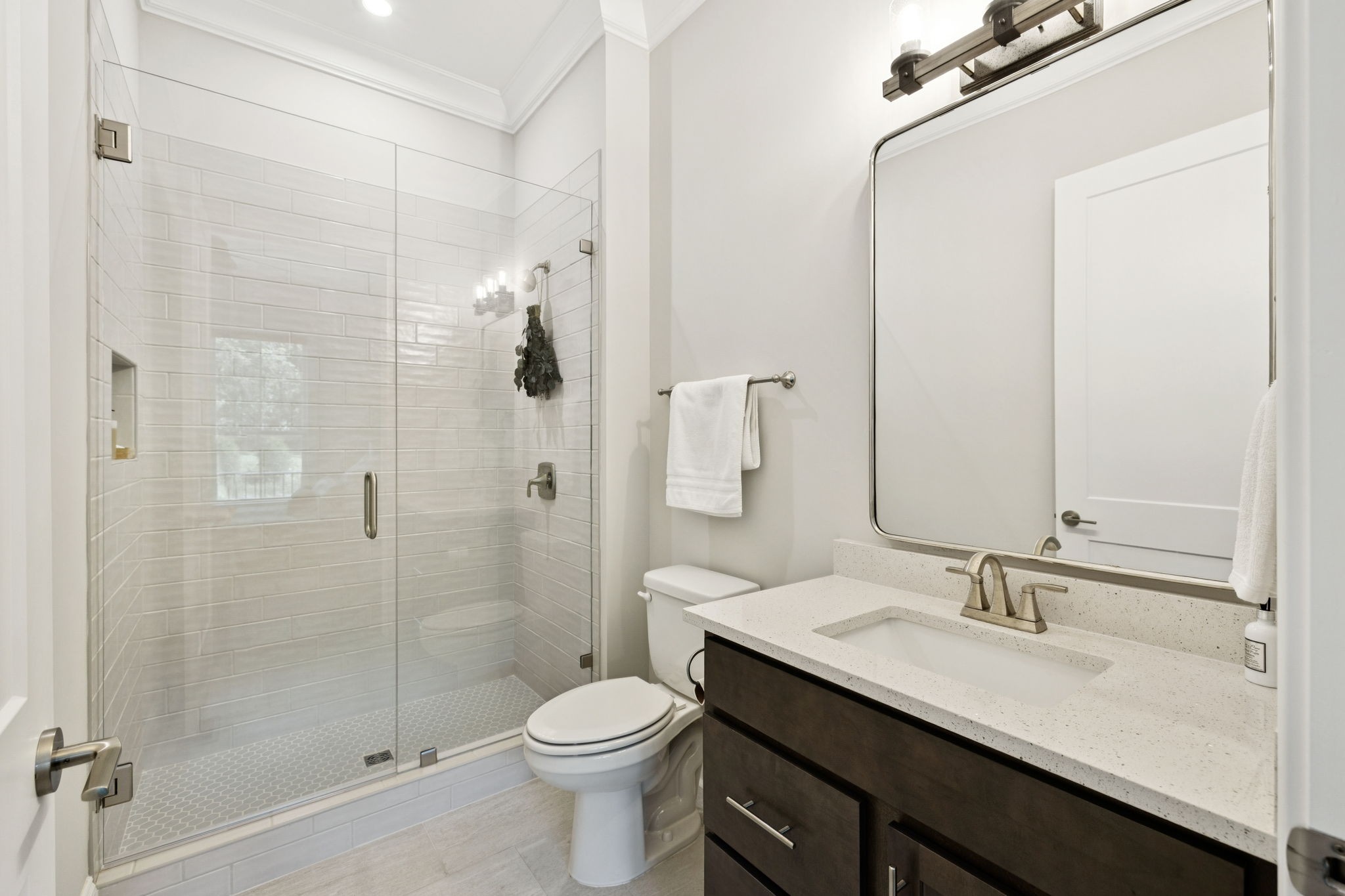The main level offers a grand two-story foyer and dining room, an inviting office with glass French doors, and a seamless flow between the living room and chef’s kitchen. Custom cabinetry, coffered wood-detailed ceilings, and wide-plank hardwood floors highlight the attention to detail. The spacious walk-in pantry, mudroom, and oversized laundry are designed with everyday convenience in mind.