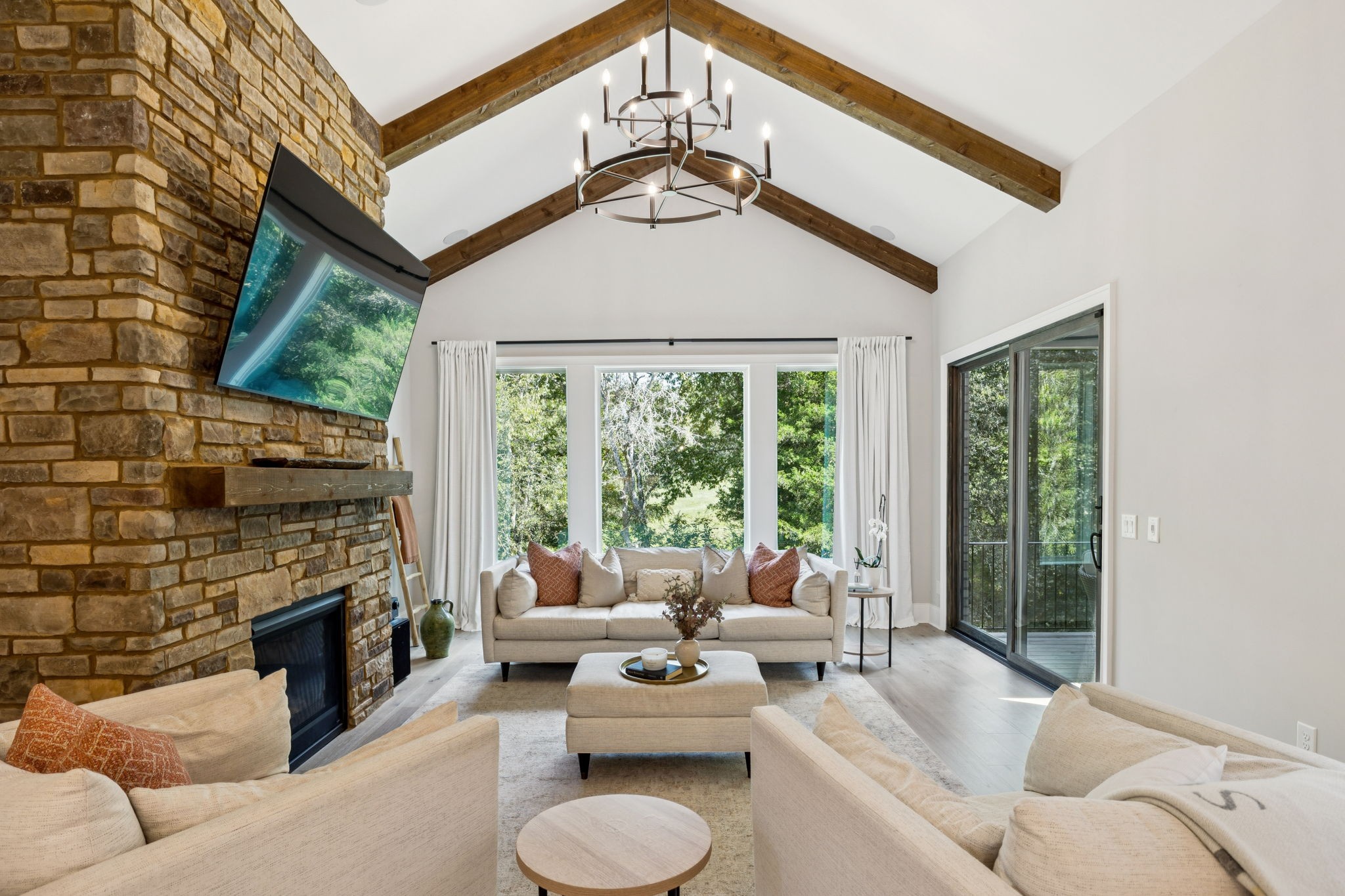 Outdoor living abounds with four distinct spaces: a welcoming front porch, a covered back deck with fireplace, a basement-level patio, and a private covered deck off the media room. Enjoy the privacy and peacefulness of this country living, minutes from the charming College Grove square and Award winning Williamson County schools. The home appraised in August 2025 at $3,122,000.