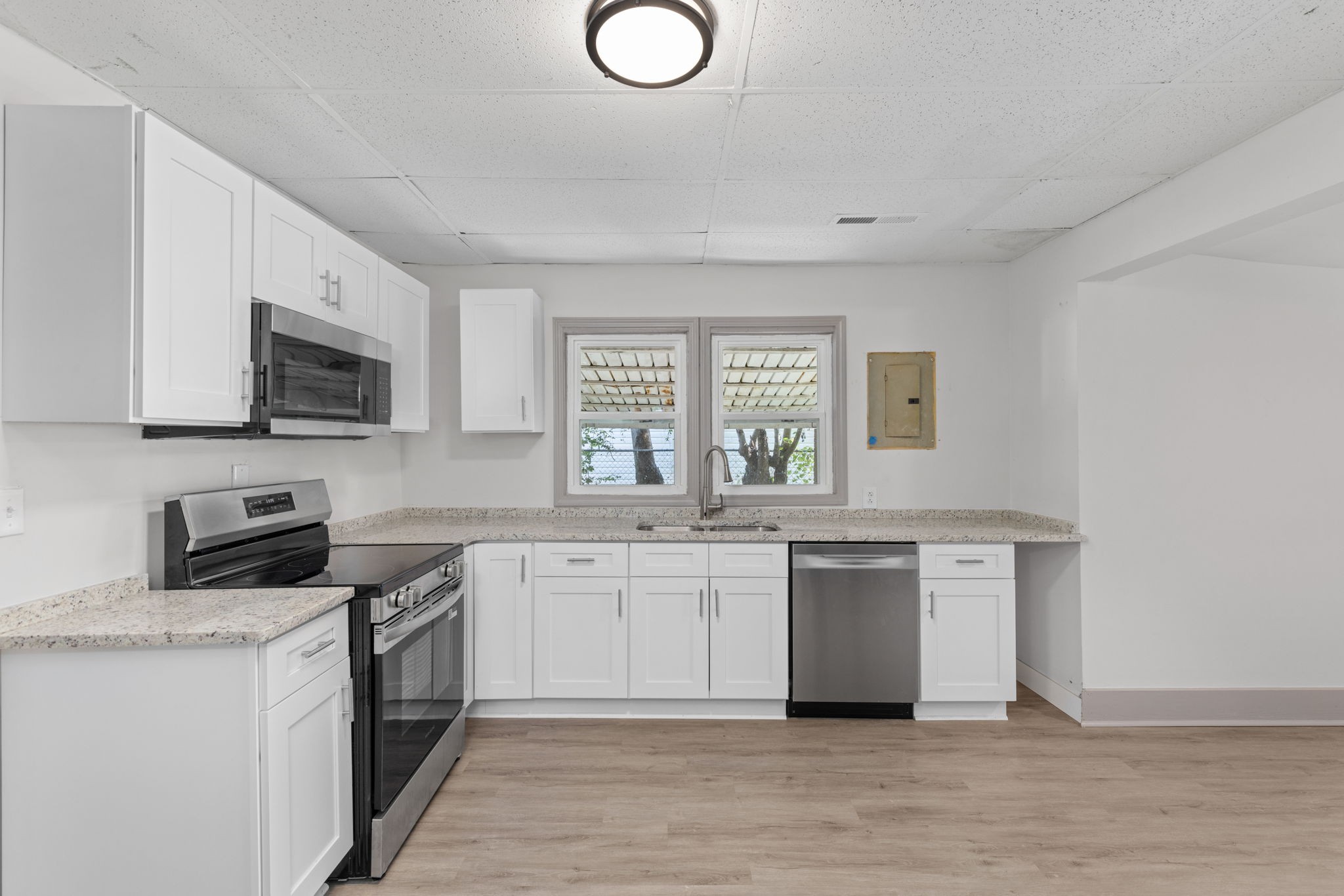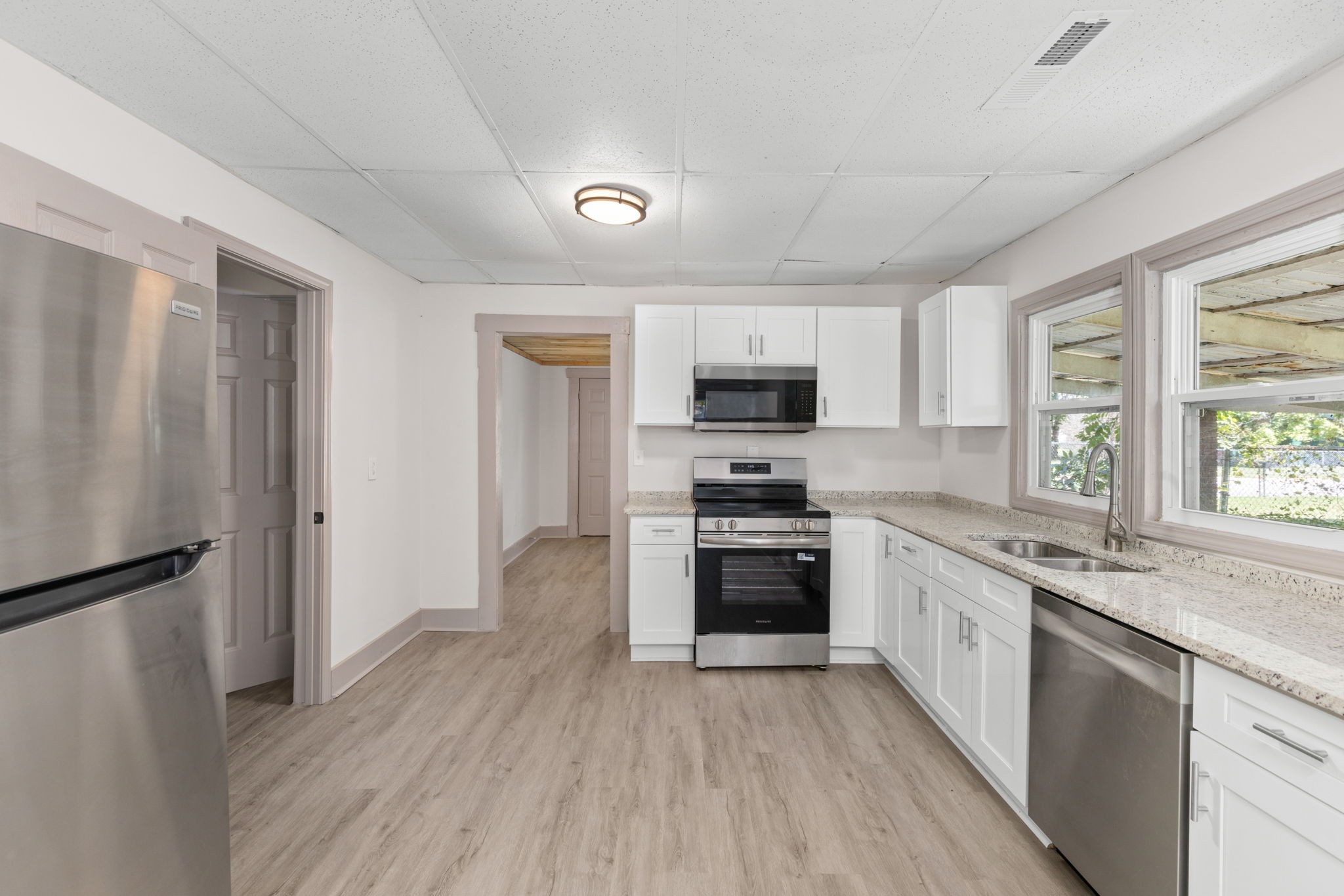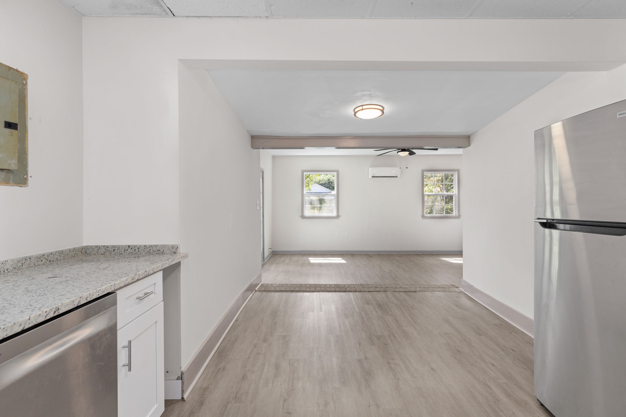 Step inside to a welcoming living room that opens into the kitchen and dining area, creating a warm and inviting flow. The kitchen is a highlight, featuring new cabinetry, sleek countertops, and stainless-steel appliances, including a range, microwave, and dishwasher. Large windows allow plenty of natural light, making the space feel bright and airy.