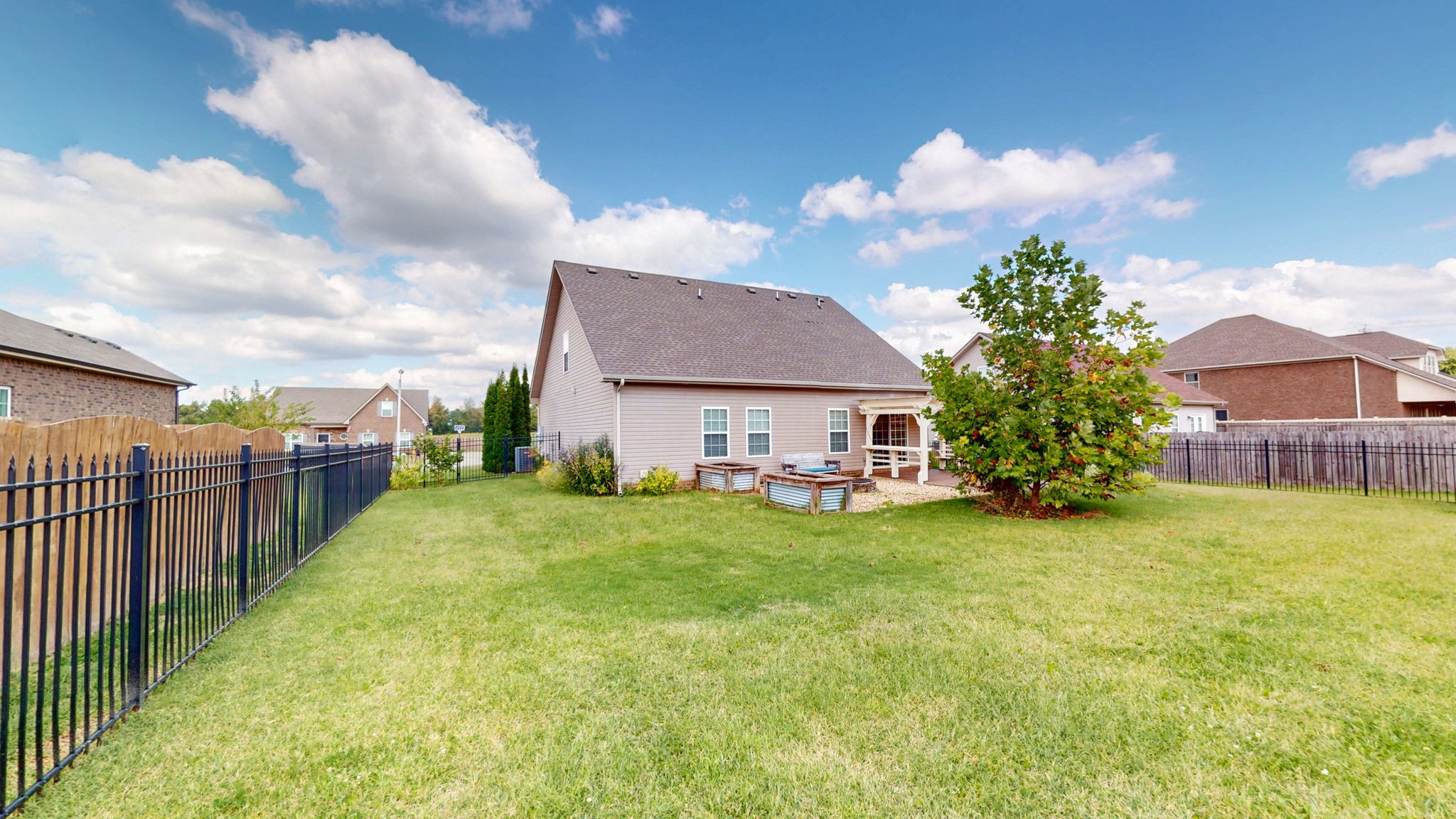 Step outside to your private backyard retreat, where a covered patio and pergola create the perfect setting for outdoor dining, relaxation, or hosting gatherings.